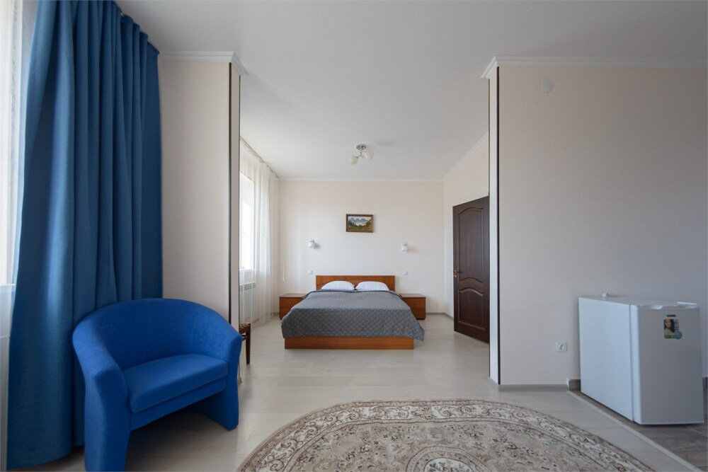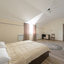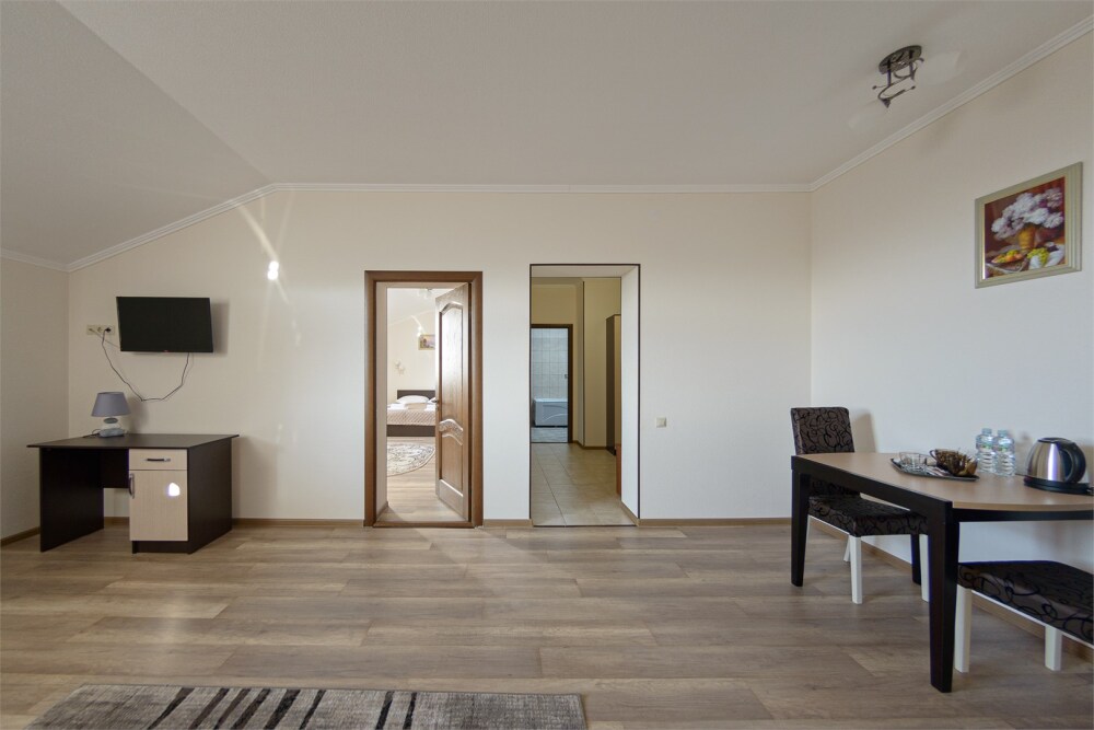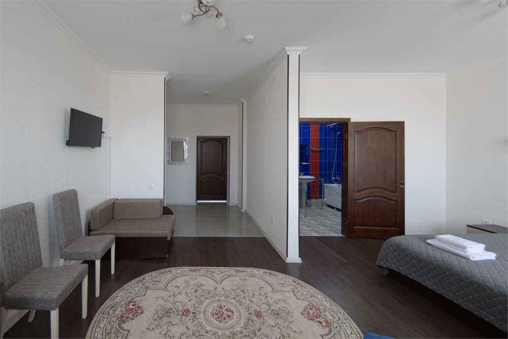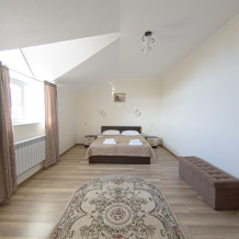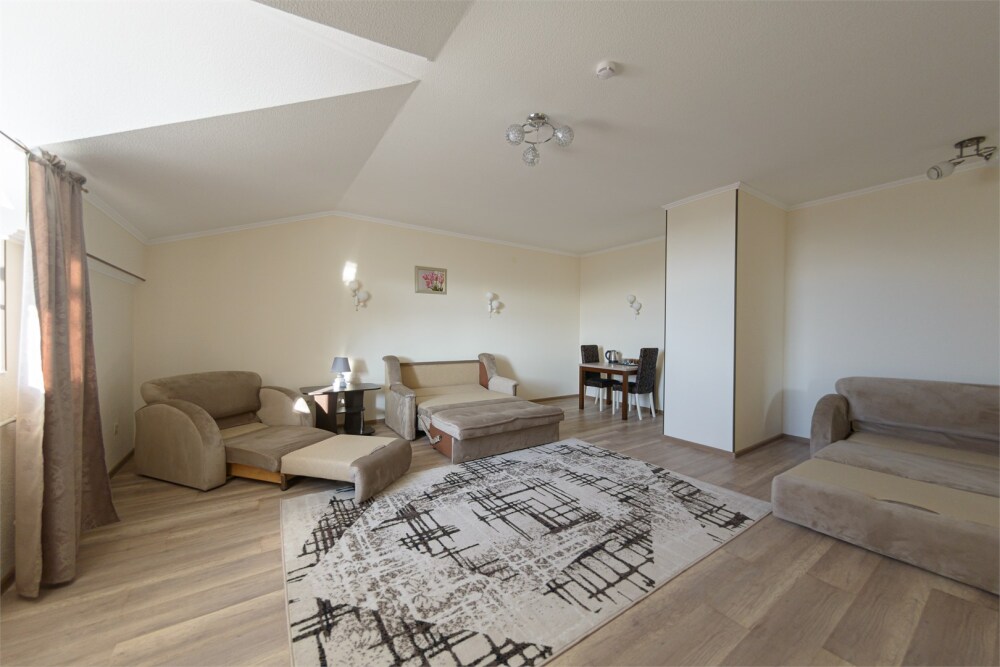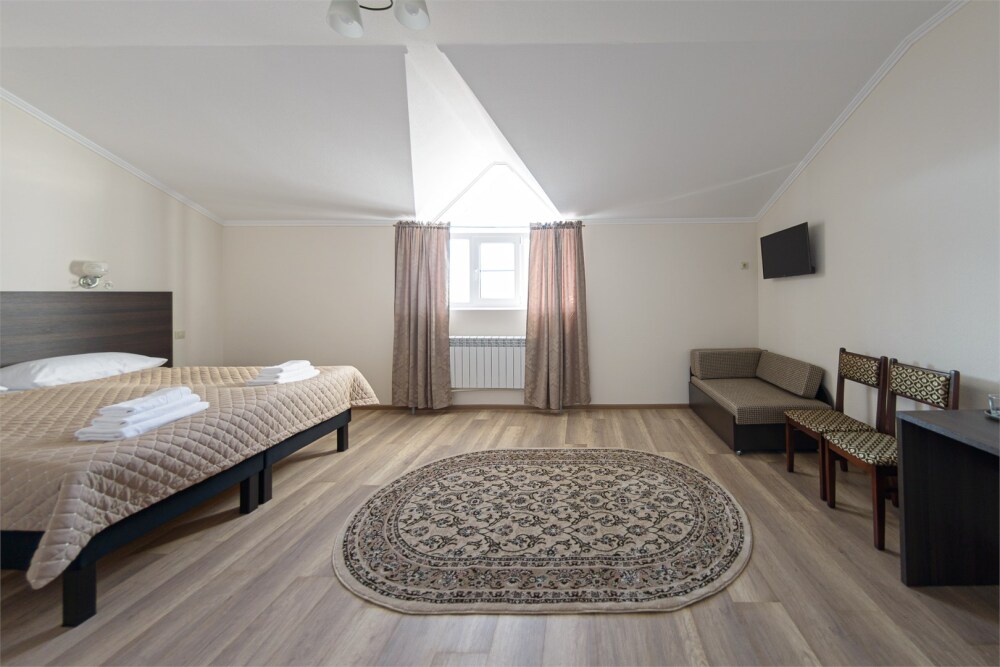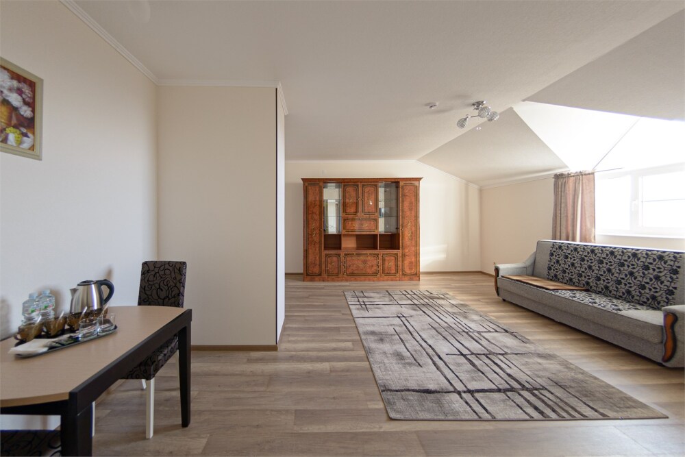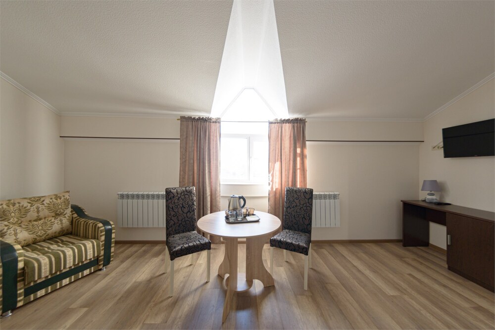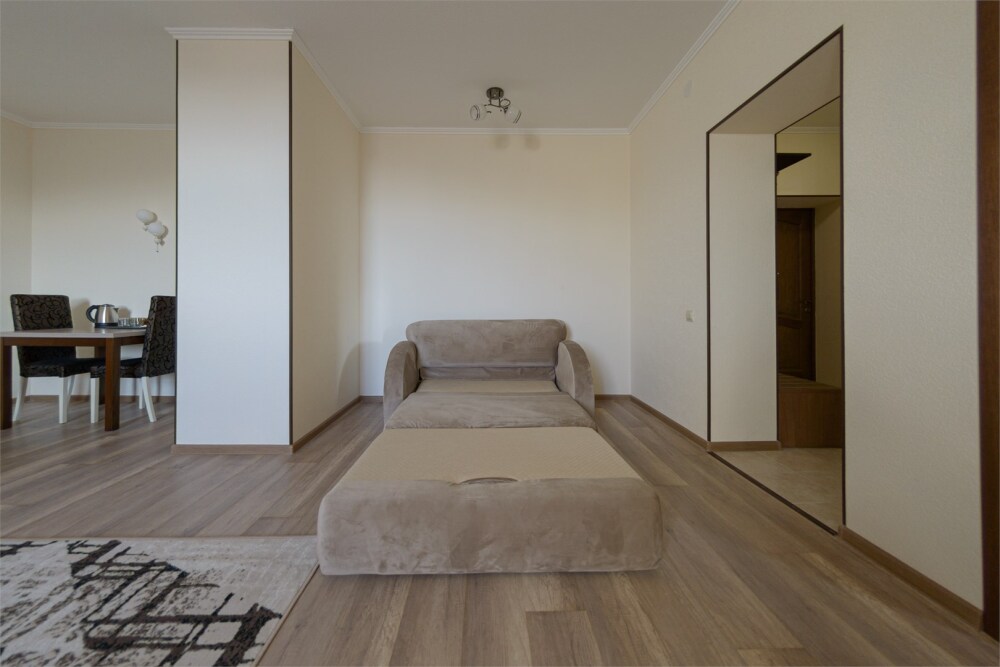 Просторный номер из двух комнат c большой ванной комнатой, располагающий к отдыху интерьер, большая кровать, два кресла-кровати и диван-кровать. Для Вашего комфорта предусмотрена дополнительная мебель: небольшой столик и стулья для Вашего уюта, сюда будет приятно возвращаться после прогулок.