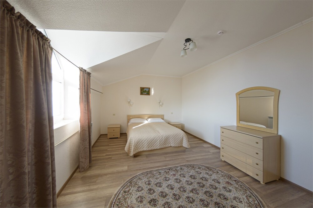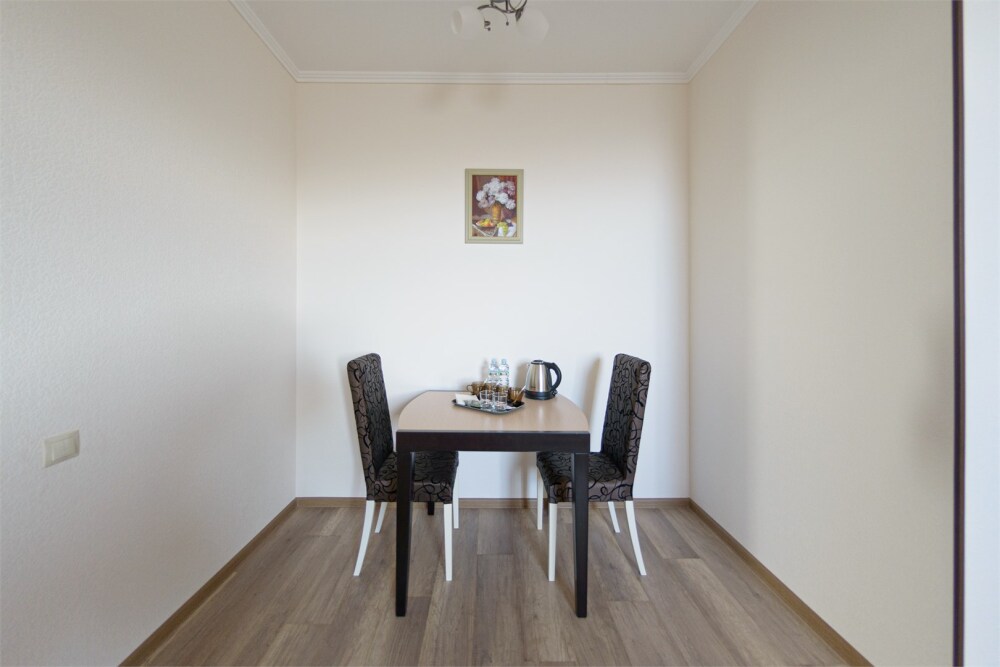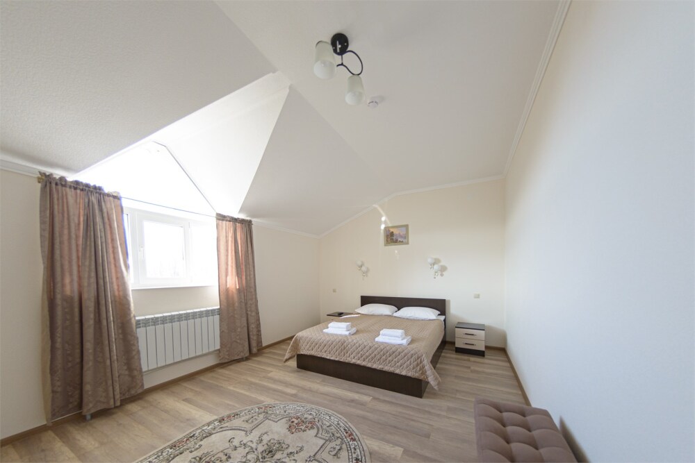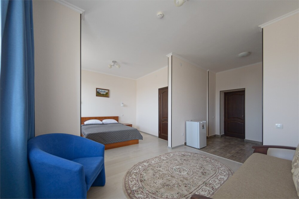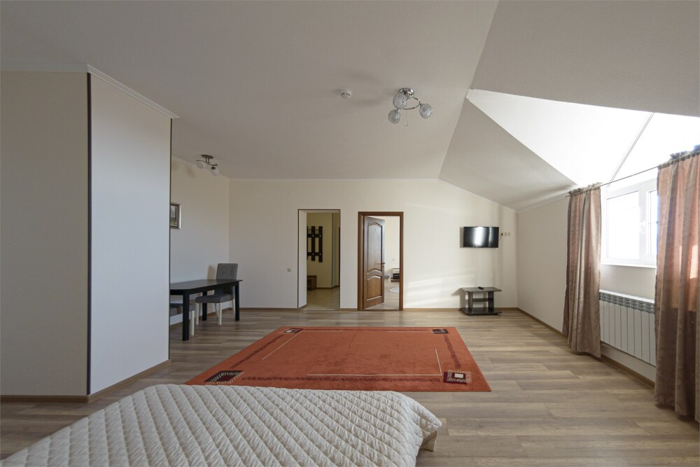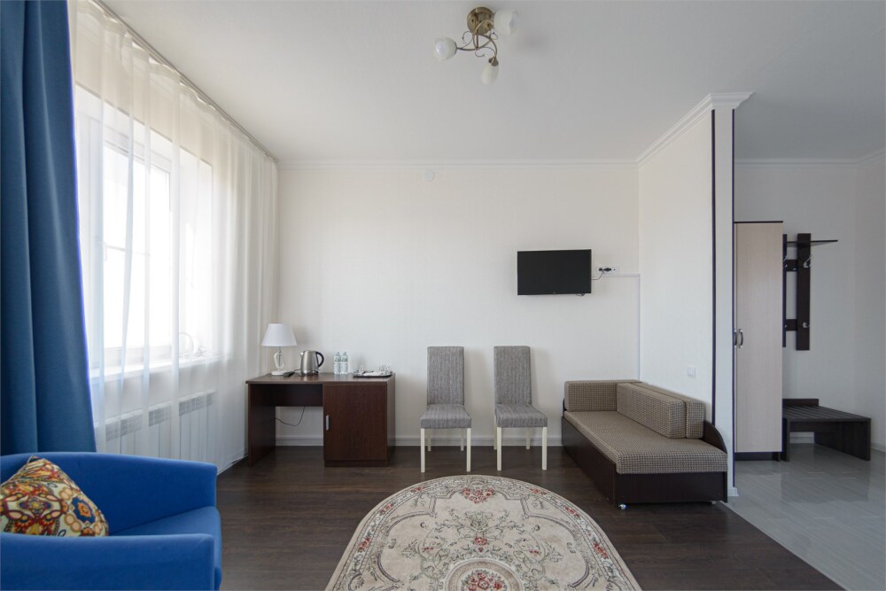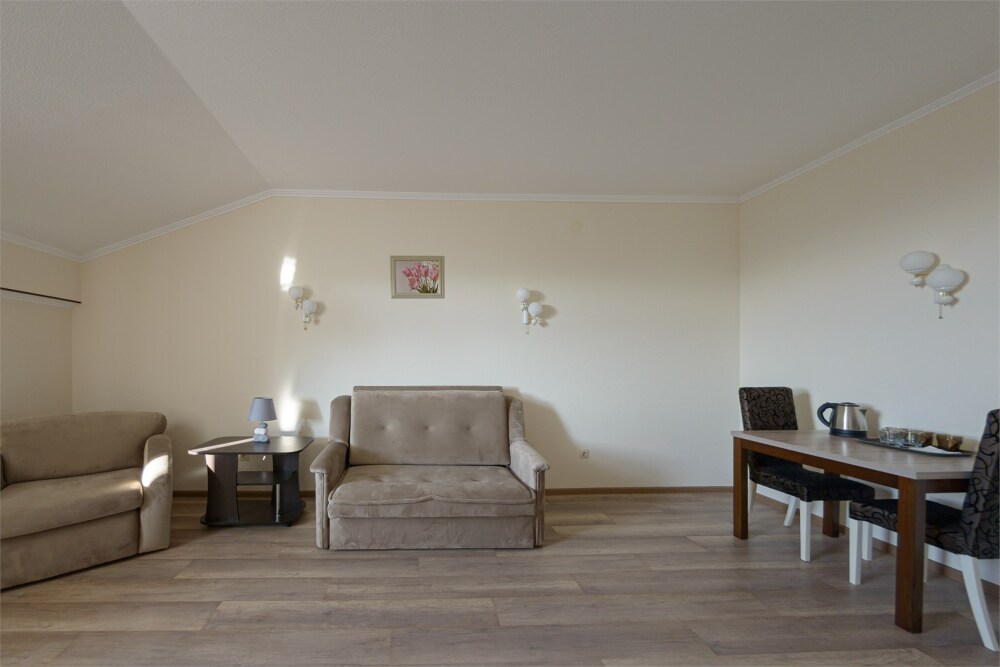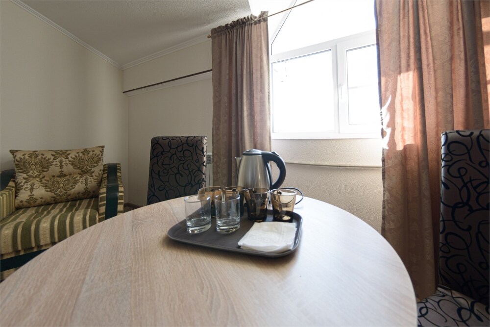 Просторный номер из двух комнат c большой ванной комнатой, располагающий к отдыху интерьер, большая кровать, два кресла-кровати и диван-кровать. Для Вашего комфорта предусмотрена дополнительная мебель: небольшой столик и стулья для Вашего уюта, сюда будет приятно возвращаться после прогулок.