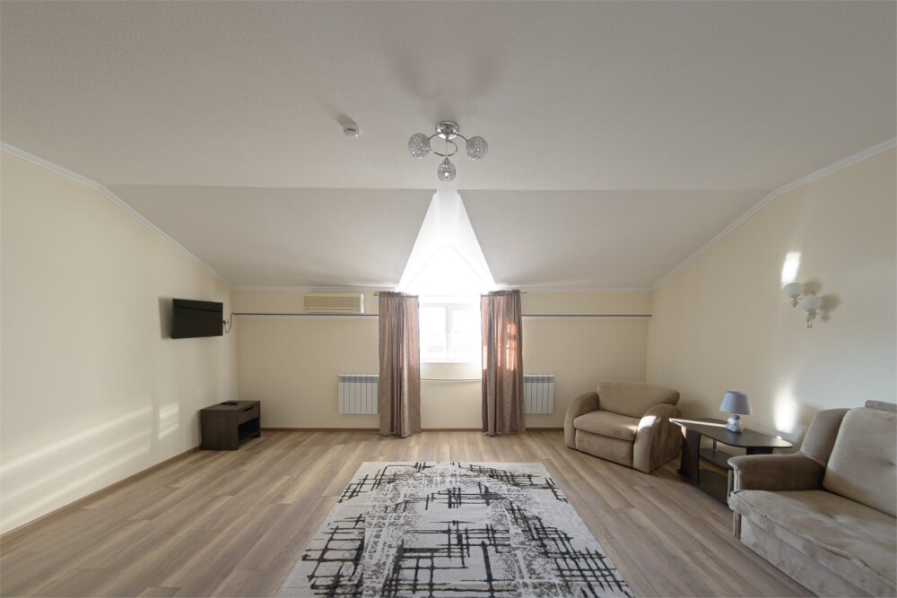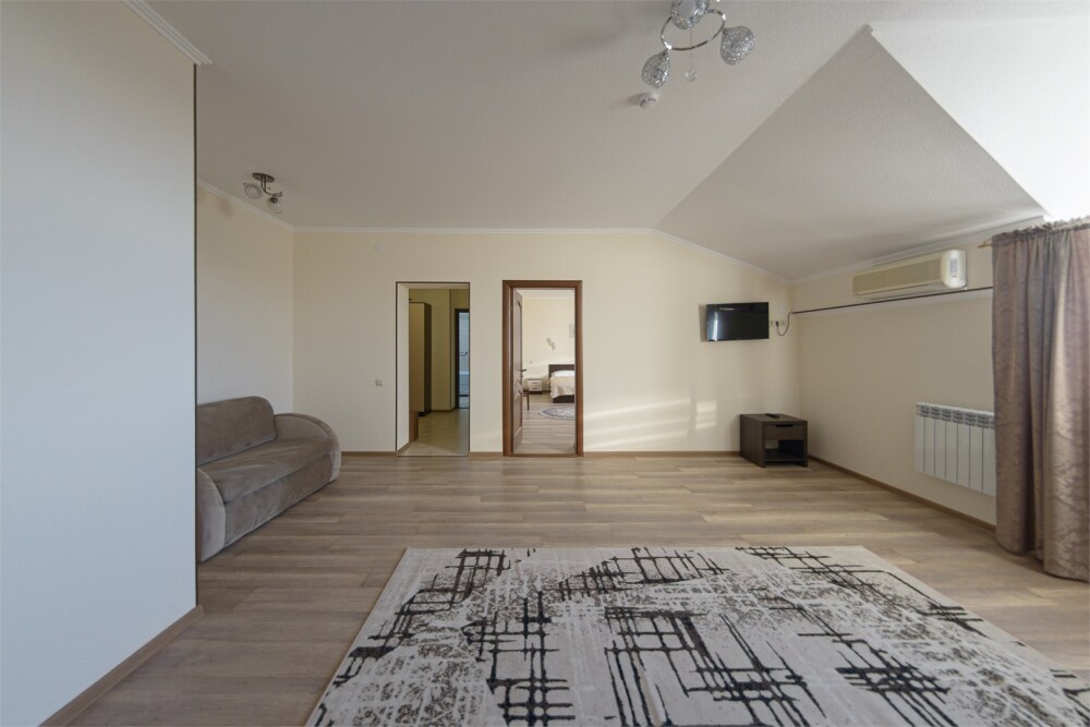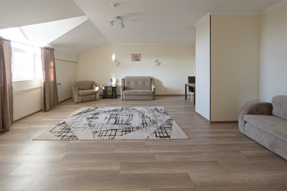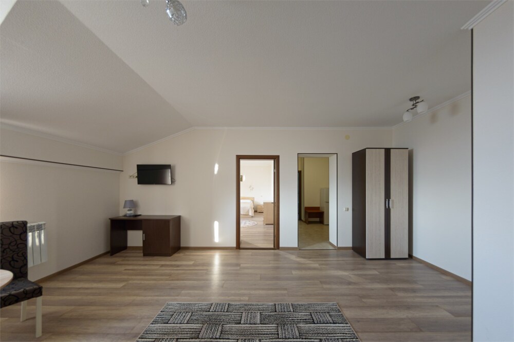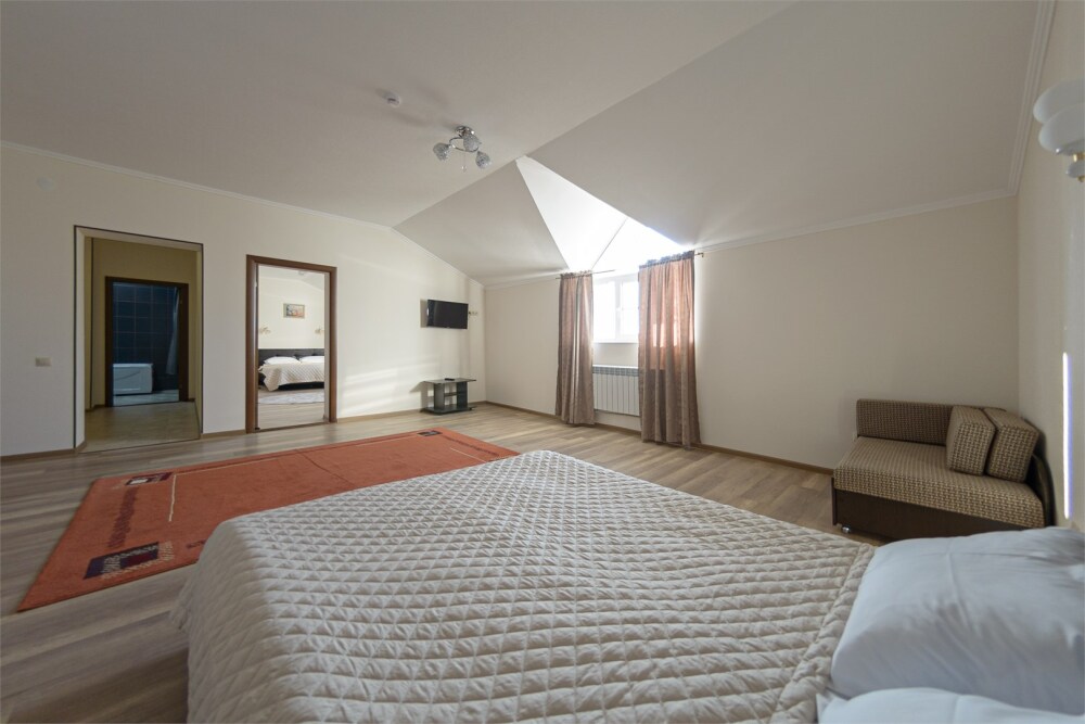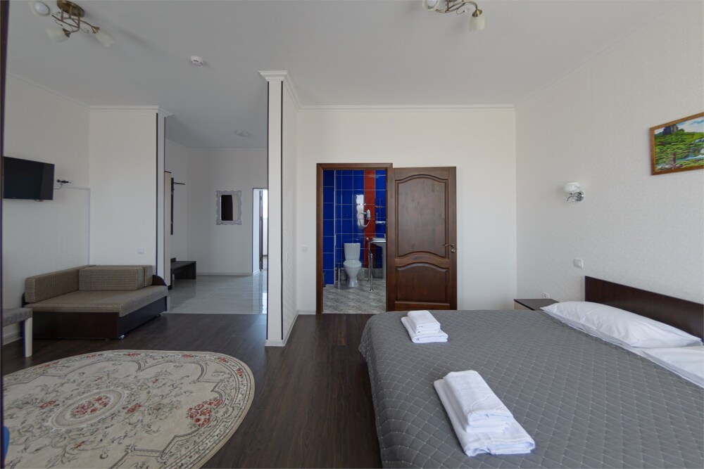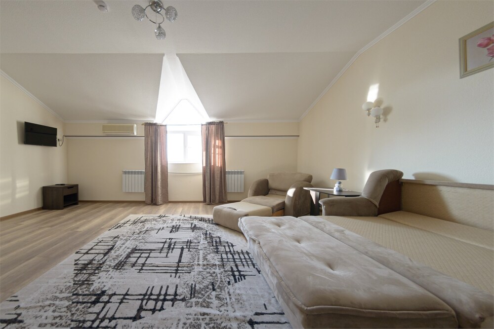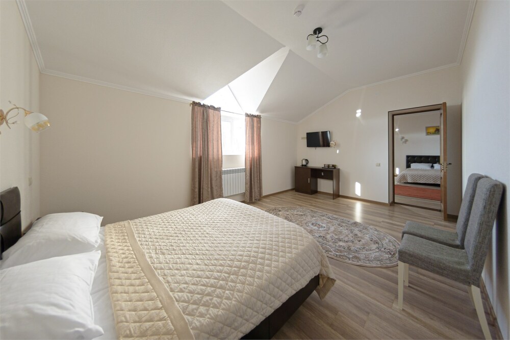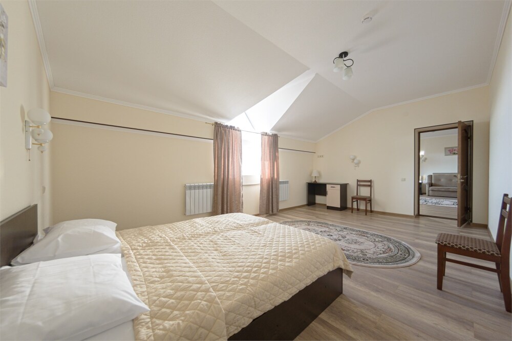 Просторный номер из двух комнат c большой ванной комнатой, располагающий к отдыху интерьер, большая кровать и диван-кровать. Для Вашего комфорта предусмотрена дополнительная мебель: два кресла-кровати, небольшой столик и стулья для Вашего уюта, сюда будет приятно возвращаться после прогулок.