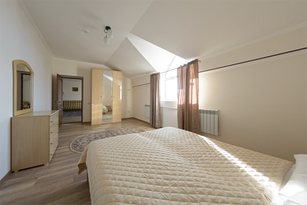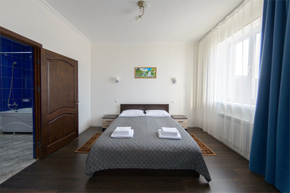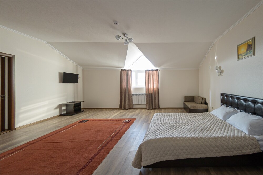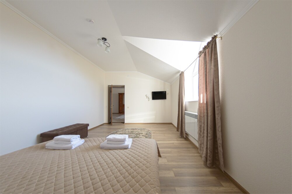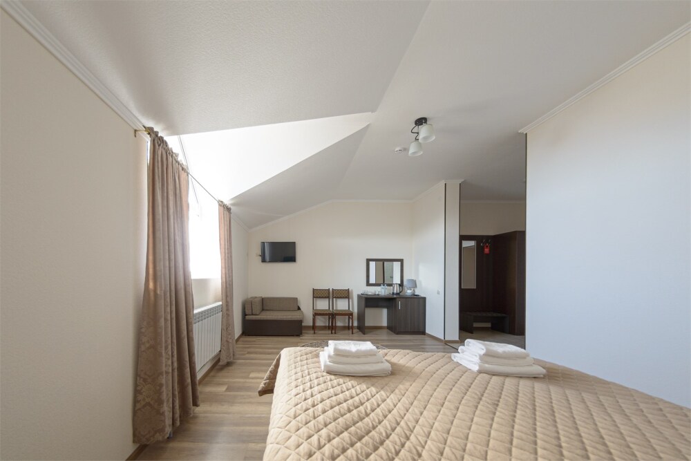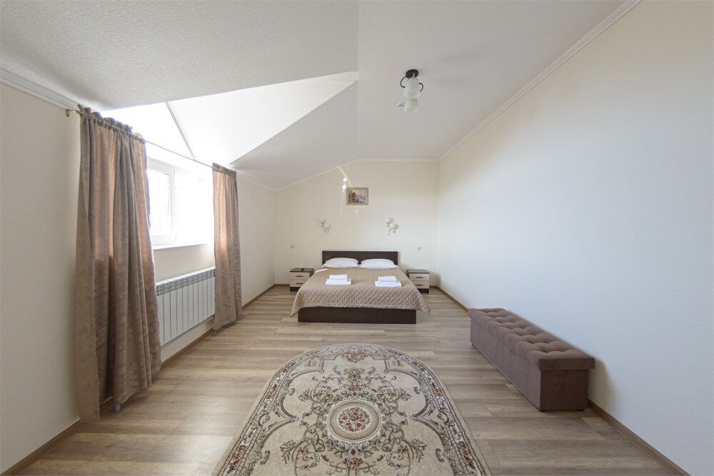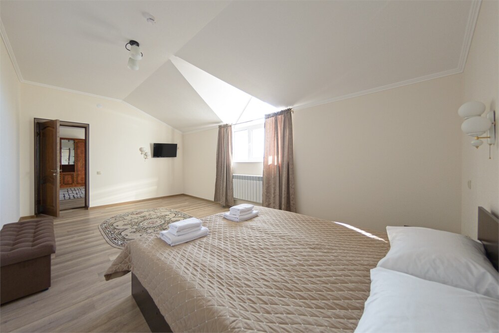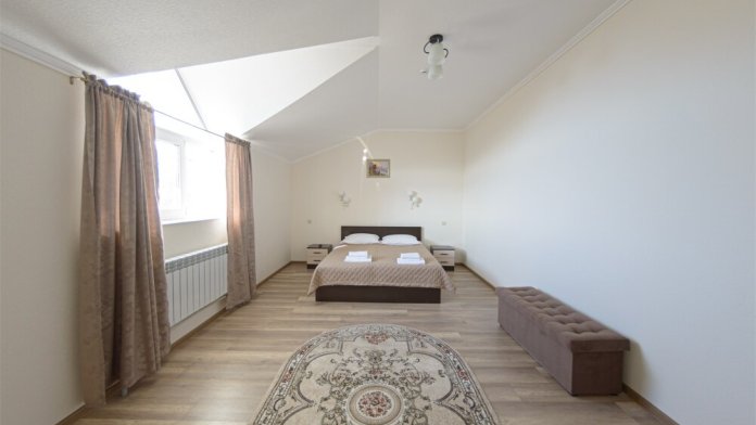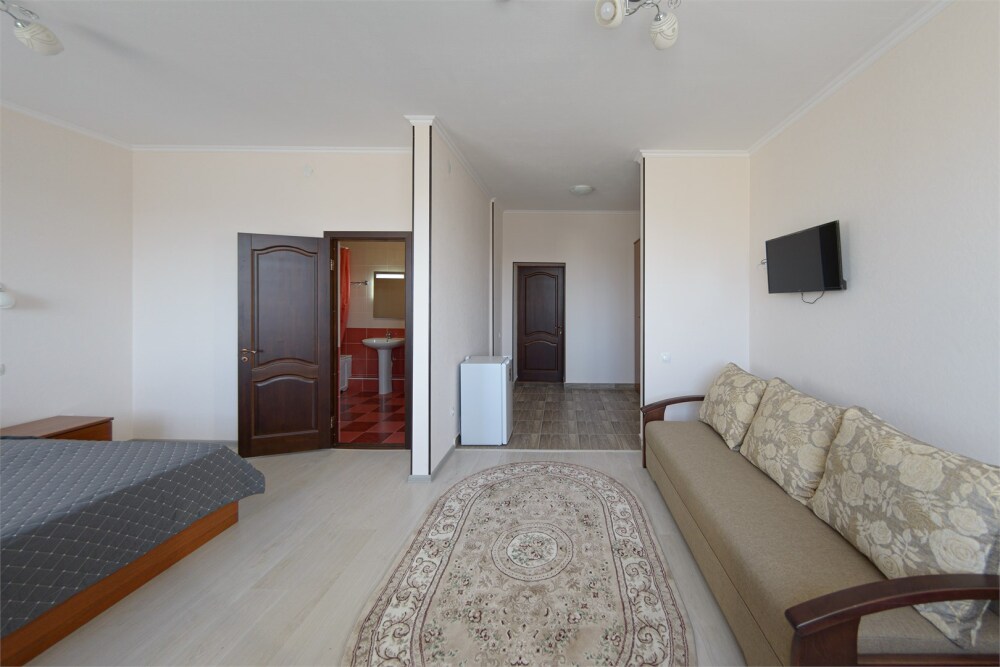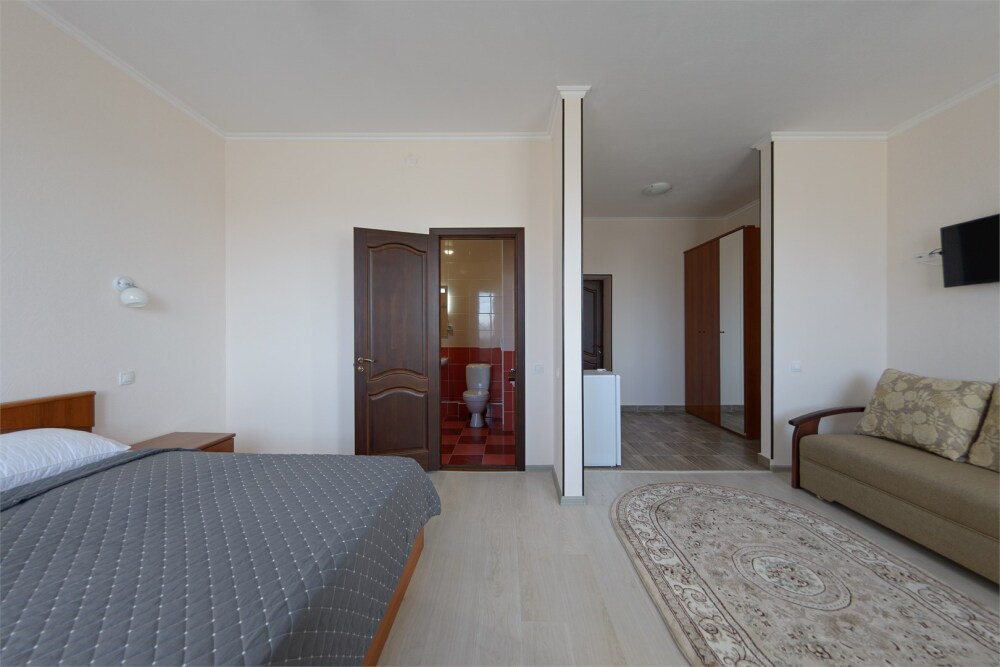 Просторный номер из двух комнат c большой ванной комнатой, располагающий к отдыху интерьер, большая кровать и диван-кровать. Для Вашего комфорта предусмотрена дополнительная мебель: два кресла-кровати, небольшой столик и стулья для Вашего уюта, сюда будет приятно возвращаться после прогулок.