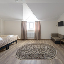 Просторный номер из двух комнат c большой ванной комнатой, располагающий к отдыху интерьер, две большие кровати и диван-кровать. Для Вашего комфорта в данной категории номера предусмотрено два телевизора - сюда так приятно возвращаться после прогулок.