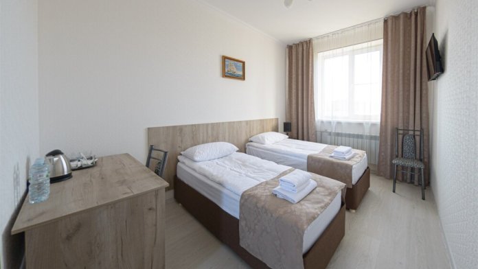 Двухместный номер, оснащенный гостиничной мебелью (две односпальные кровати и диван).