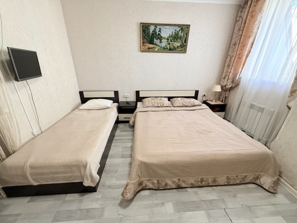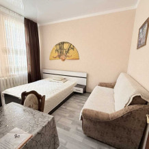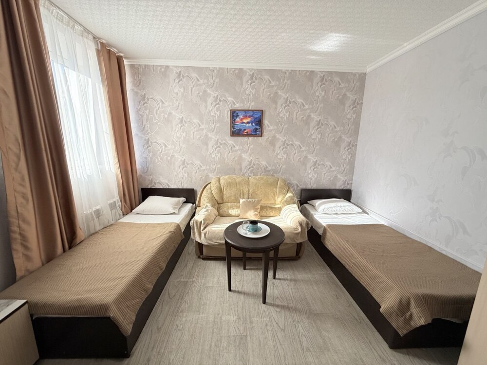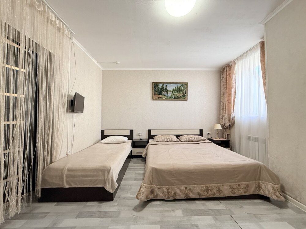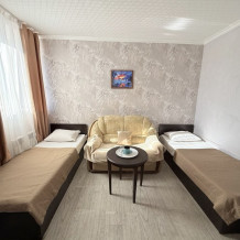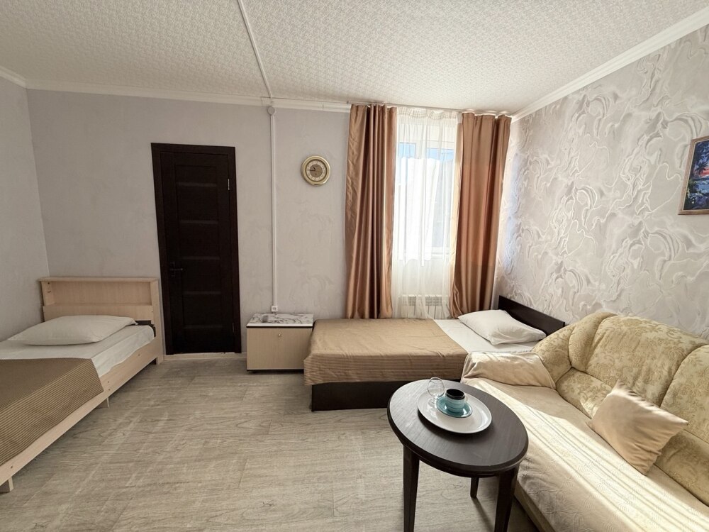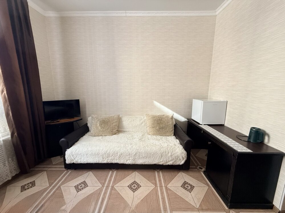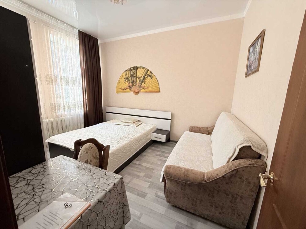 Комфортный номер с двуспальной кроватью и диваном. Удобен для семьи с ребенком.