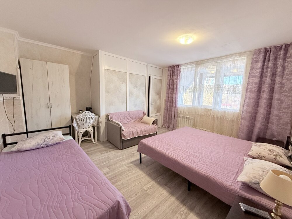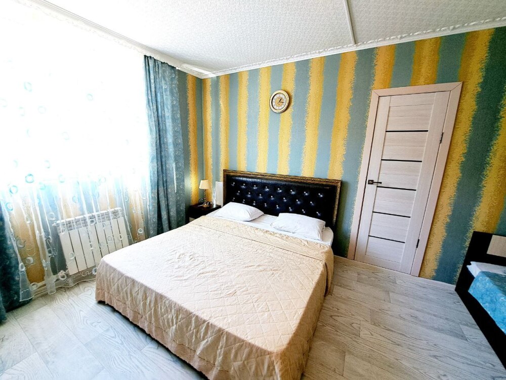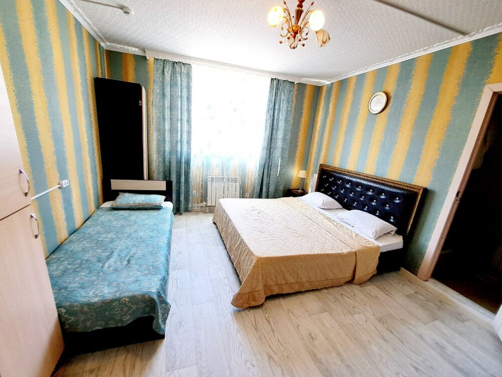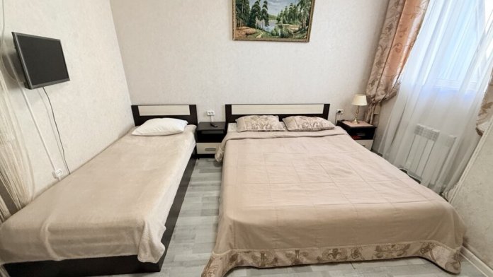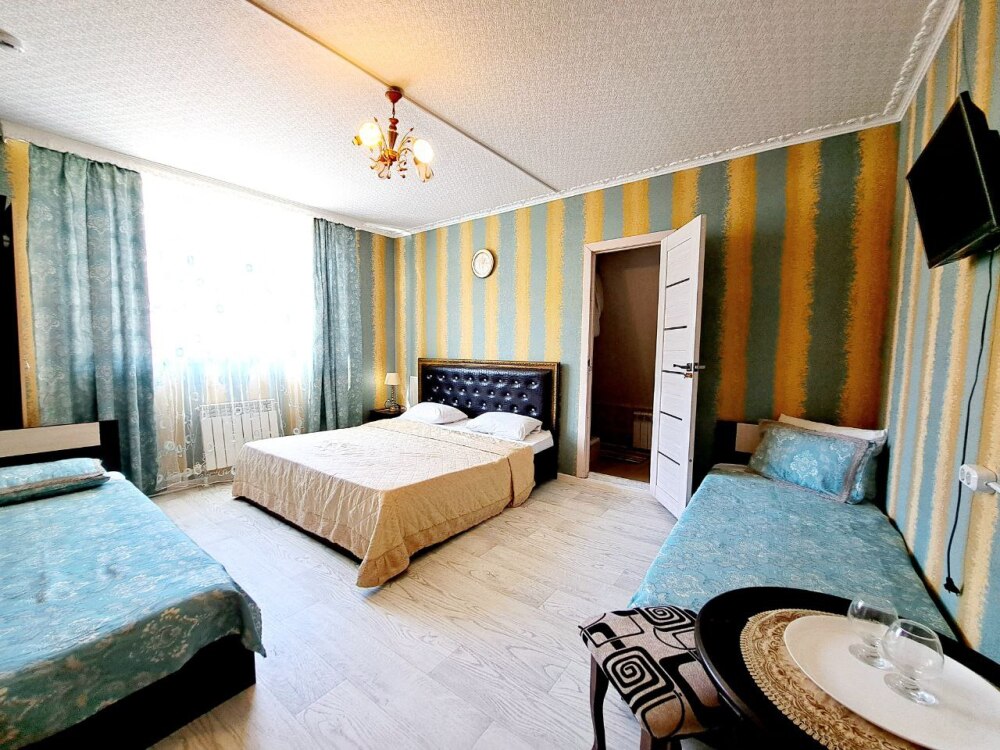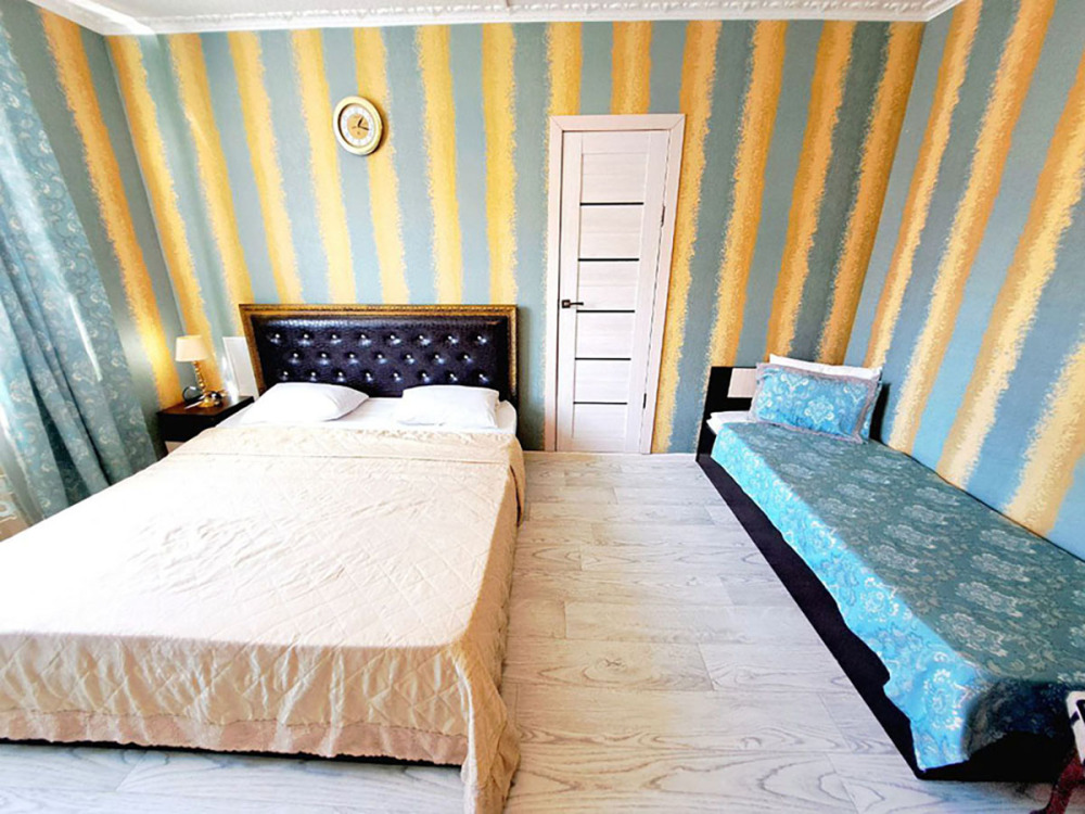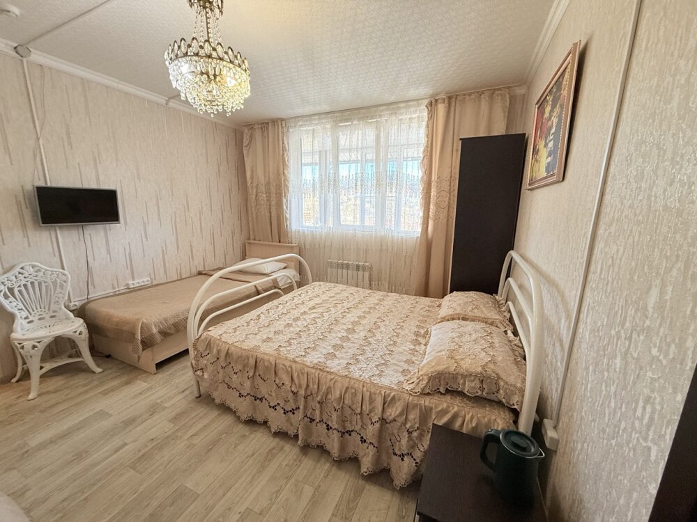 Комфортный номер с двуспальной кроватью и диваном. Удобен для семьи с ребенком.