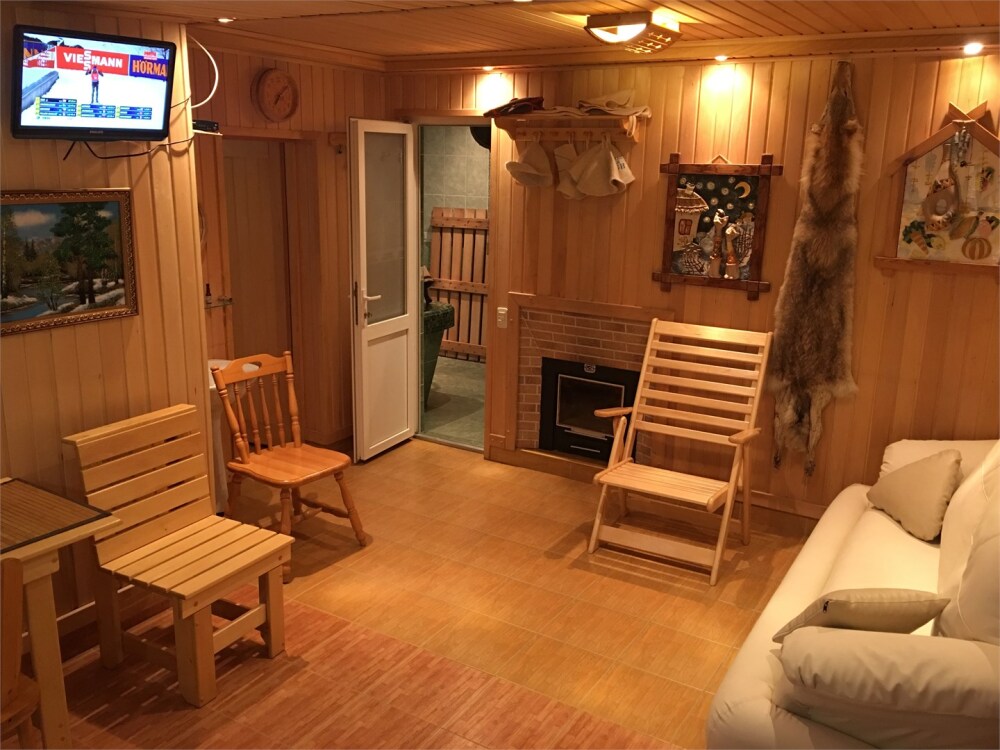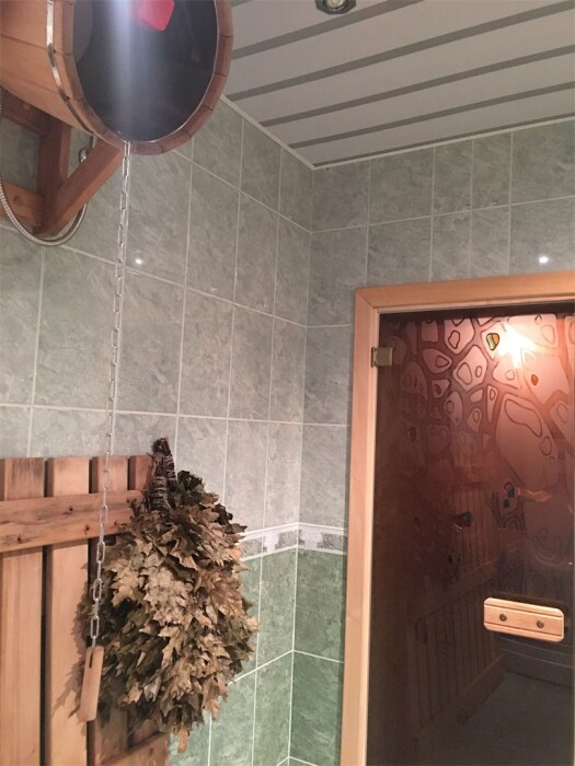 - Сауна до 6 гостей с маленьким бассейном (зал для отдыха с чайной зоной 15м2, обливания с холодной водой, душевая, подвесное ведро для облива (кадка), Теплый стол (мыльня));