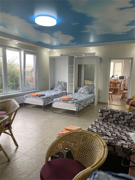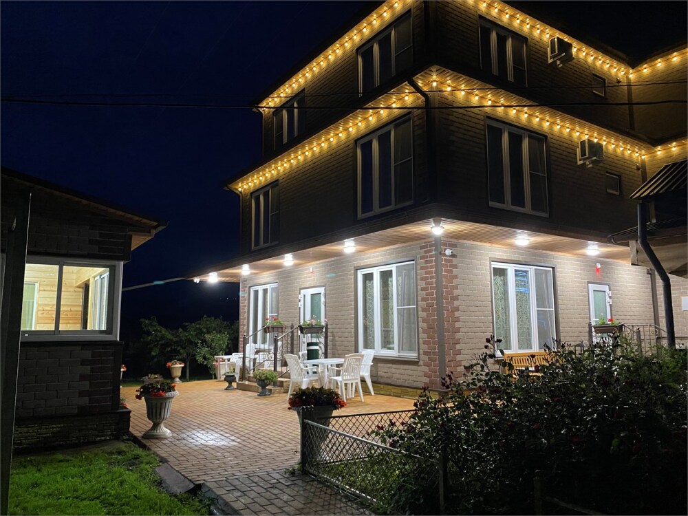 Вилла - это отдельный трехэтажный домик на 7 номеров со своим въездом для машин, комплексом нескольких тандыров и мангальной зоной на патио. Завтраки и ужины на патио с видом на Эльбрус. Возможен завтрак и ужин по заказу заранее. Возможна аренда всего комплекса с мангалами, банным домиком и 7-ю номерами. Виды из номеров рассветов и закатов - фантастические. Аренда банного домика, тандырной зоны - за дополнительную оплату. Комплекс мангалов - предоставляется бесплатно.