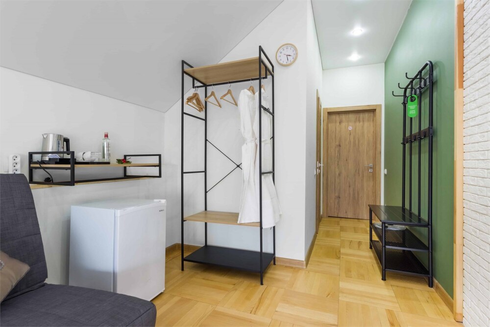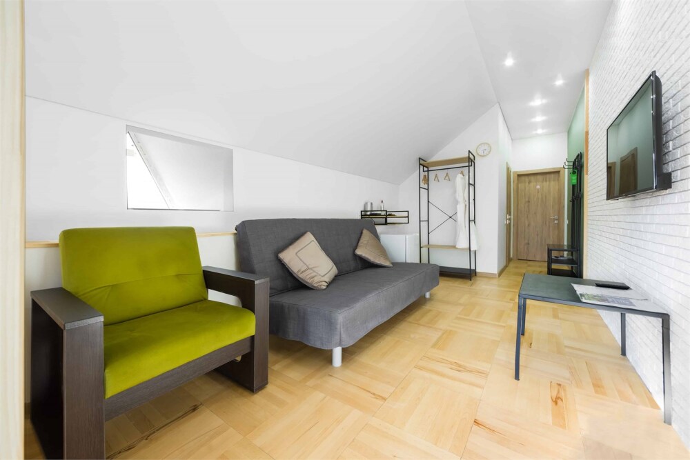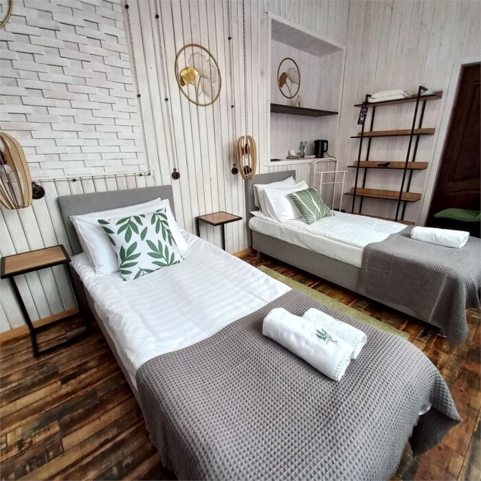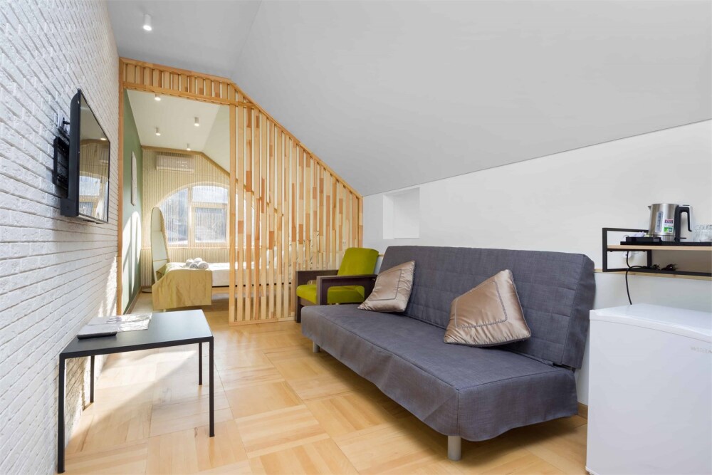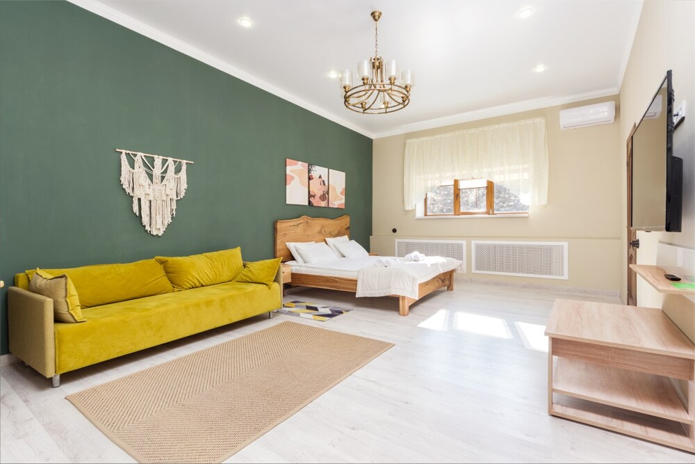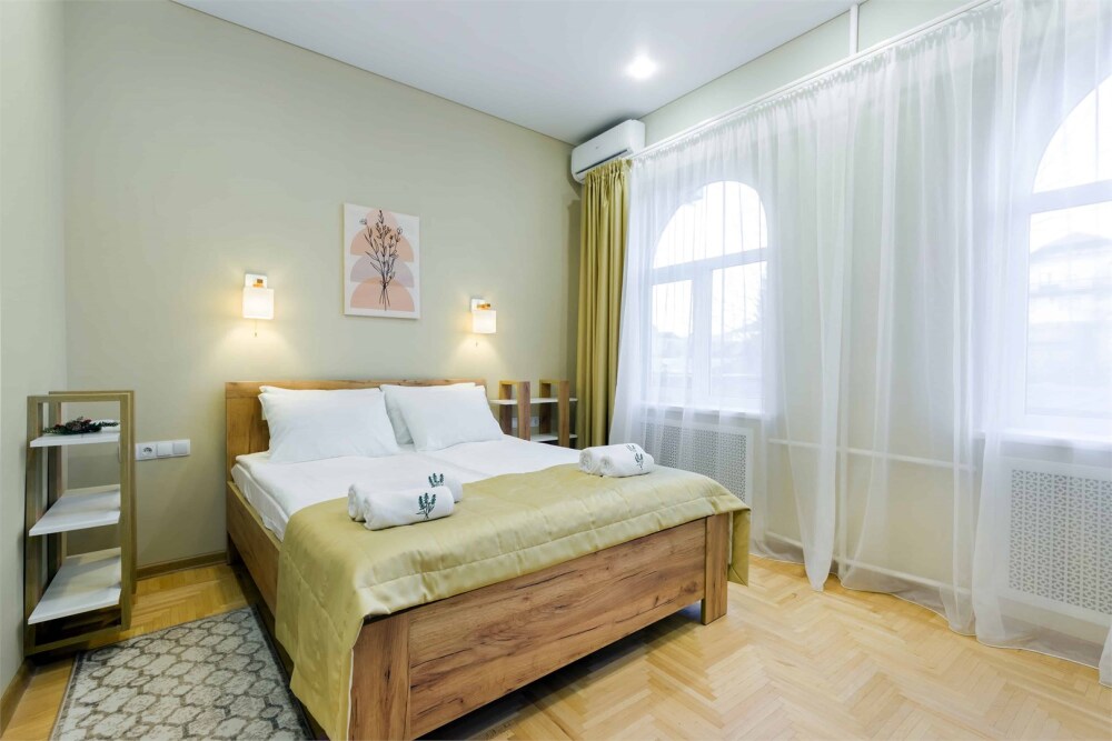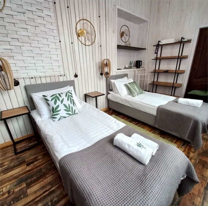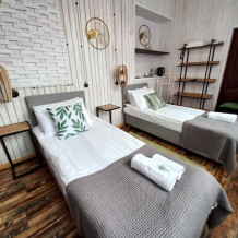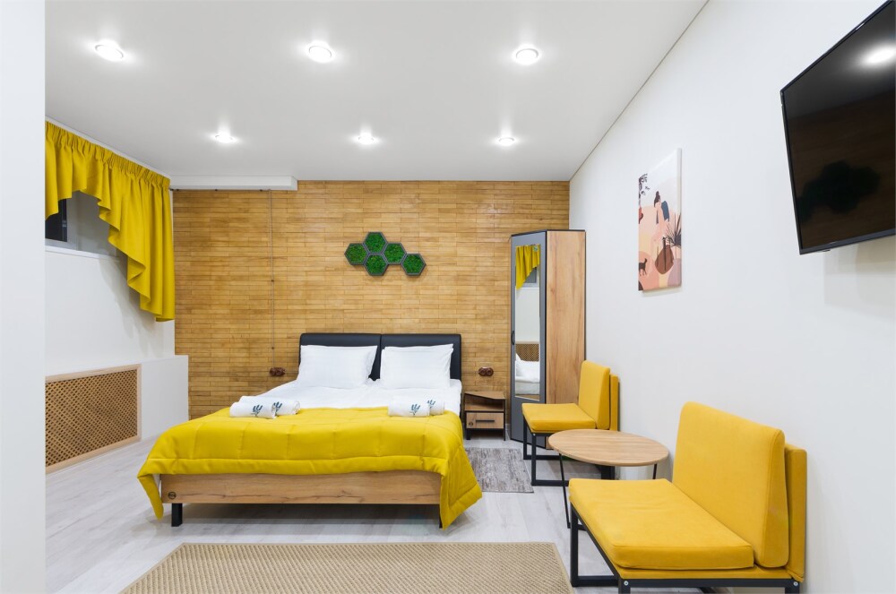 Однокомнатный комфортный номер в стиле Бохо площадью 23 кв.м. может разместить до 4 гостей (с условием дополнительного спального места), обустроен кроватью размера Queen size (160х200), ЖК-телевизором, диваном, мини-холодильником, чайным набором. В ванной есть халаты, полотенца, средства для душа и фен.
