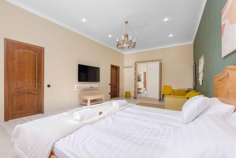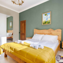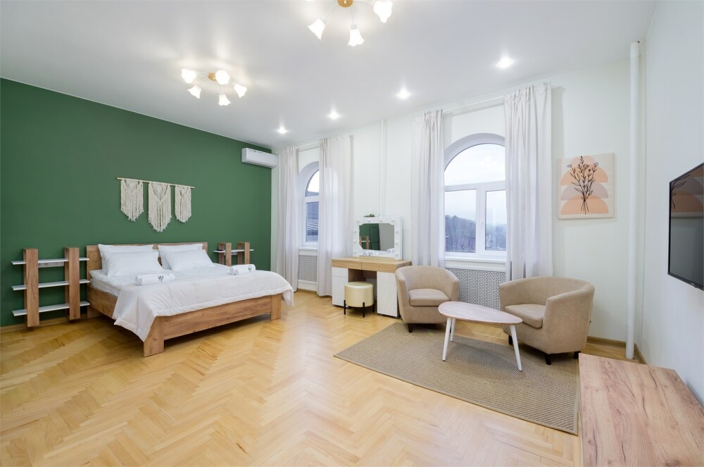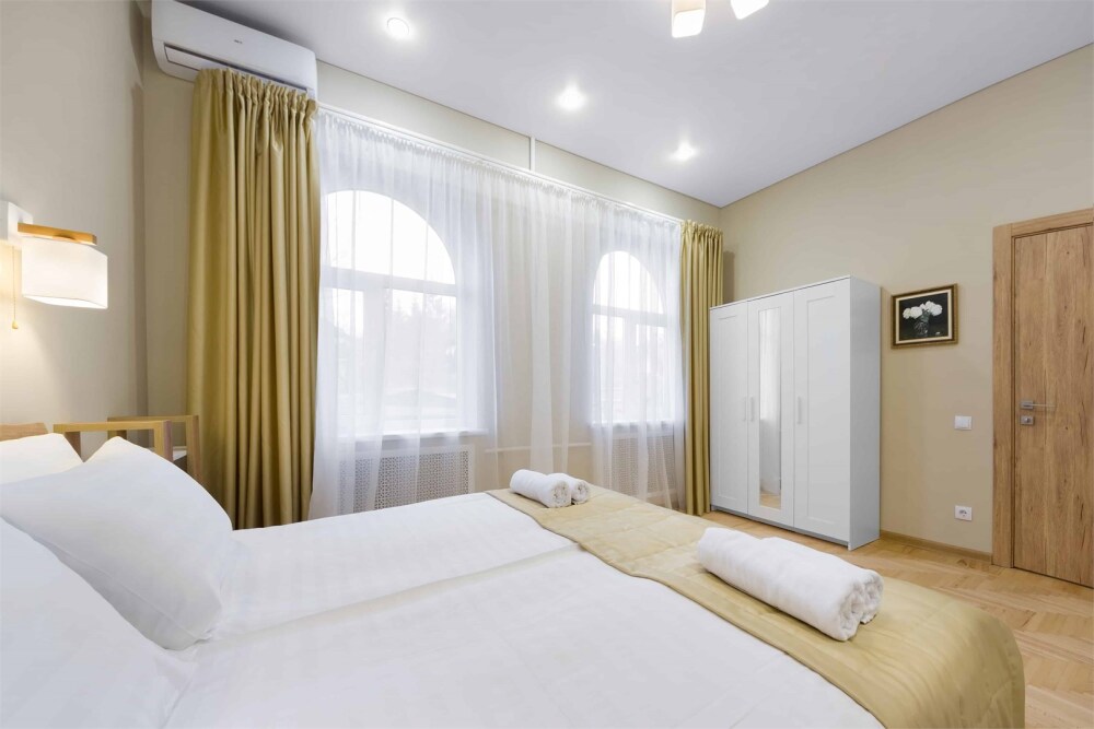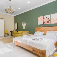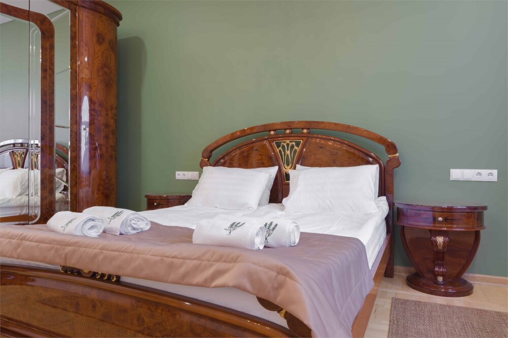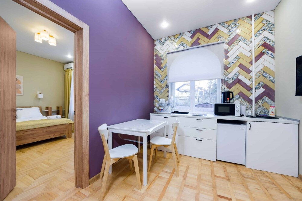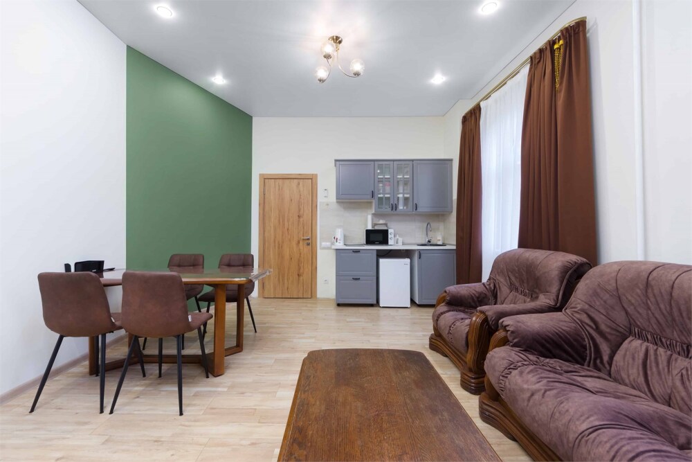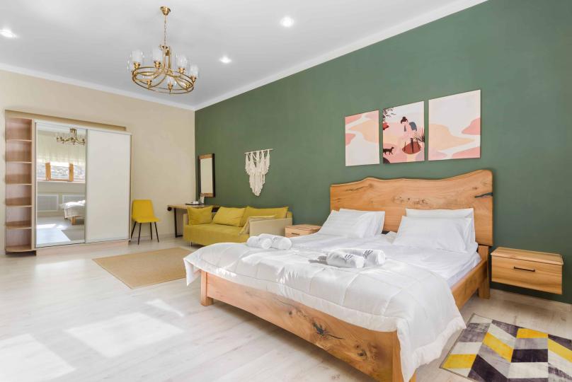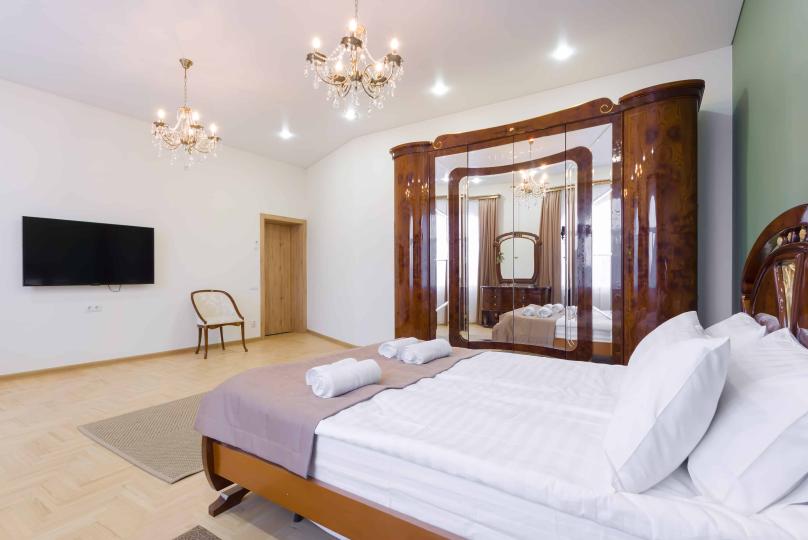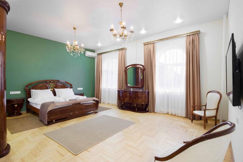 Просторный двухкомнатный номер площадью 60 кв.м. состоит из спальни и гостиной с кухней, оборудованной варочной панелью, мультиваркой, микроволновой печью, мини-холодильником и 2 ЖК-телевизорами. В ванной есть стиральная машина, фен, полотенца, халаты, средства для душа. Номер предназначен для размещения до 4 человек (при условии заказа дополнительных кроватей).