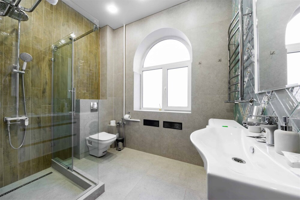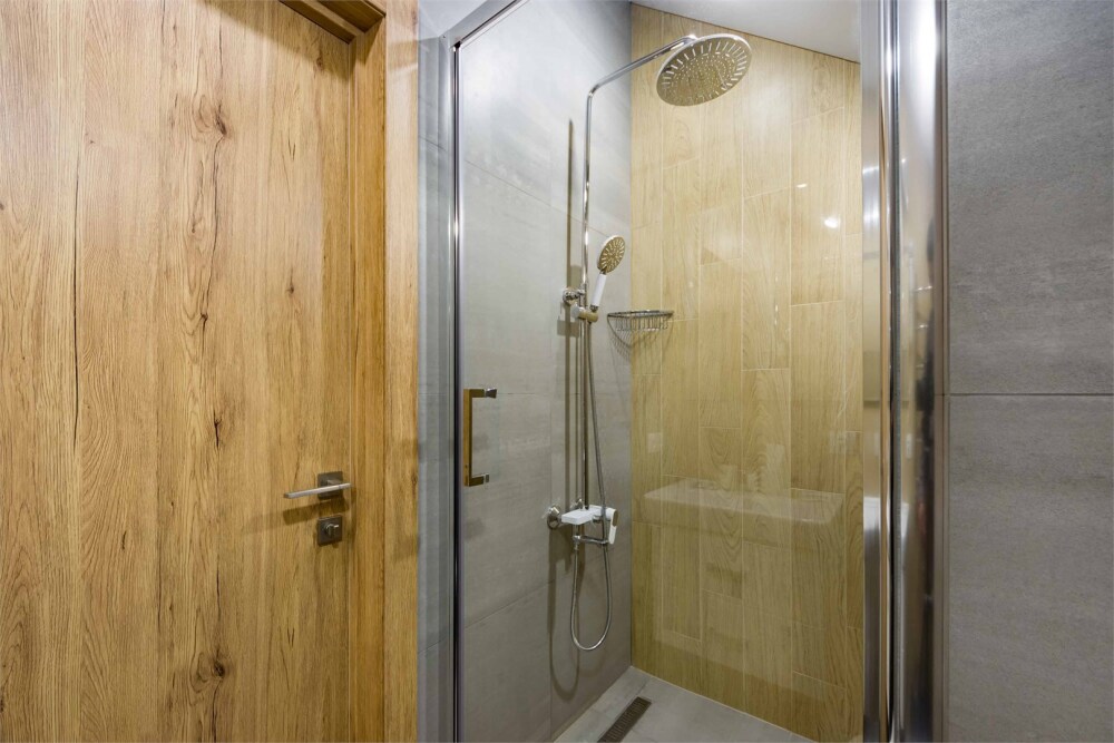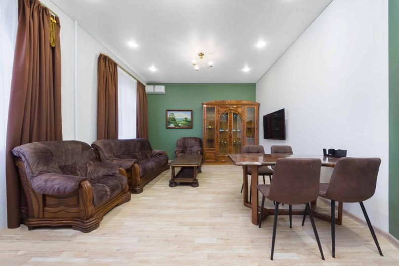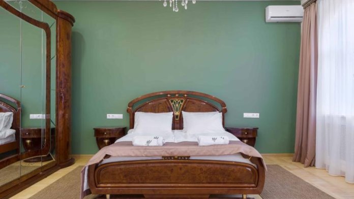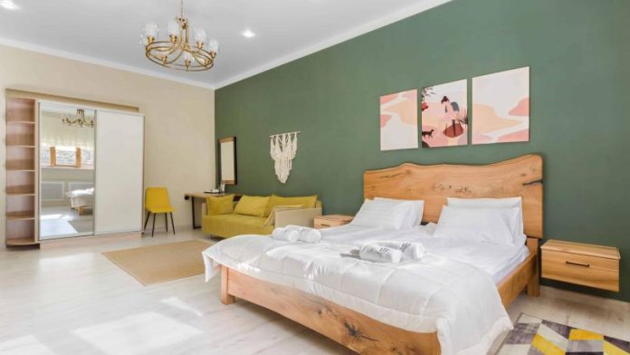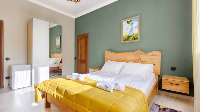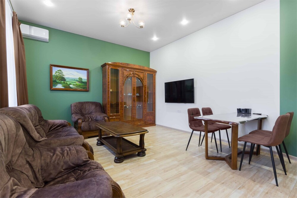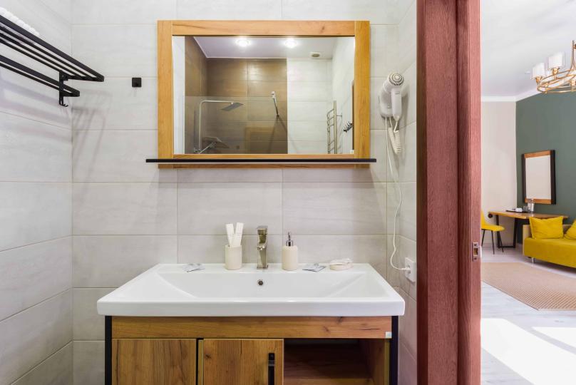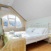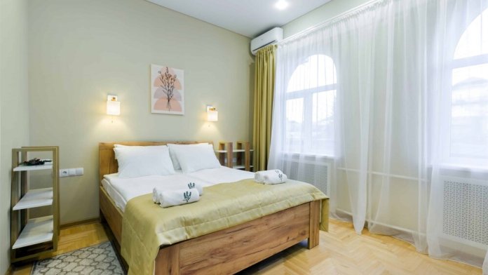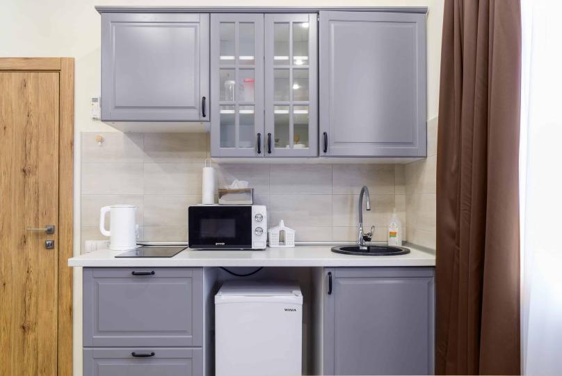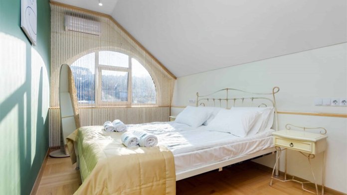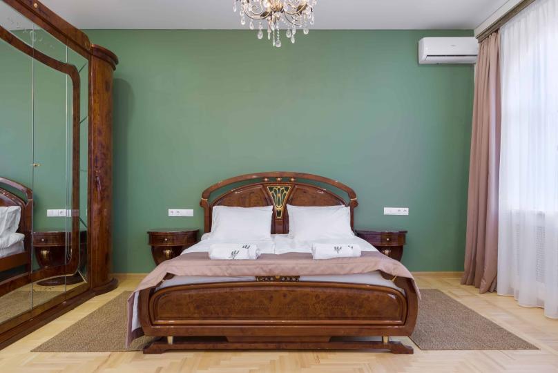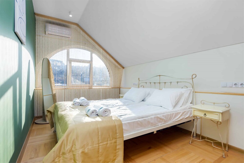 Просторный двухкомнатный номер площадью 60 кв.м. состоит из спальни и гостиной с кухней, оборудованной варочной панелью, мультиваркой, микроволновой печью, мини-холодильником и 2 ЖК-телевизорами. В ванной есть стиральная машина, фен, полотенца, халаты, средства для душа. Номер предназначен для размещения до 4 человек (при условии заказа дополнительных кроватей).