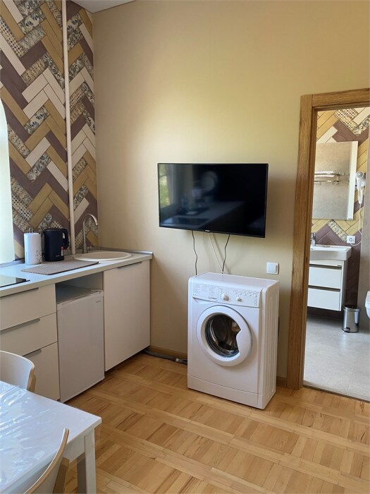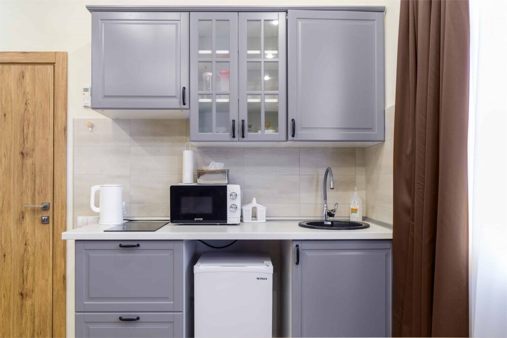 Возможно размещение до 3 человек (с учетом дополнительной кровати). В спальне с кондиционером расположена кровать размера Queen-size (160х200), а кухня оборудована варочной панелью, микроволновой печью, мультиваркой и мини-холодильником, ЖК-телевизором. В ванной есть средства для душа, фен и халаты. На всей территории отеля предоставляется бесплатный Wi-Fi.