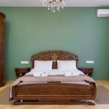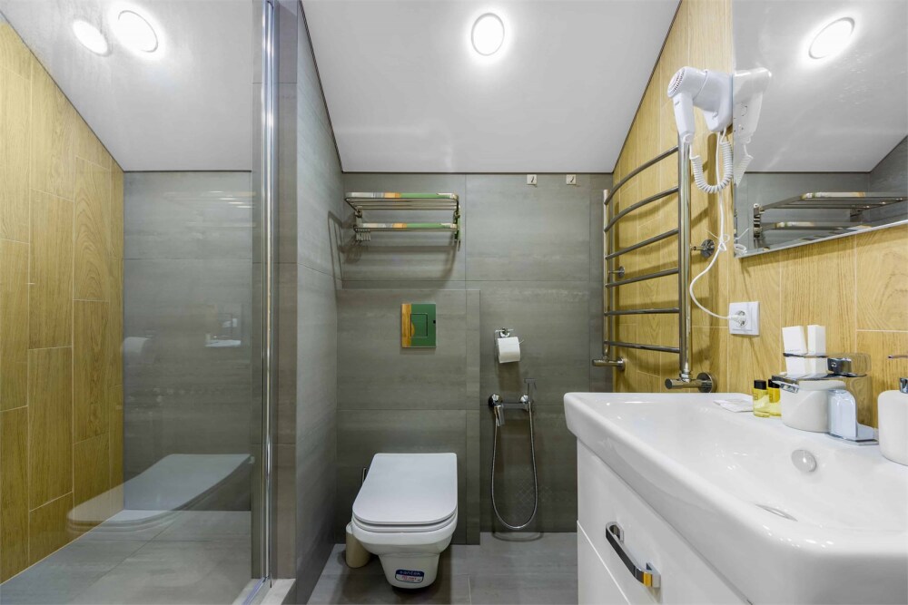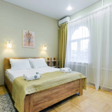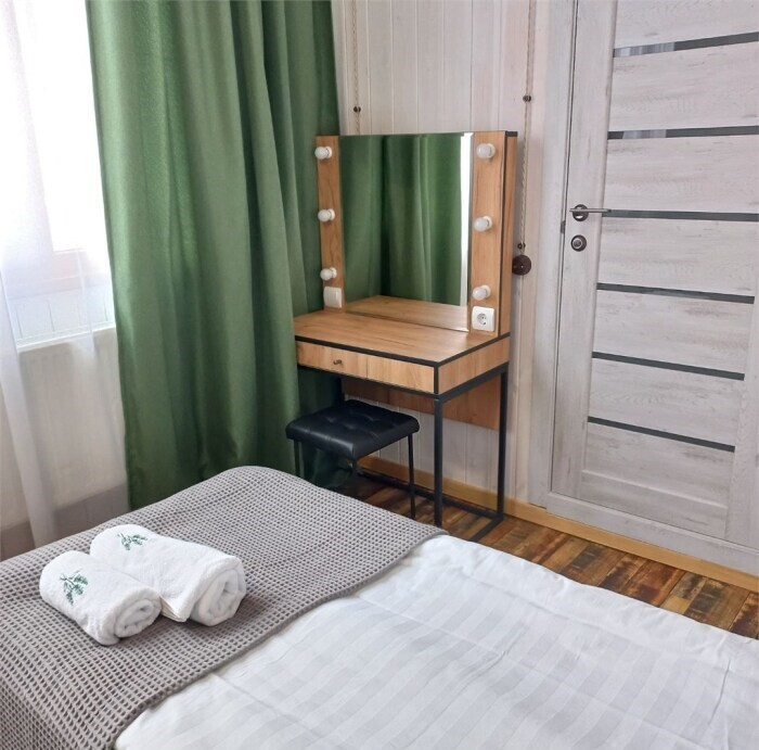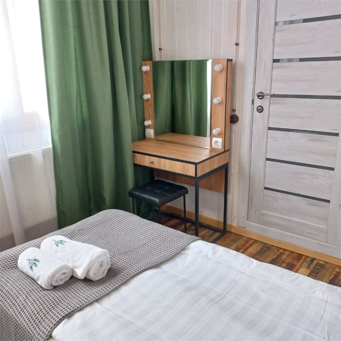 Однокомнатный номер площадью 30 кв.м., предназначенный для размещения до 4 человек, обустроен большой кроватью размера King-size (180х200), ЖК-телевизором, мини-холодильником, чайным набором, кондиционером. В ванной есть халаты, полотенца, средства для душа и фен.