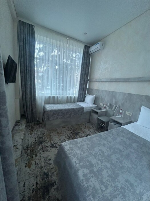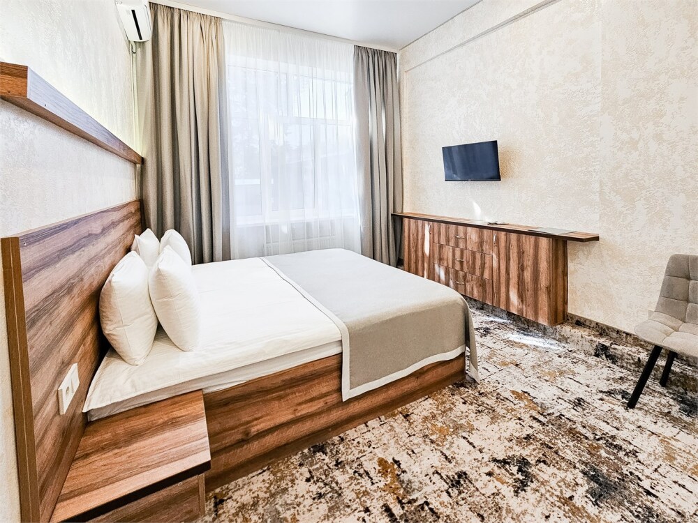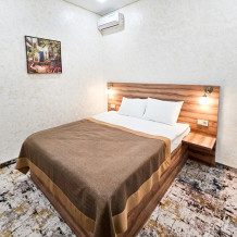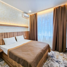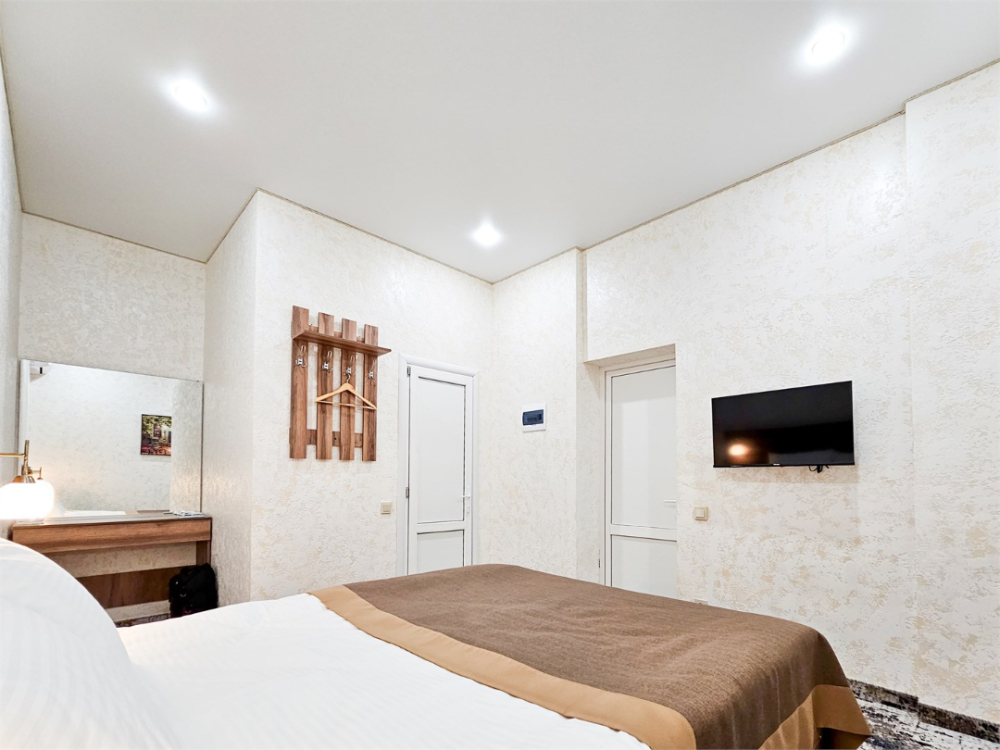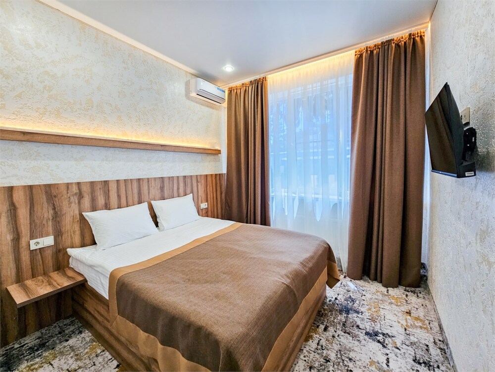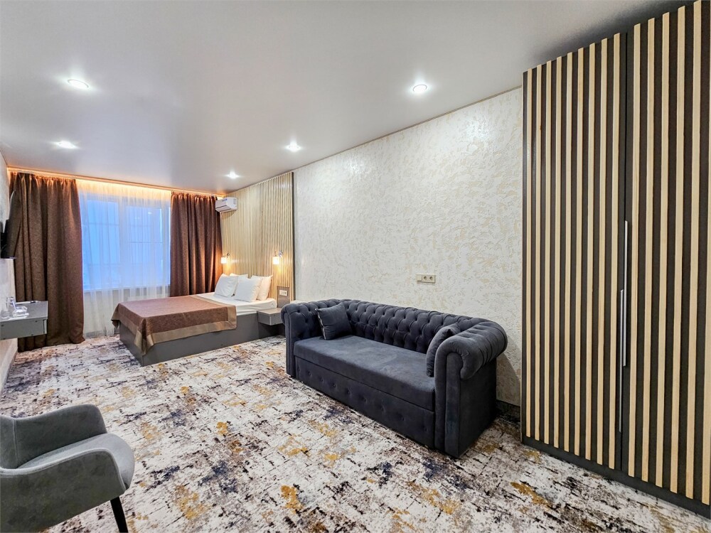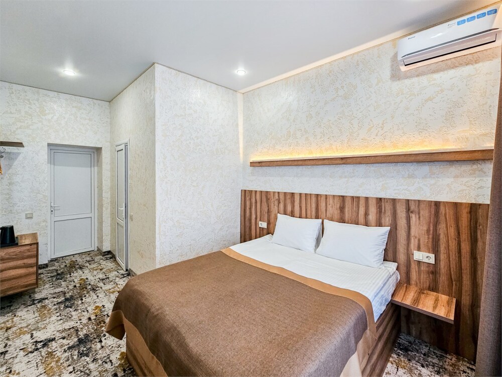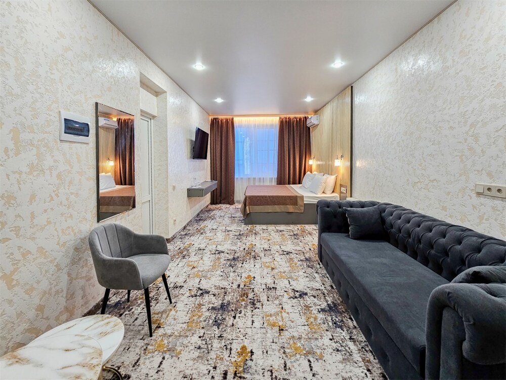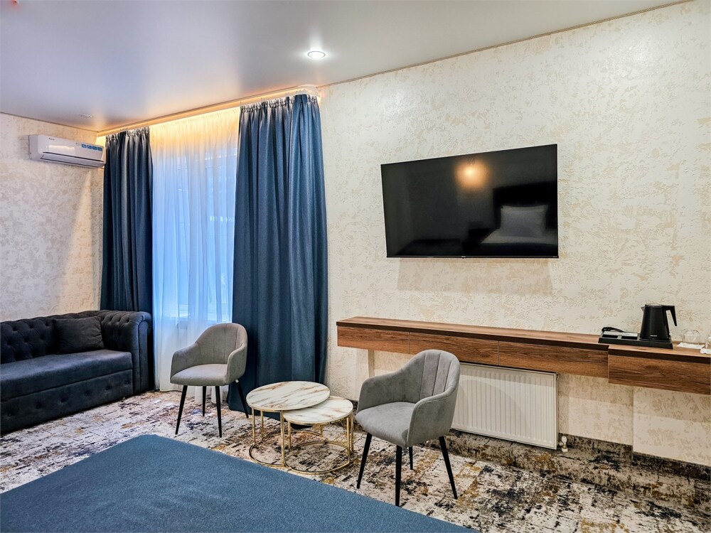 Номер оснащен: двуспальная кровать, телевизор, кондиционер, шкаф, посуда, чайный набор, журнальный столик, раскладной диван, два стула, бра, халаты средства гигиены, комплект полотенец 3-х видов, душевая, санузел, фен, зеркало.
