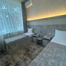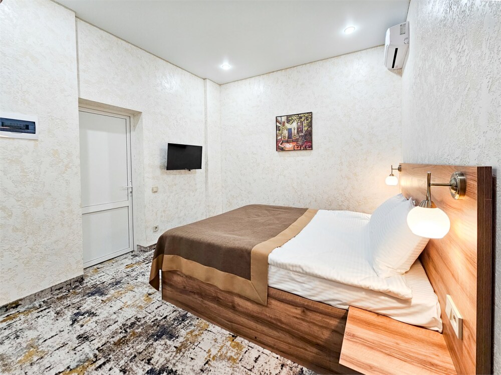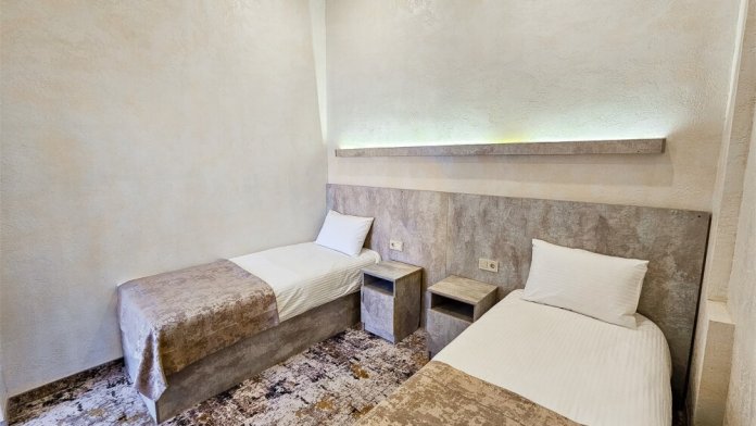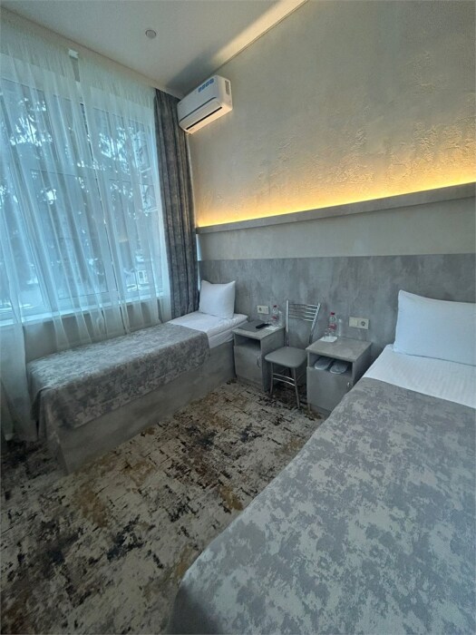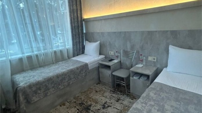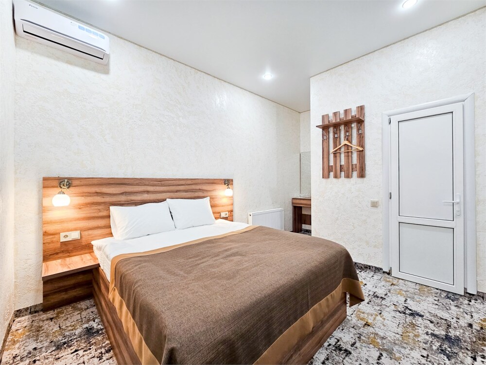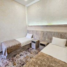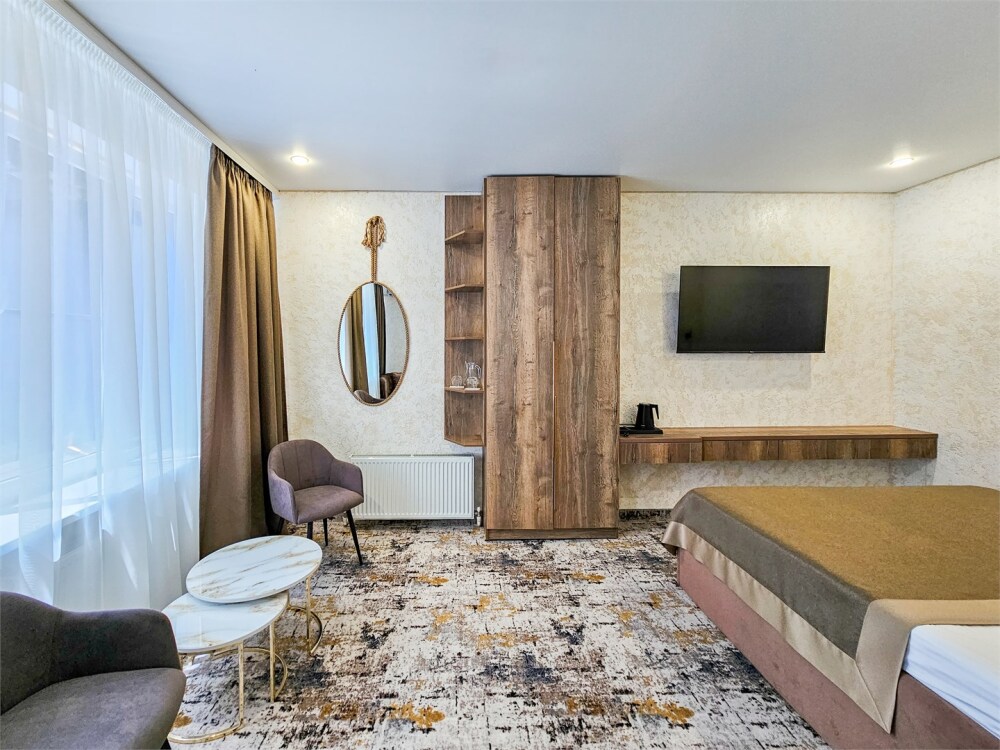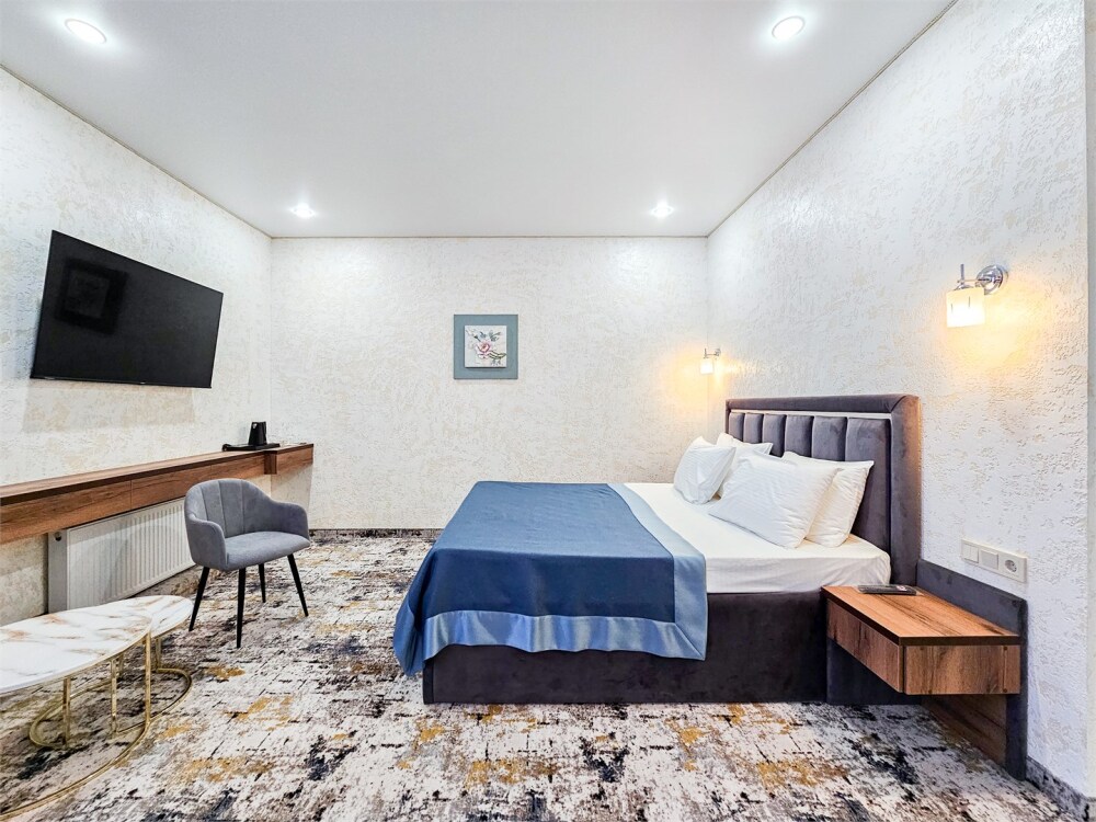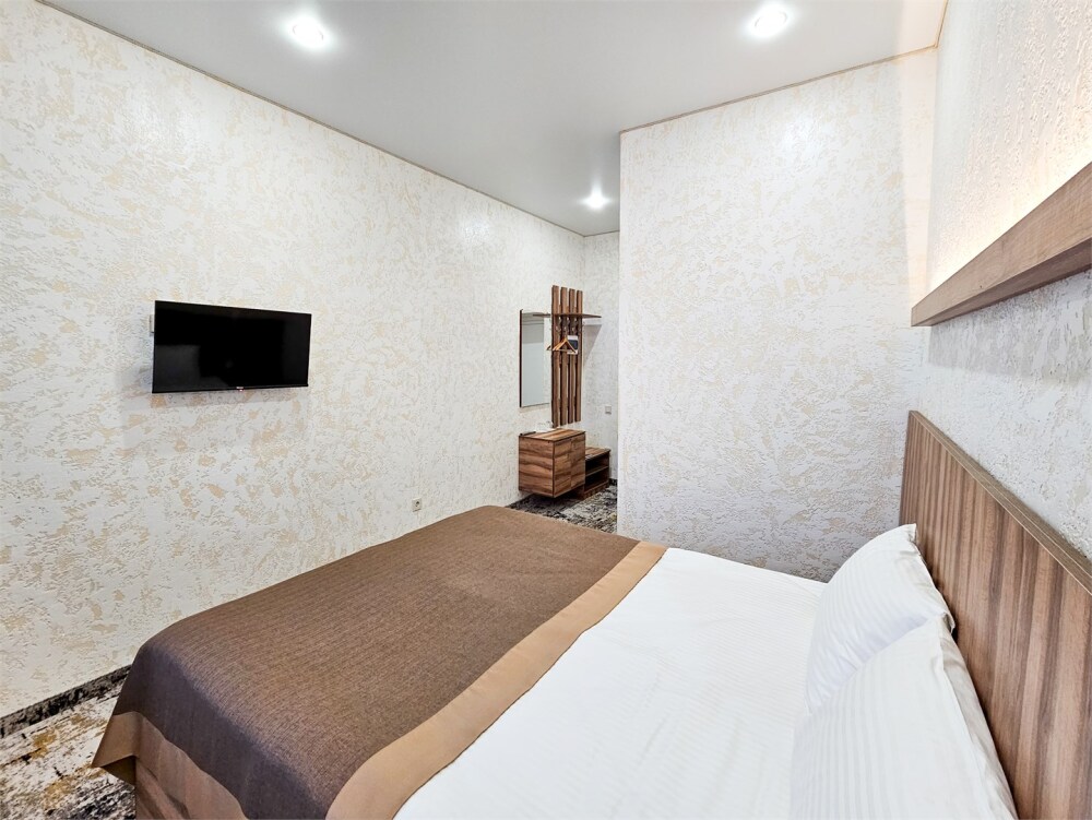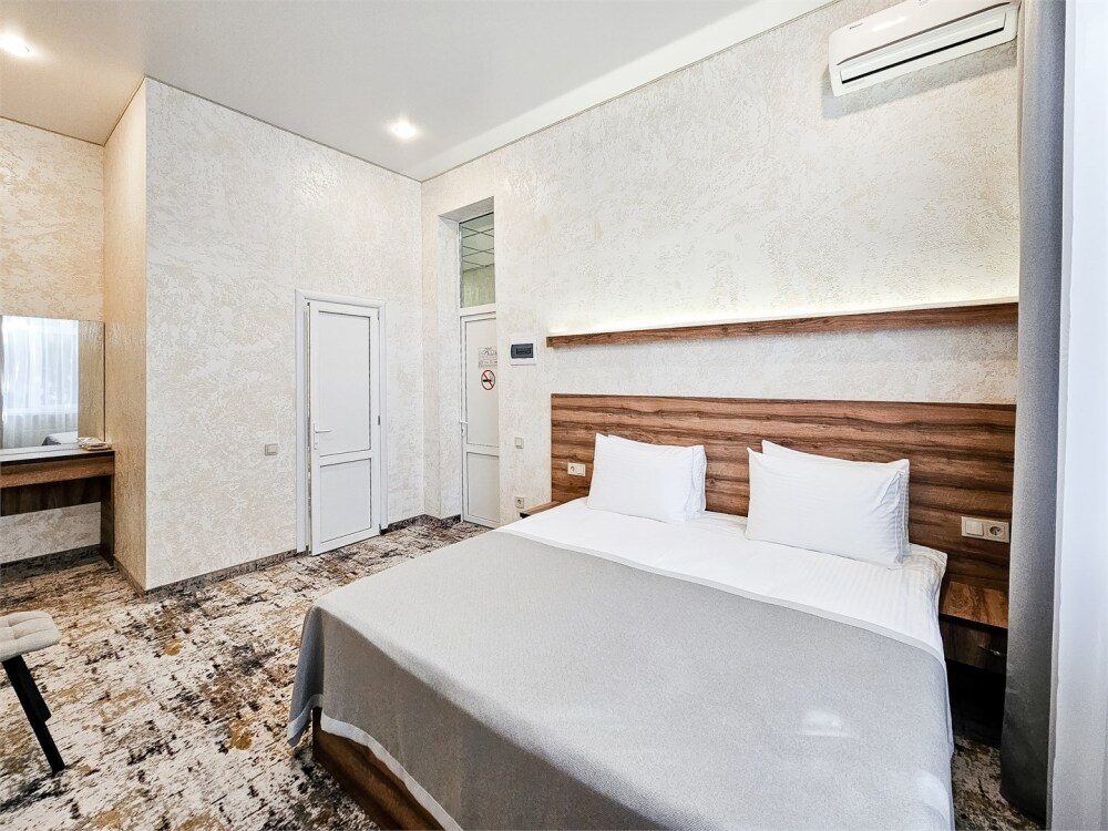 Номер оснащен: двуспальная кровать, телевизор, кондиционер, шкаф, посуда, чайный набор, журнальный столик, раскладной диван, два стула, бра, халаты средства гигиены, комплект полотенец 3-х видов, душевая, санузел, фен, зеркало.