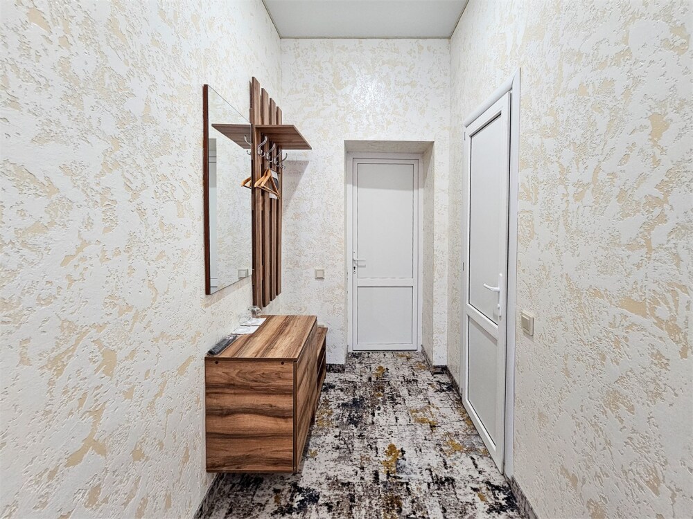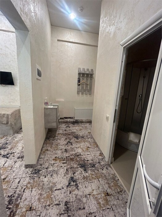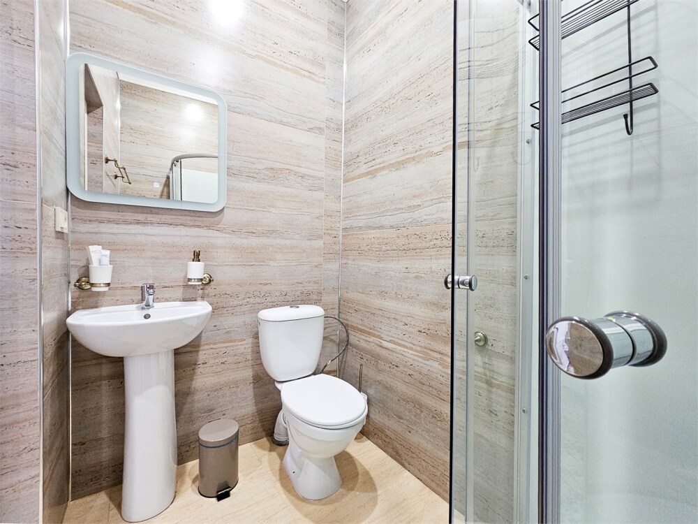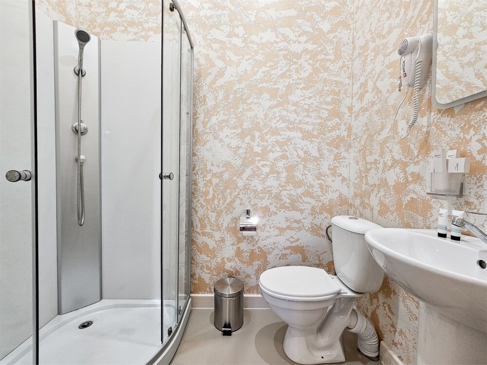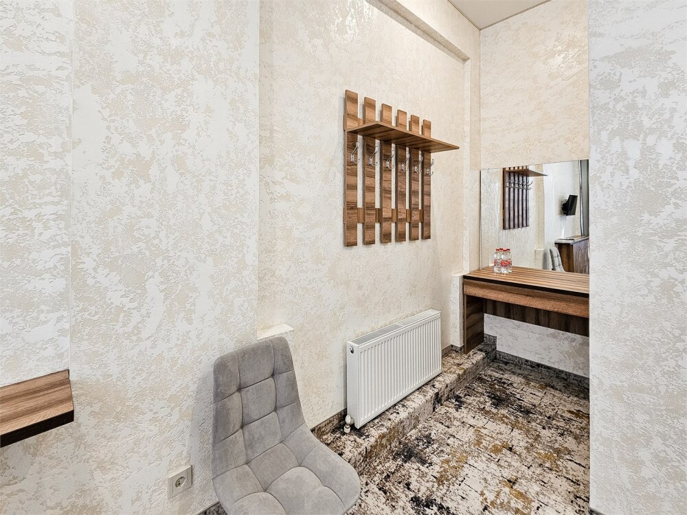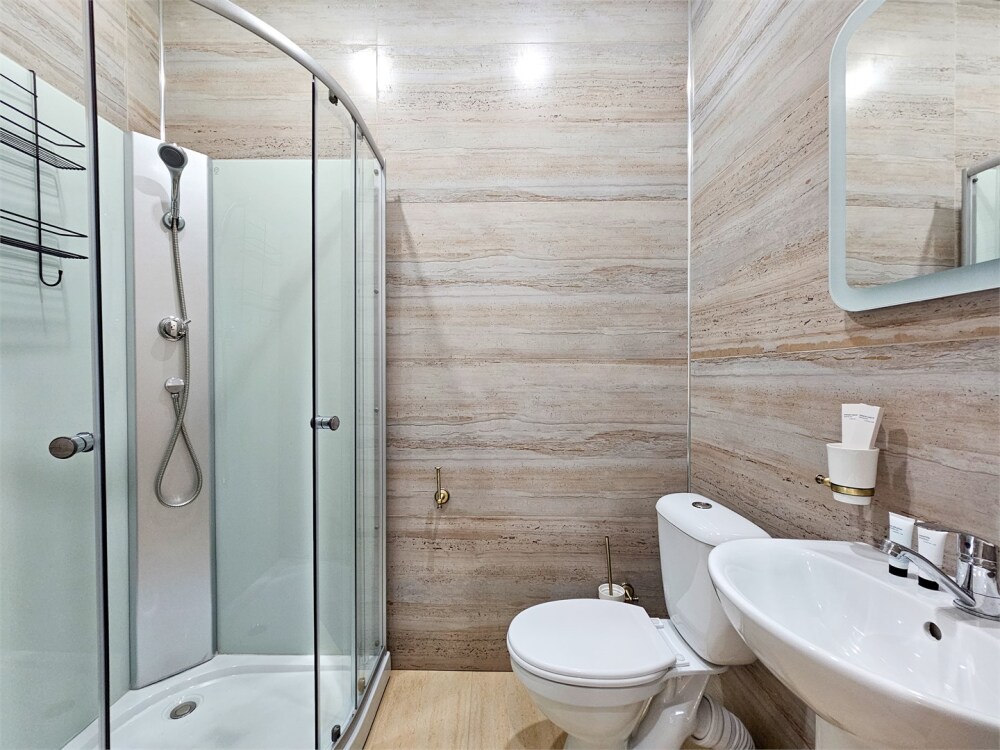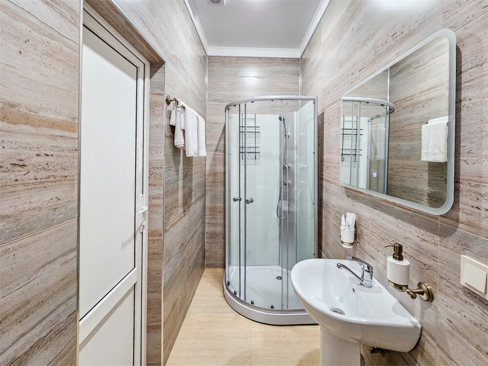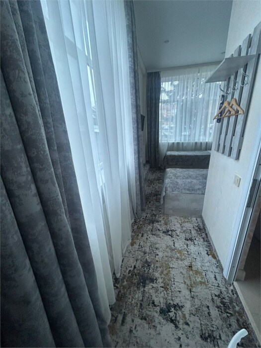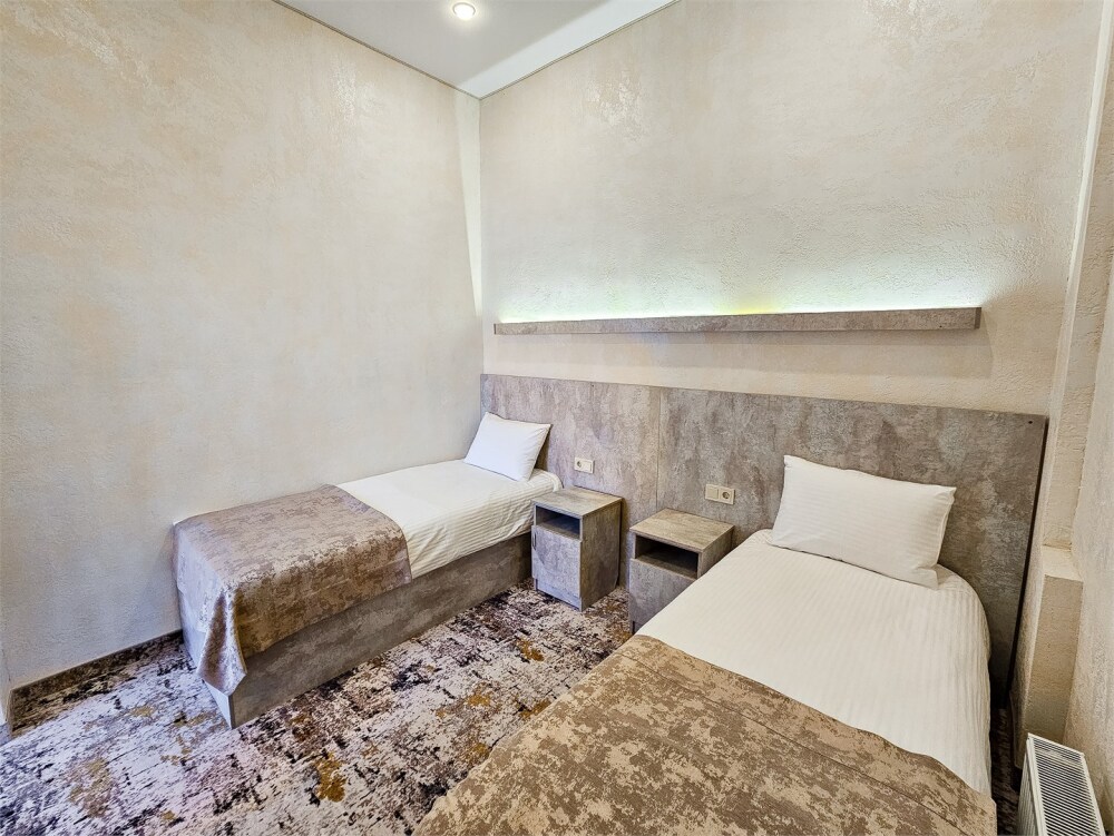 Номер оснащен: двуспальная кровать, телевизор, кондиционер, шкаф, посуда, чайный набор, журнальный столик, раскладной диван, два стула, бра, халаты средства гигиены, комплект полотенец 3-х видов, душевая, санузел, фен, зеркало.