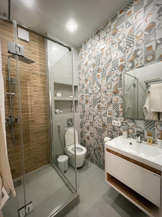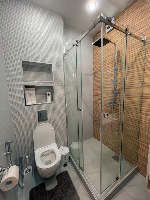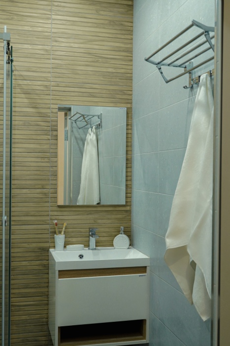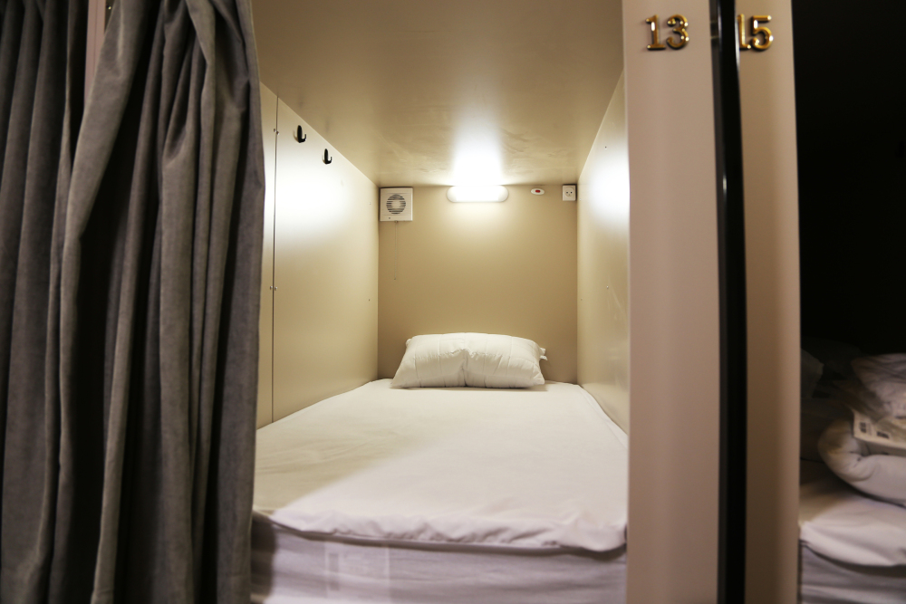 Капсульные кровати с освещением, розеткой и вентиляцией, шкафчики, зеркало, кондиционер, общий санузел и душевая.