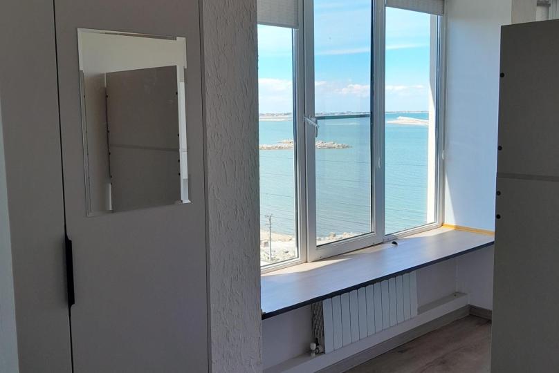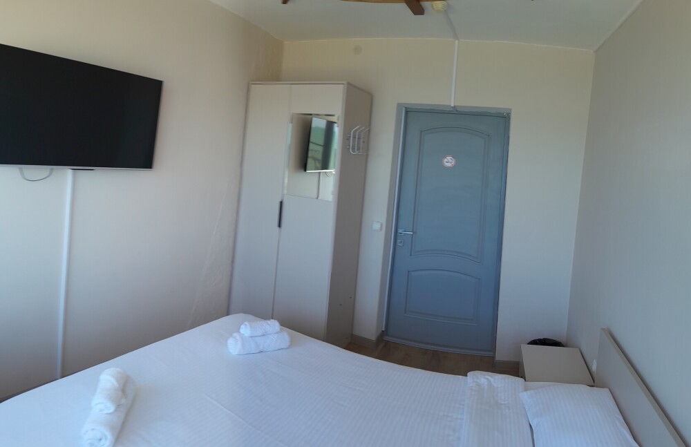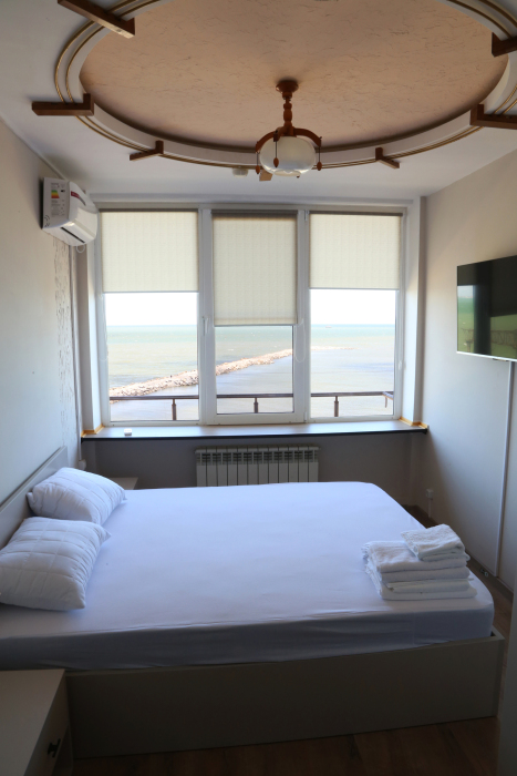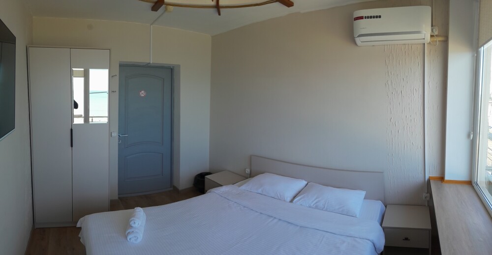 Двухспальная кровать, общий санузел и душевая, кондиционер, телевизор, шкаф, зеркало, вид на море.