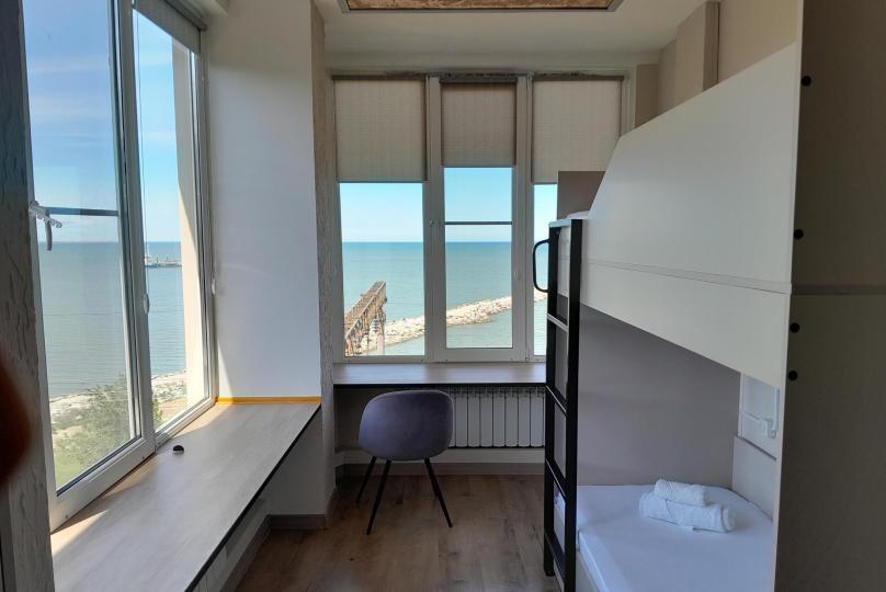 Капсульные кровати с освещением и розеткой, шкафчики, зеркало, кондиционер, общий санузел и душевая, вид на море.