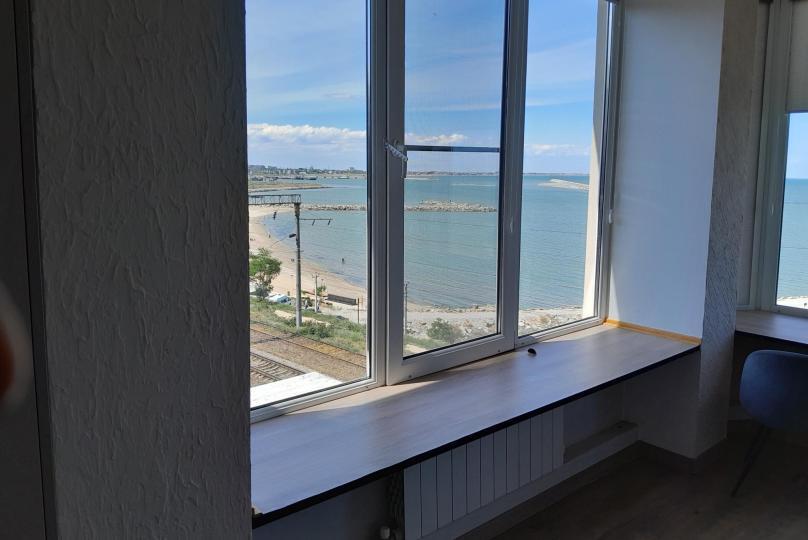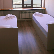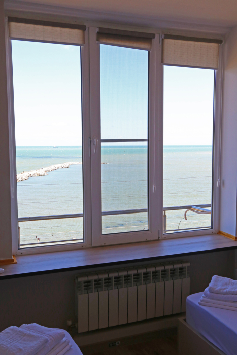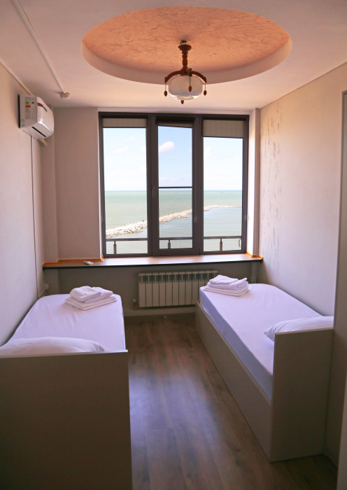Две раздельные одноместные кровати, общий санузел и душевая, кондиционер, шкаф, зеркало, вид на море.