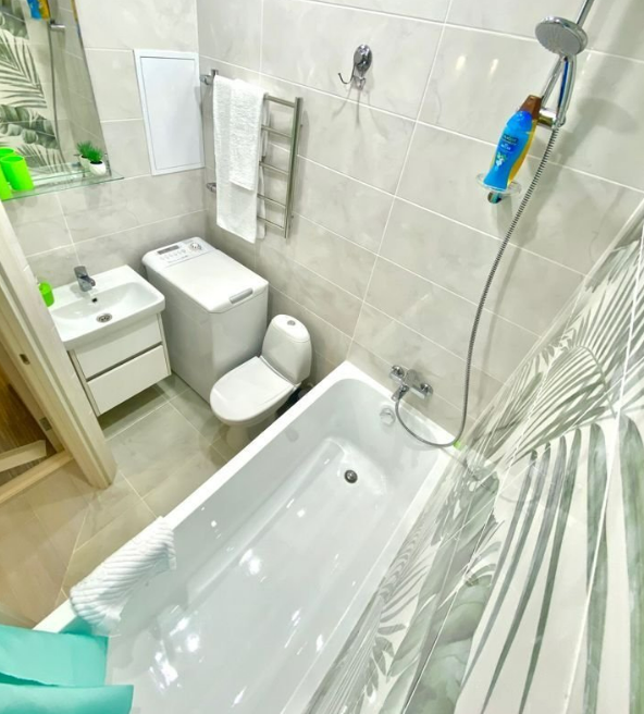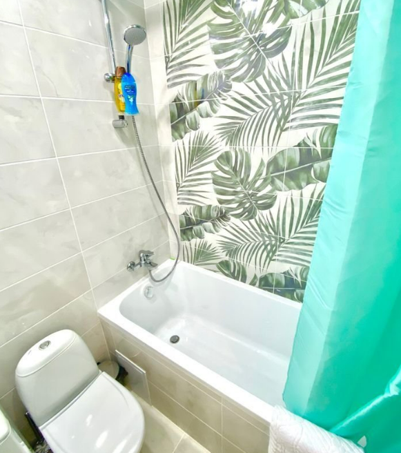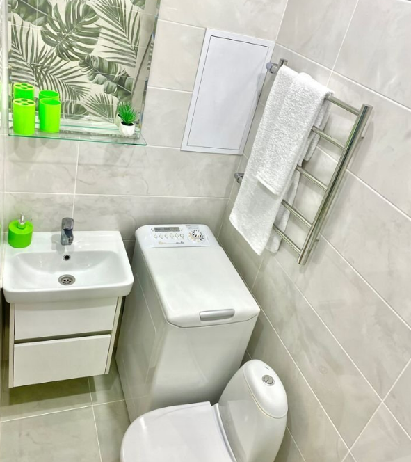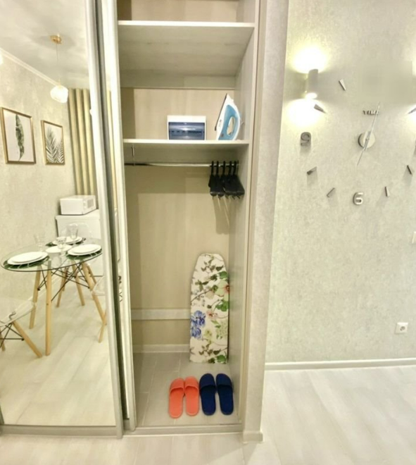 - из техники: большой ТВ с 130 кабельными каналами, холодильник, микроволновая печь, тостер, яйцеварка, кофе-машина, вытяжка с подсветкой, индукционная плита и посуда к ней, стиральная машина, сплит-система, бойлер для бесперебойной подачи горячей воды, чайник, фен, подсветка спальной зоны на пульте управления;