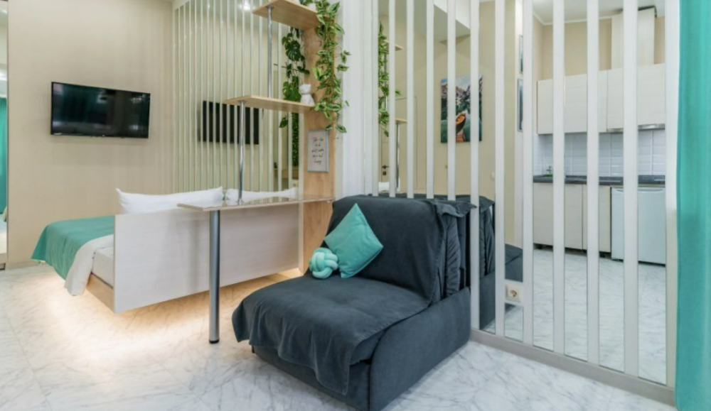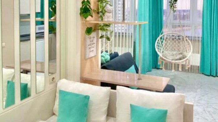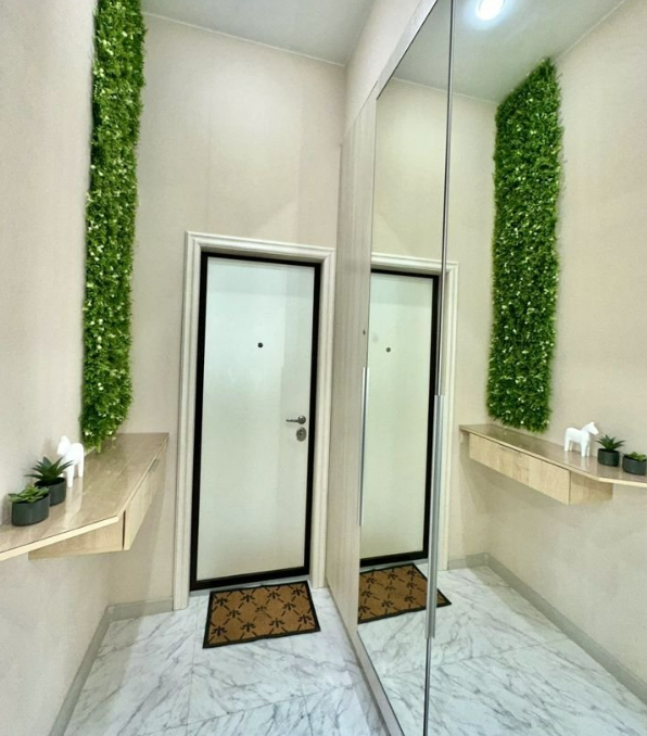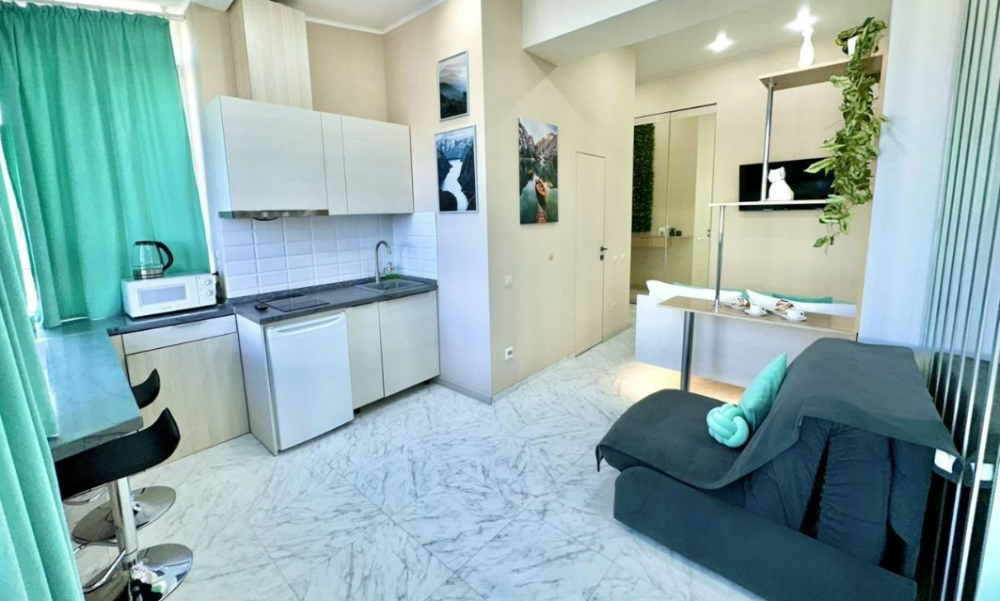 - из техники: большой ТВ с 130 кабельными каналами, холодильник, микроволновая печь, тостер, яйцеварка, вытяжка с подсветкой, индукционная плита и посуда к ней, стиральная машина, сплит-система, бойлер для бесперебойной подачи горячей воды, чайник, фен, подсветка спальной зоны на пульте управления;