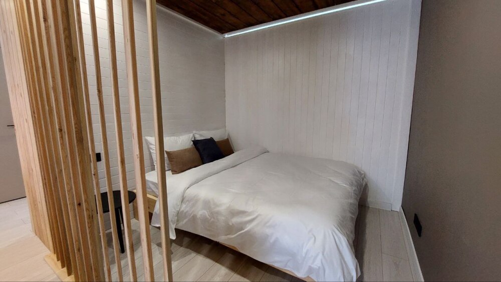 - кровать отделена от общей комнаты деревянными жалюзи, которые можно превратить в полноценную стену, отгораживающую спальную зону;