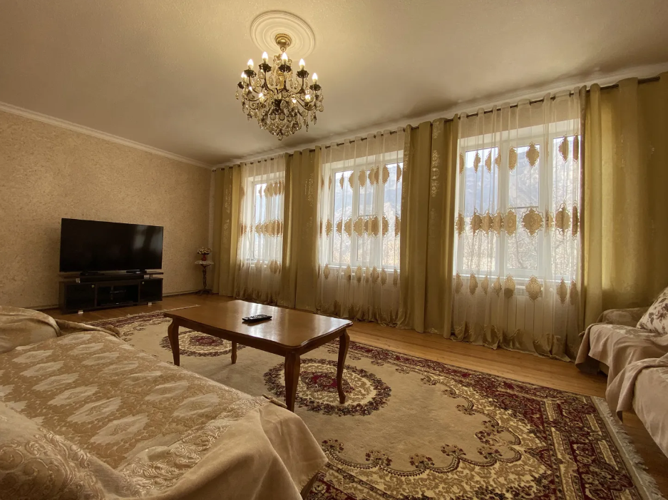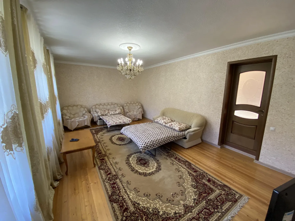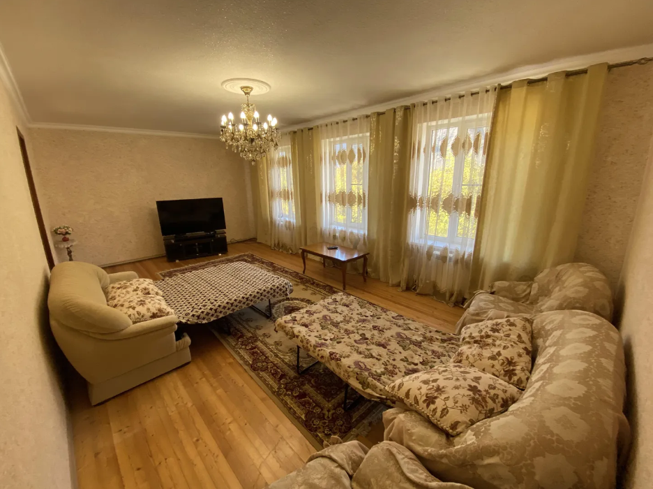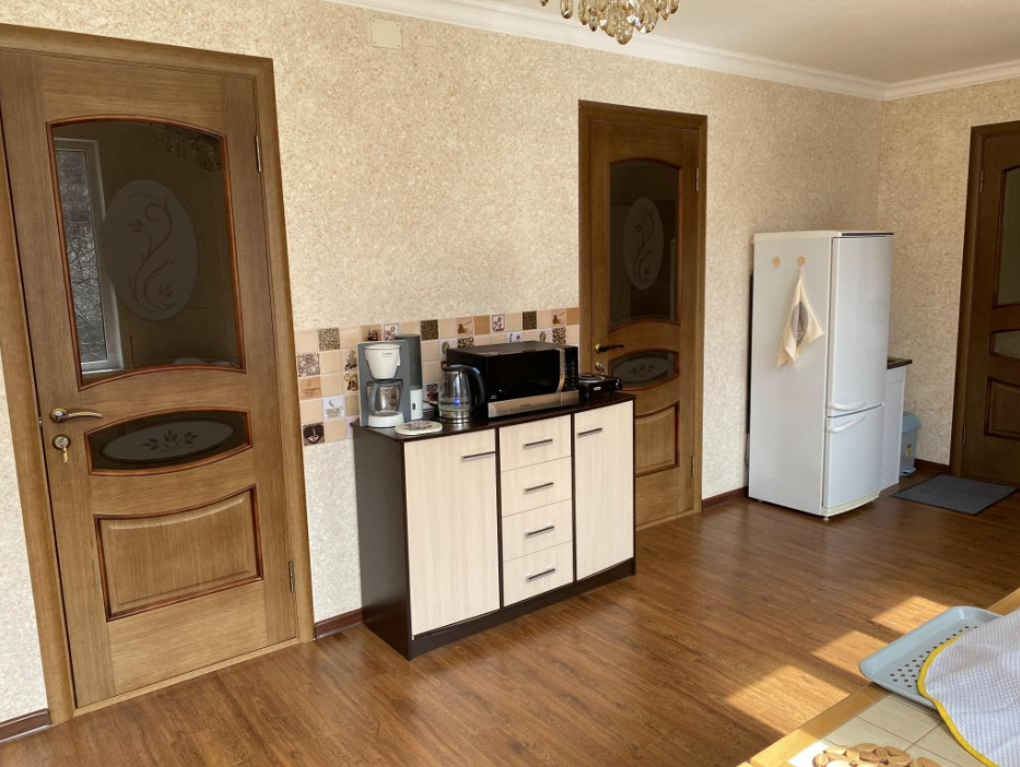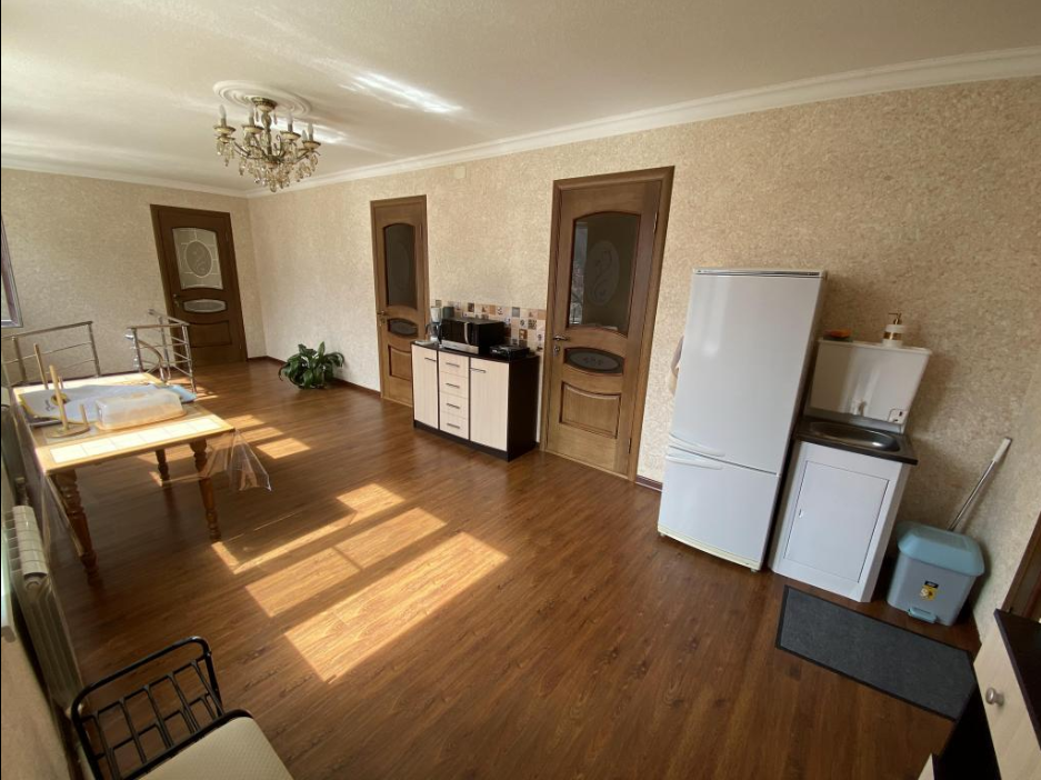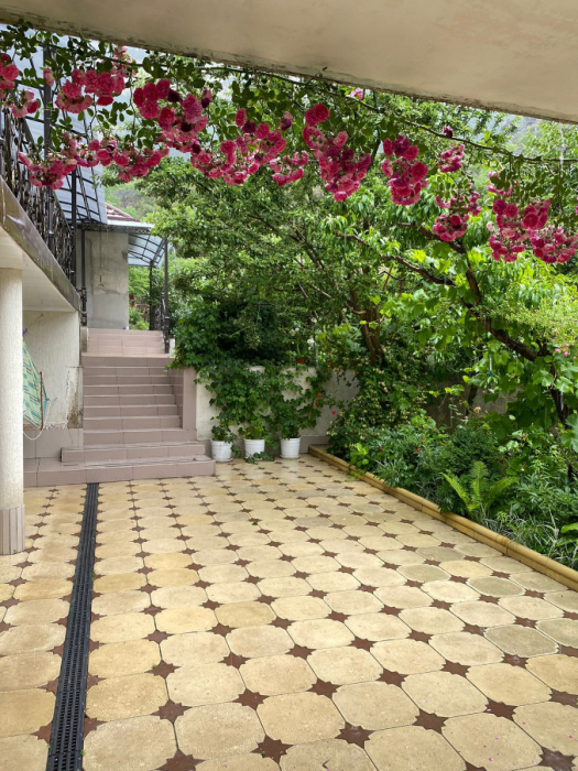 Для размещения подготовлены большая и маленькая комнаты, есть общая кухня. Двор полон зелени, есть зона отдыха, мангал, парковка.