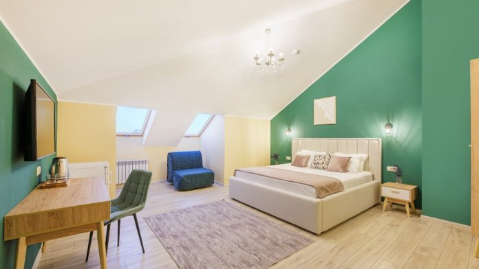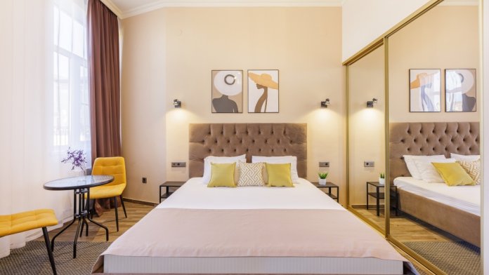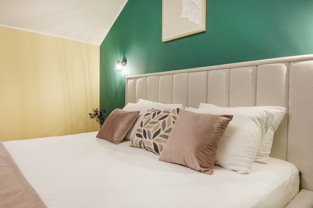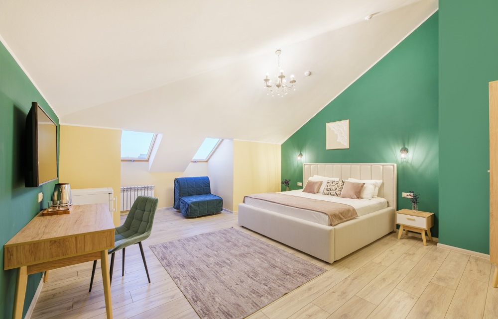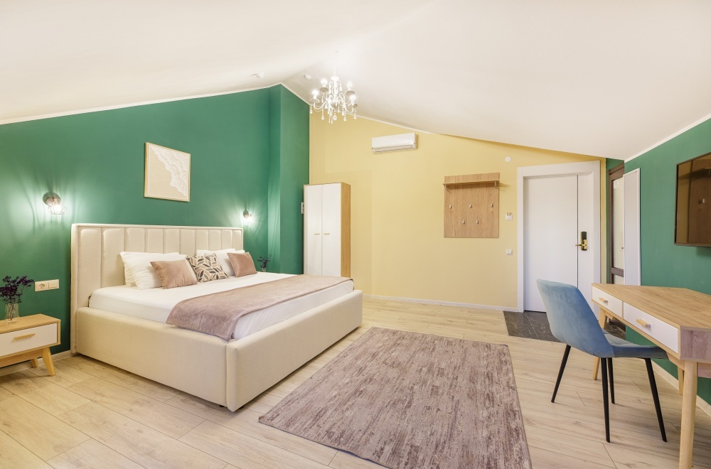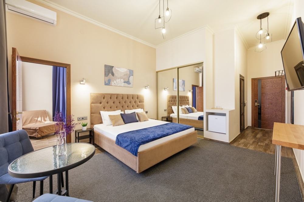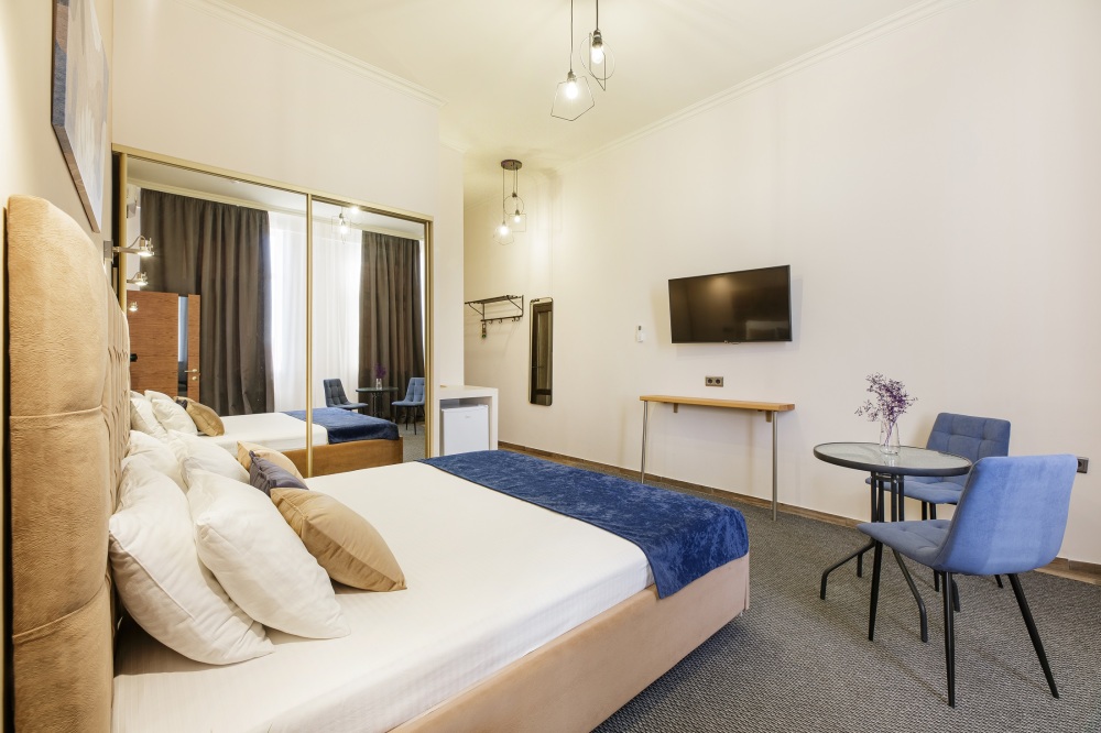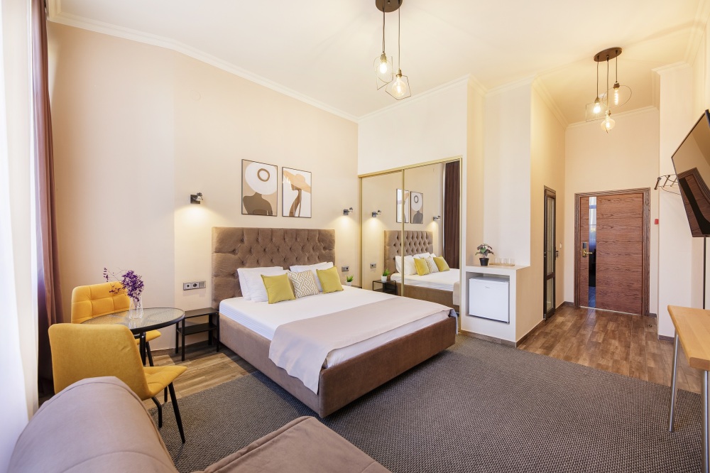Классический двухместный номер с дополнительным местом категории Стандарт идеально подойдет для уютного размещения двух-трех гостей. Большая King-size кровать с мягким изголовьем, прикроватные тумбочки, вместительный шкаф.