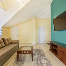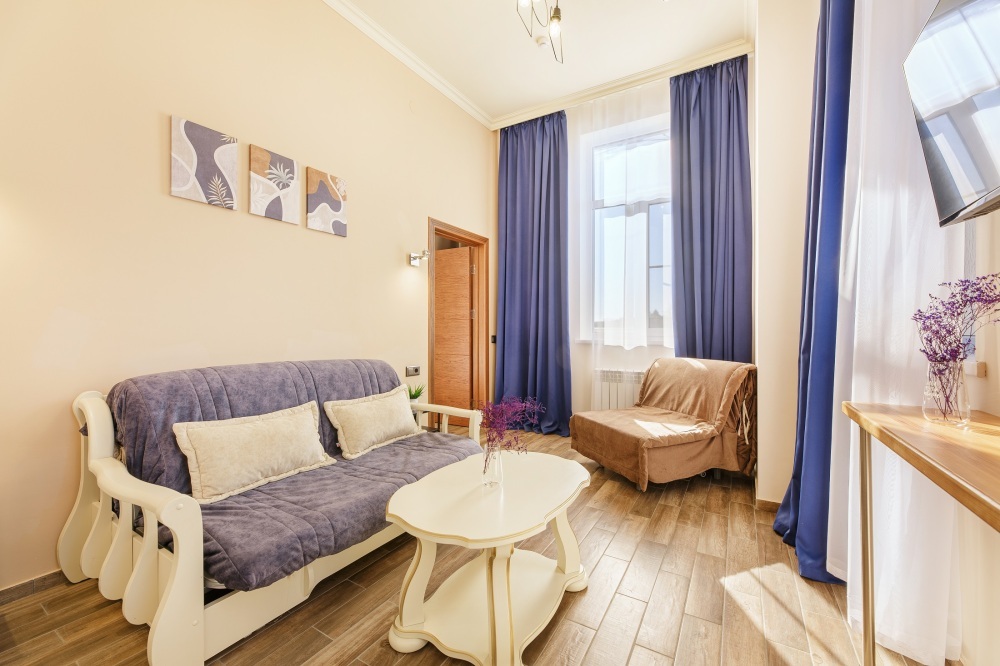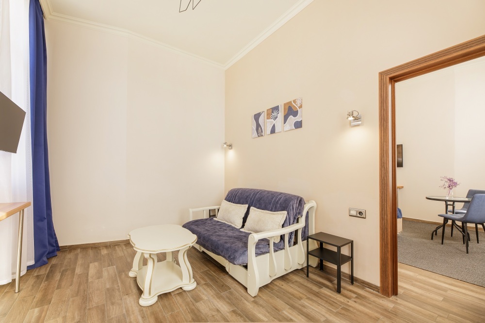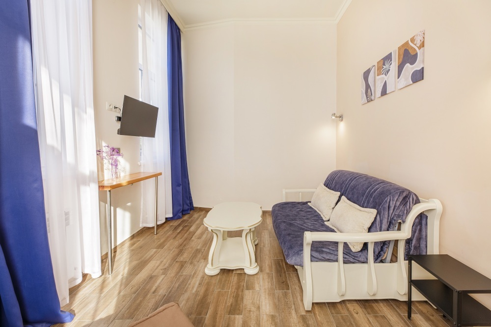 Роскошные двухкомнатные Апартаменты с панорамным видом на парк и море. Этот номер оценят любители морских пейзажей, семьи с детьми. Он идеально подойдет в качестве романтического подарка. Номер состоит из спальной комнаты, объединенной просторной гостиной. Вмещает до пяти гостей. В каждой комнате установлен телевизор и кондиционер.