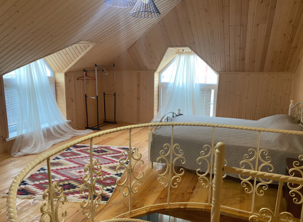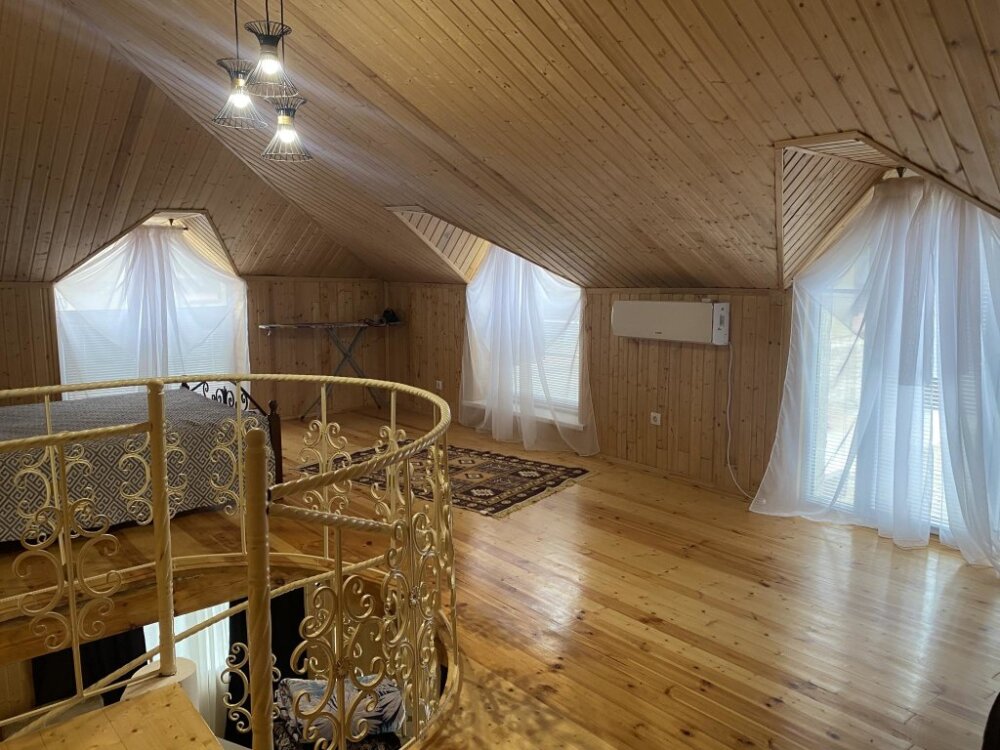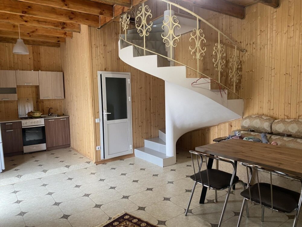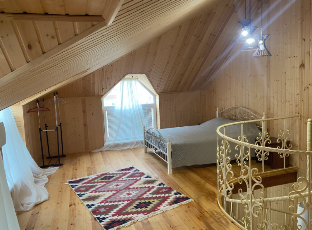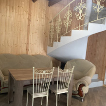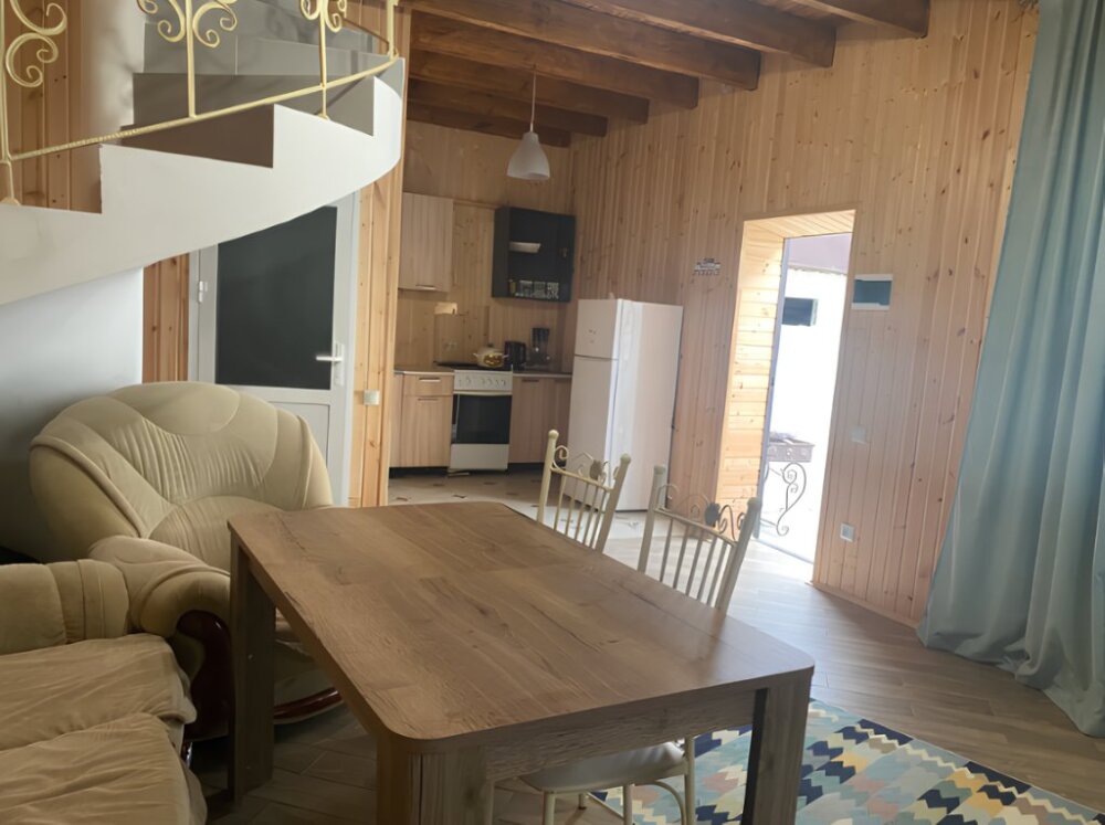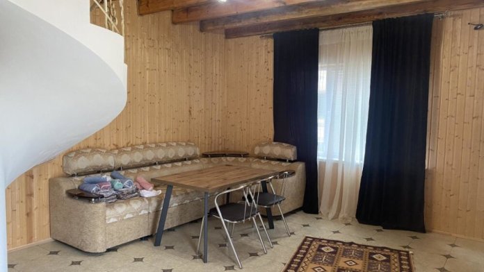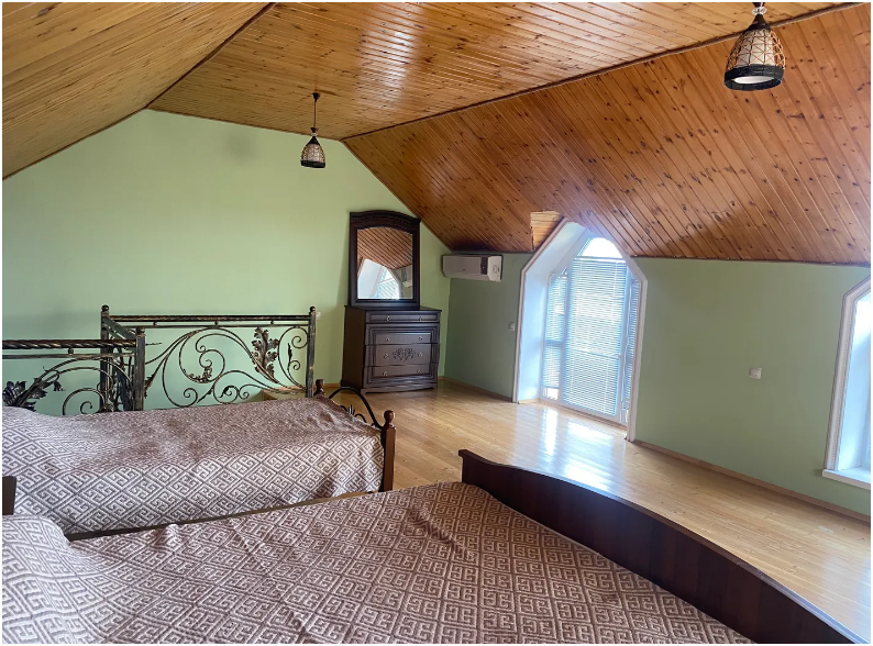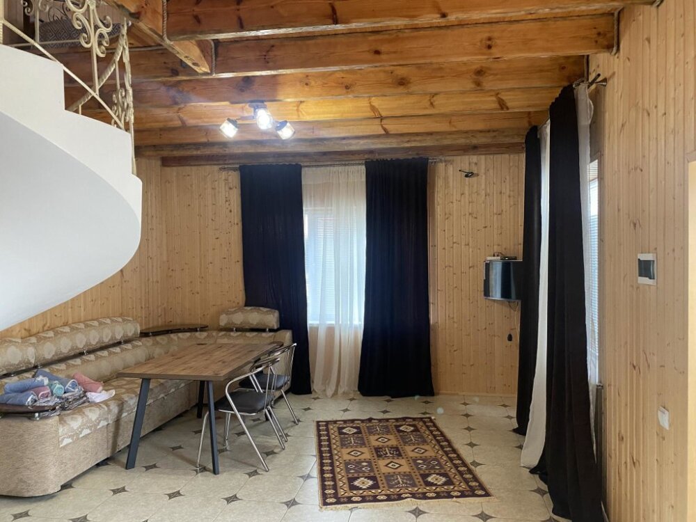 На территории располагаются 3 двухэтажных комфортабельных коттеджа. Участок огорожен. На первом этаже находится: кухня со всем необходимым, гостиная, включающая раскладной диван и два кресла, стол со стульями, телевизор, душевая с санузлом. На втором этаже просторная спальная комната с одной двухспальной кроватью, одной односпальной кроватью и комодом.