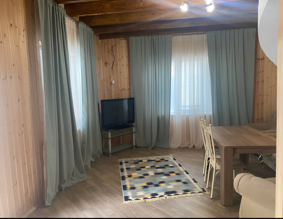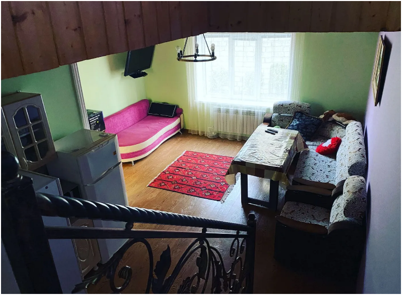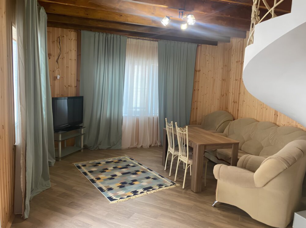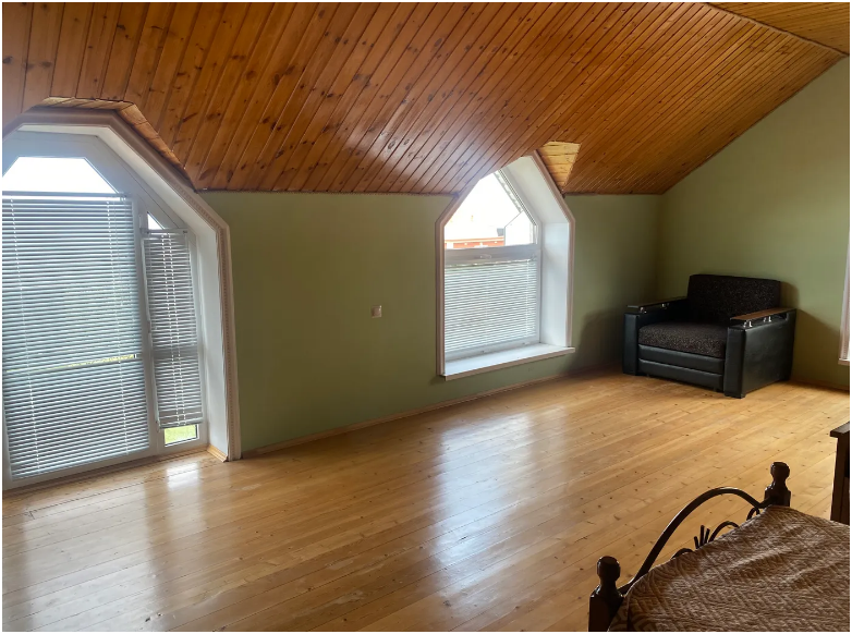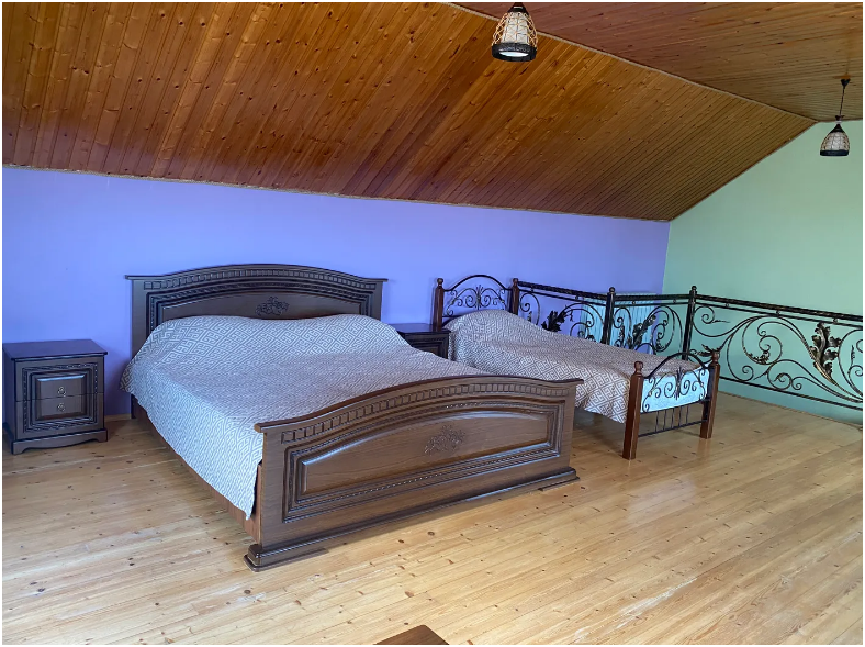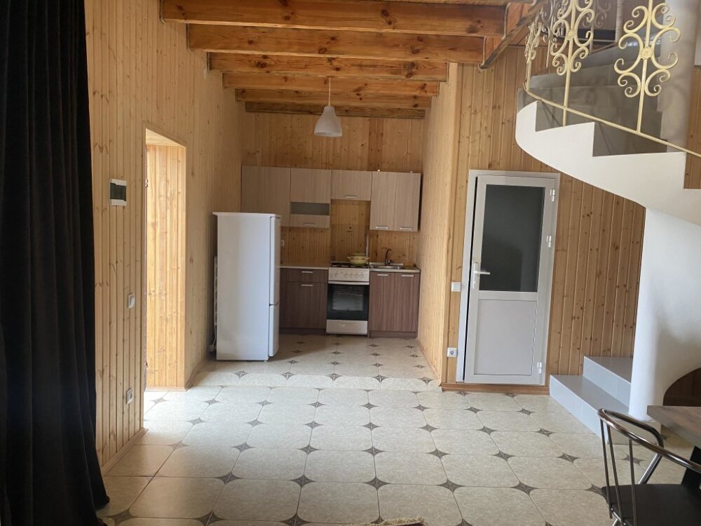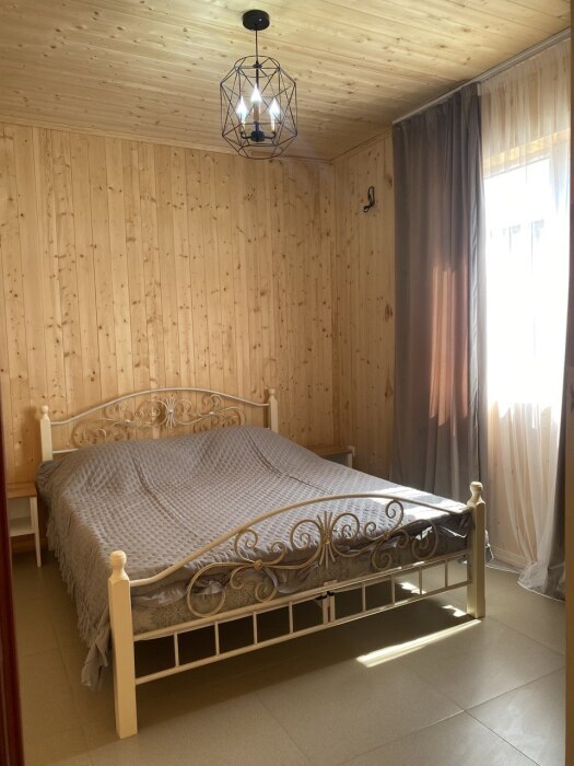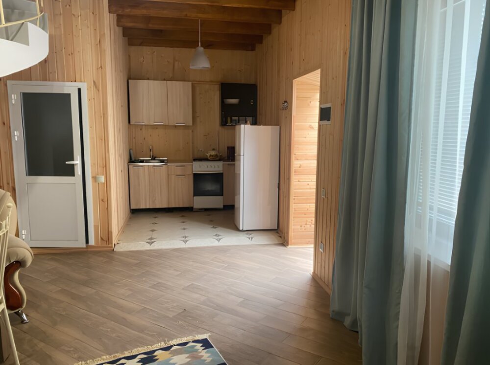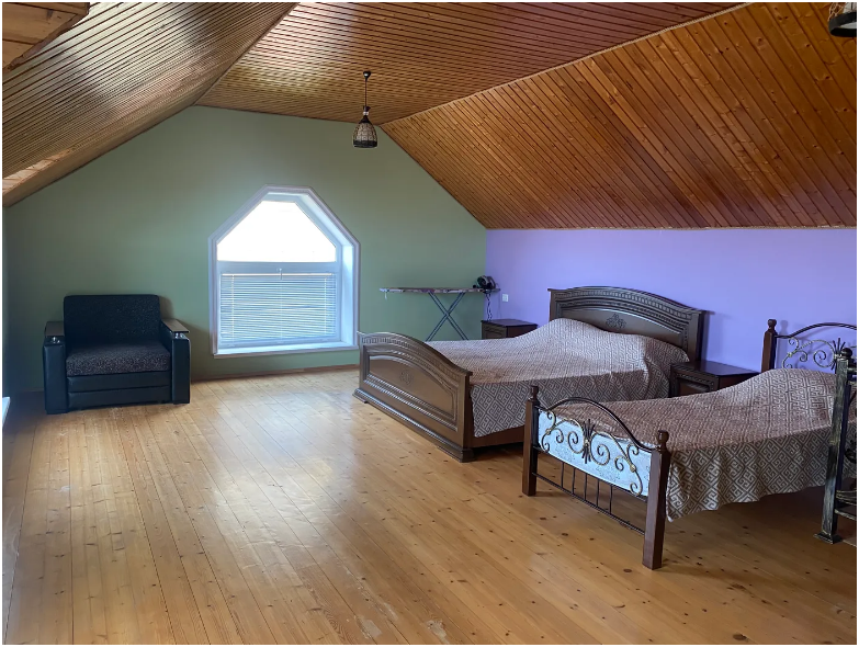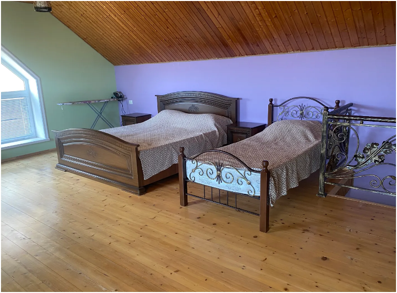 На территории располагаются 3 двухэтажных комфортабельных коттеджа. Участок огорожен. На первом этаже находится: кухня со всем необходимым, гостиная, включающая раскладной диван и два кресла, стол со стульями, телевизор, душевая с санузлом. На втором этаже просторная спальная комната с одной двухспальной кроватью, одной односпальной кроватью и комодом.
