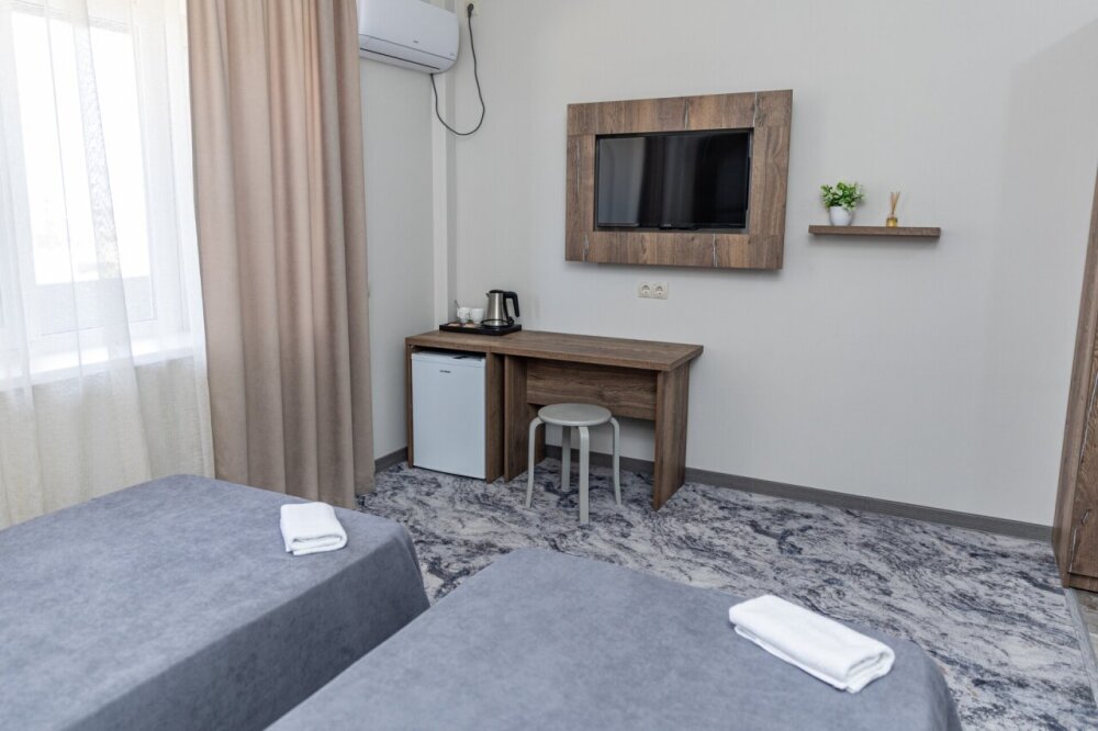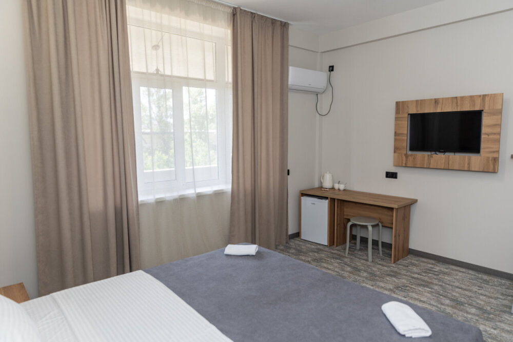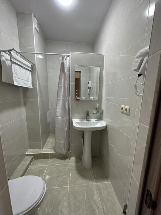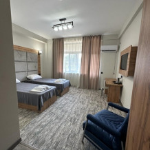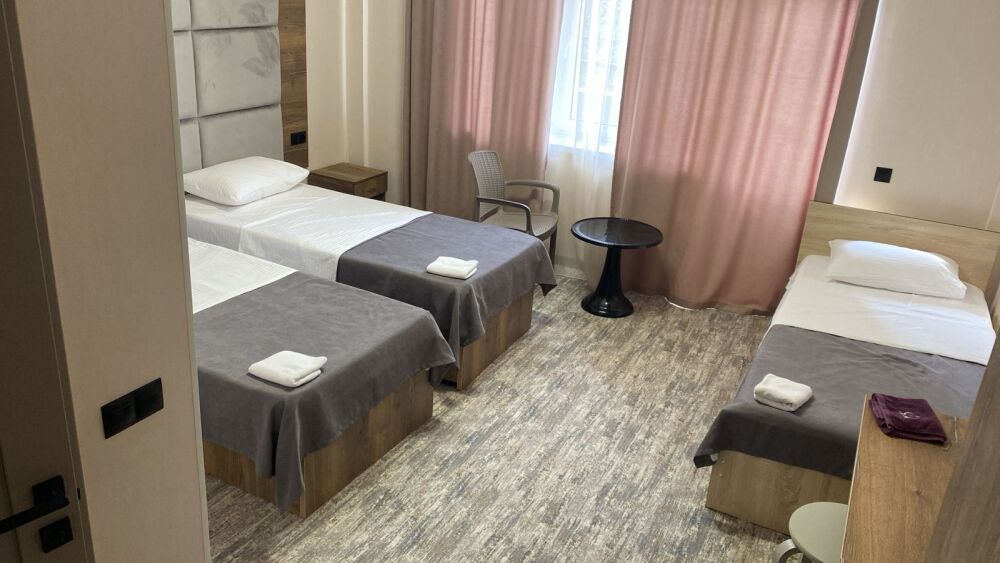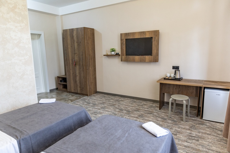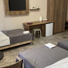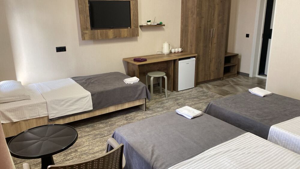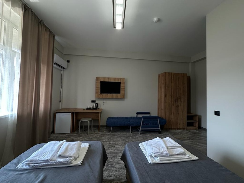 Мы отдыхали в отеле с 7 по 16 июля в составе трёх семей, и все остались очень довольны. Хочется выделить дружелюбный персонал, который всегда готов помочь и дать совет. Мы прибыли после 21:00, и несмотря на то что столовая работает с 8:00 до 21:00, нам предоставили ужин. Еда была вкусной и по разумной цене. Номера отличаются, но все хорошо оборудованы. Мы проживали в двухкомнатном номере на 3-м этаже. В гостиной был двуспальный диван, кресло-кровать, мини-кухня, электрочайник, холодильник, телевизор, кондиционер, шкаф с сейфом, тумба с зеркалом, столик со стульями и балкон. В спальне находилась большая двуспальная кровать, односпальная кровать и второй балкон. Санузел и душевая совмещены, также есть фен. В номере регулярно пополнялись расходники: мыло, гель, шампунь, кондиционер, а также были одноразовые зубные щётки. Также предоставлялись халаты и одноразовые тапочки. Уборка мусора проводилась регулярно, а полотенца и постельное бельё меняли на 6-й день. Полы, вероятно, не мылись, или мы этого не заметили. На этаже имеются микроволновая печь, гладильная доска с утюгом и кулер. Wi-Fi работает хорошо везде. На улице есть скамейки, стол и мангал для барбекю. Несмотря на то, что рядом проходит железная дорога, шум поездов нас не беспокоил. До Городского пляжа идти примерно 25 минут, а до Приморского - 12-13 минут. Мы предпочитали Городской пляж из-за его чистоты и отсутствия камней при заходе в воду, в отличие от Приморского пляжа, где мы повредили ноги. Многие ездили на пляж на такси, так как идти по жаре, особенно с детьми, довольно сложно. Такси стоит около 110-140 рублей и доезжает до пляжа за 4-5 минут. Вблизи отеля находятся магазины Магнит и Руслан, а также кафешки и лавки с фруктами, до которых идти примерно 10 минут. В целом, отель рекомендую. Если бы море было поближе, отелю не было бы цены!