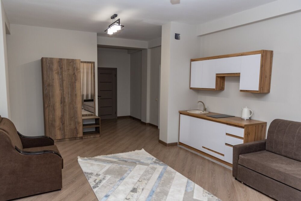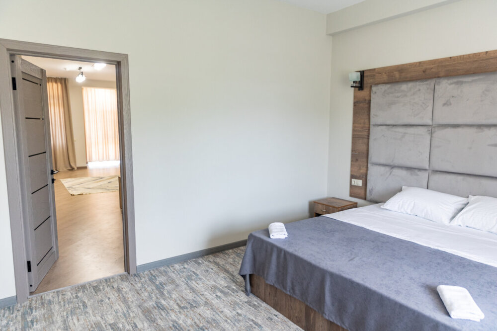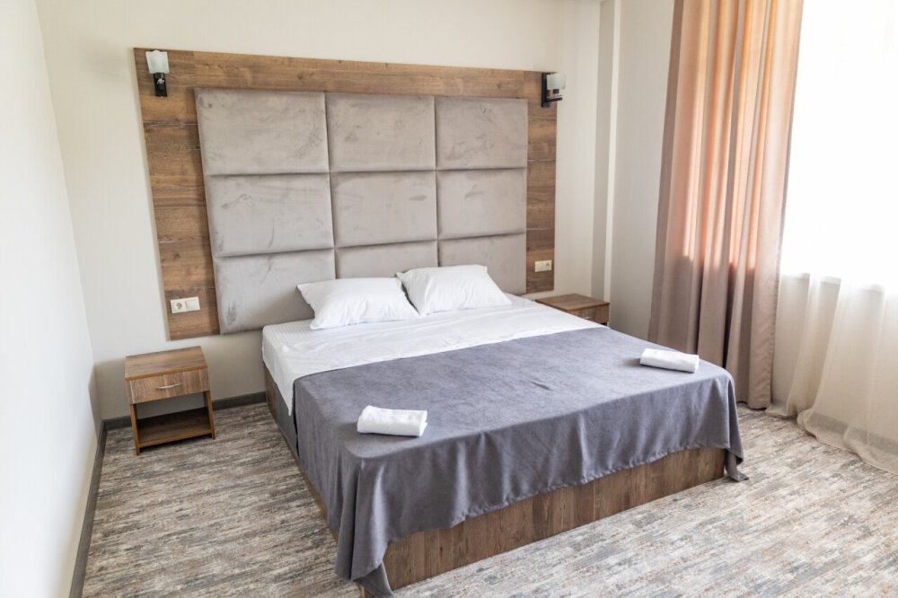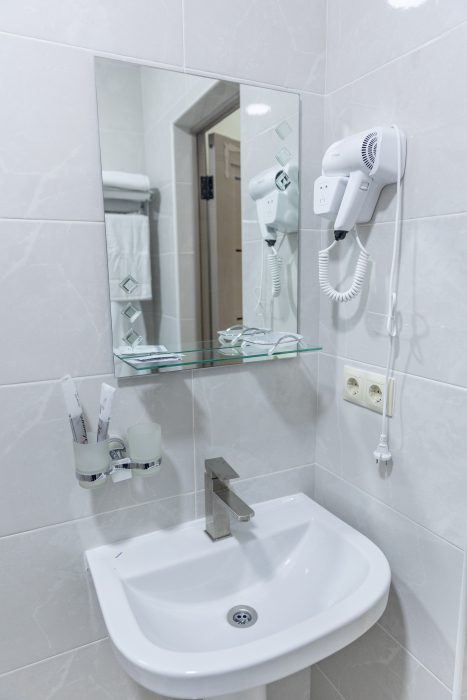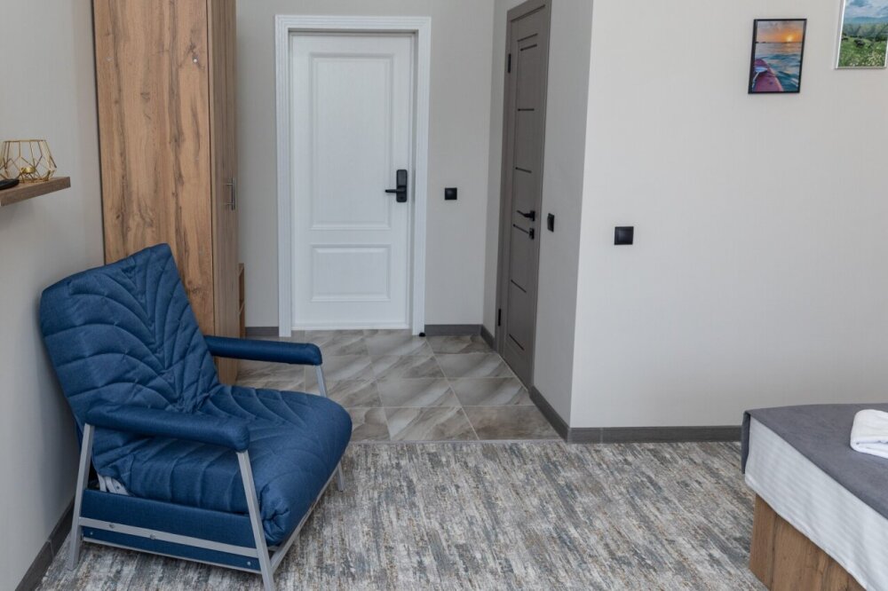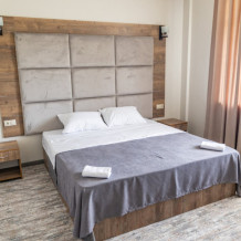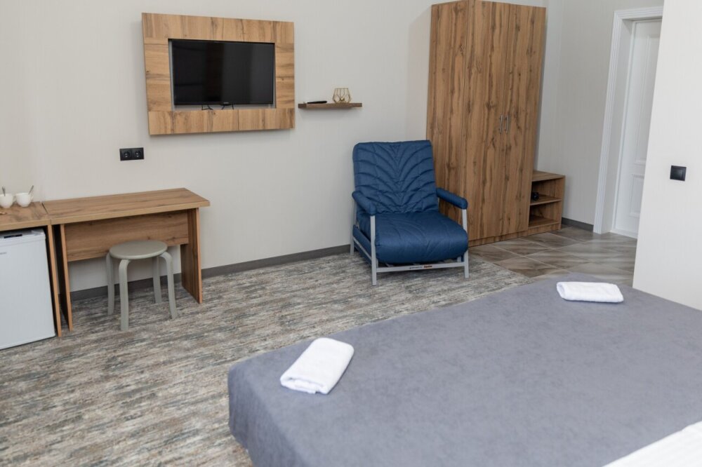 Мы отдыхали в отеле с 7 по 16 июля в составе трёх семей, и все остались очень довольны. Хочется выделить дружелюбный персонал, который всегда готов помочь и дать совет. Мы прибыли после 21:00, и несмотря на то что столовая работает с 8:00 до 21:00, нам предоставили ужин. Еда была вкусной и по разумной цене. Номера отличаются, но все хорошо оборудованы. Мы проживали в двухкомнатном номере на 3-м этаже. В гостиной был двуспальный диван, кресло-кровать, мини-кухня, электрочайник, холодильник, телевизор, кондиционер, шкаф с сейфом, тумба с зеркалом, столик со стульями и балкон. В спальне находилась большая двуспальная кровать, односпальная кровать и второй балкон. Санузел и душевая совмещены, также есть фен. В номере регулярно пополнялись расходники: мыло, гель, шампунь, кондиционер, а также были одноразовые зубные щётки. Также предоставлялись халаты и одноразовые тапочки. Уборка мусора проводилась регулярно, а полотенца и постельное бельё меняли на 6-й день. Полы, вероятно, не мылись, или мы этого не заметили. На этаже имеются микроволновая печь, гладильная доска с утюгом и кулер. Wi-Fi работает хорошо везде. На улице есть скамейки, стол и мангал для барбекю. Несмотря на то, что рядом проходит железная дорога, шум поездов нас не беспокоил. До Городского пляжа идти примерно 25 минут, а до Приморского - 12-13 минут. Мы предпочитали Городской пляж из-за его чистоты и отсутствия камней при заходе в воду, в отличие от Приморского пляжа, где мы повредили ноги. Многие ездили на пляж на такси, так как идти по жаре, особенно с детьми, довольно сложно. Такси стоит около 110-140 рублей и доезжает до пляжа за 4-5 минут. Вблизи отеля находятся магазины Магнит и Руслан, а также кафешки и лавки с фруктами, до которых идти примерно 10 минут. В целом, отель рекомендую. Если бы море было поближе, отелю не было бы цены!