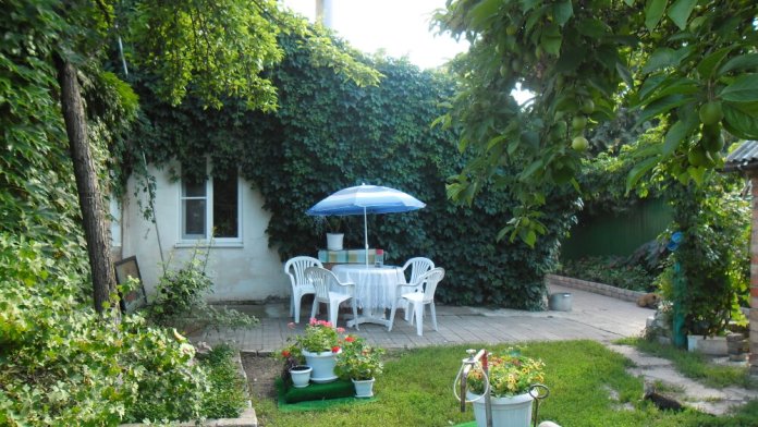 При доме большой зелёный двор, сад. В саду есть мангал, гамак, качели, песочница, игрушки для детей, лавочка, лежанка для загара, раскладушка. Во дворе отдыхает только одна семья отдыхающих.