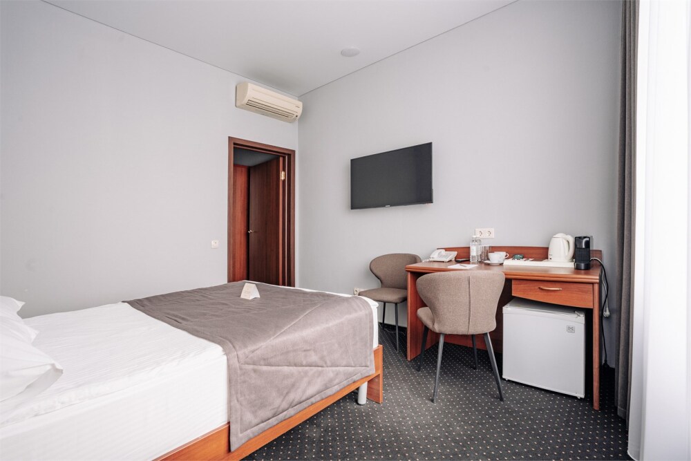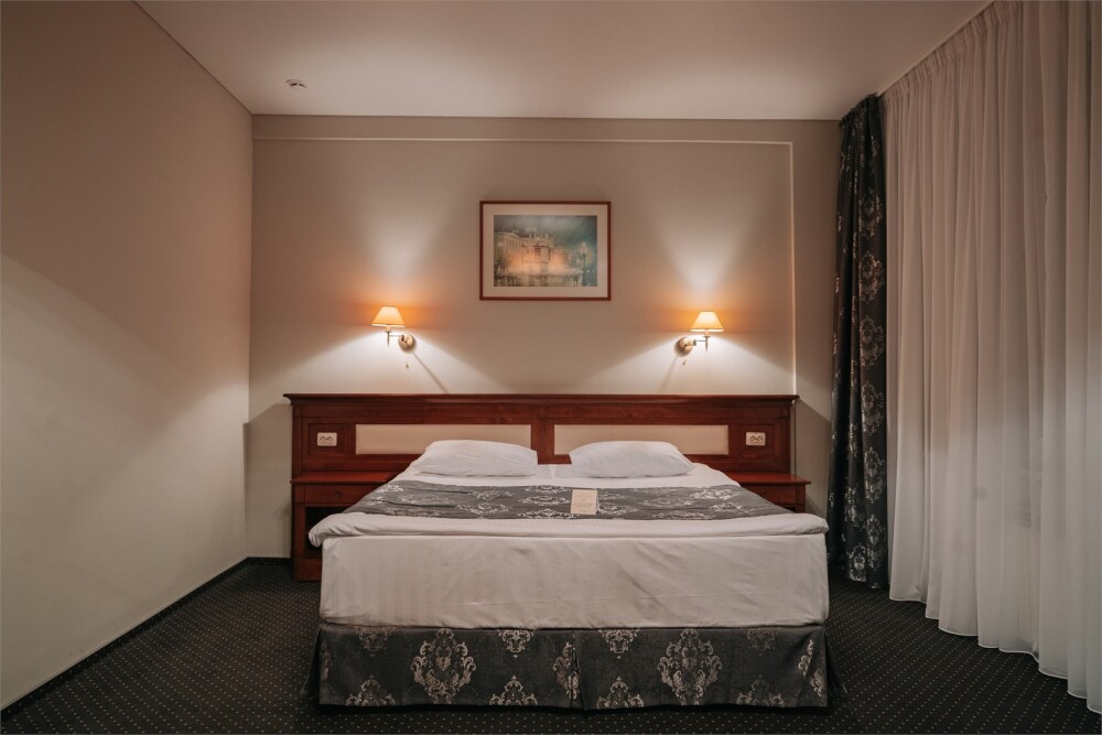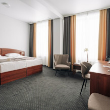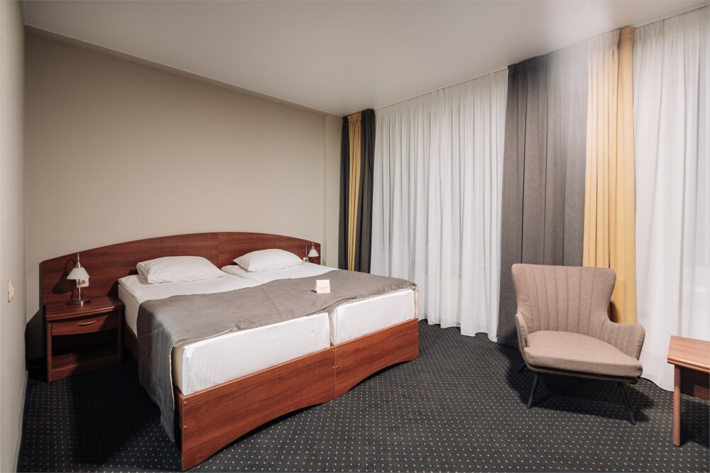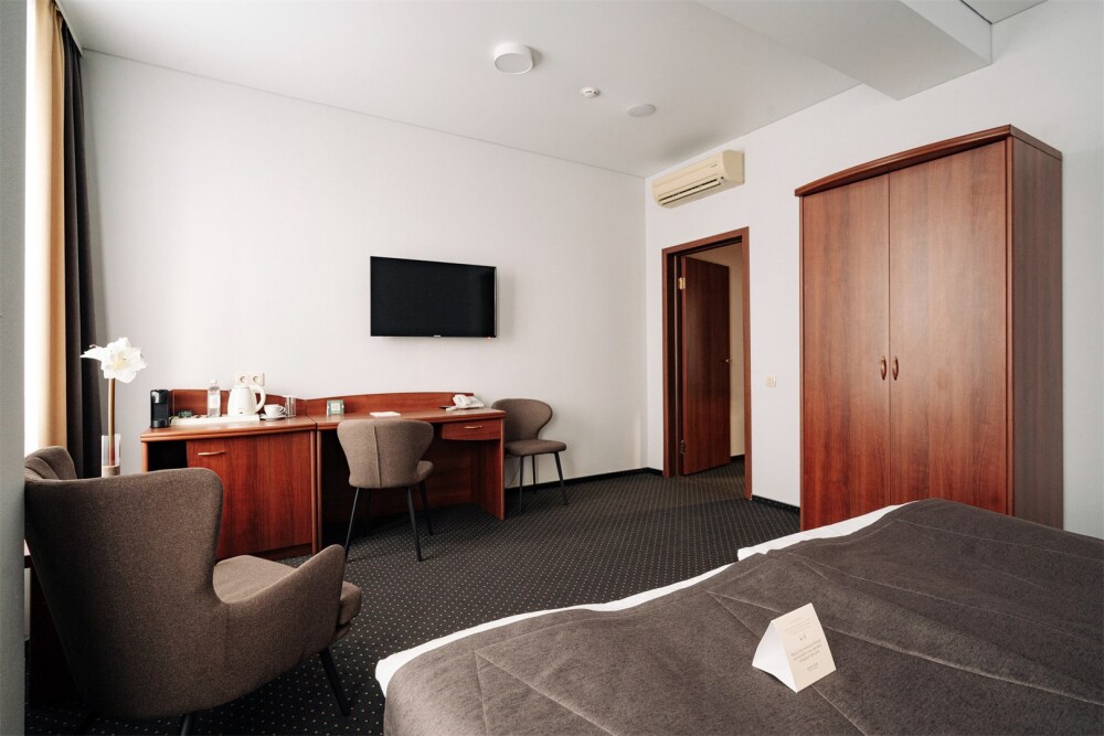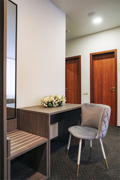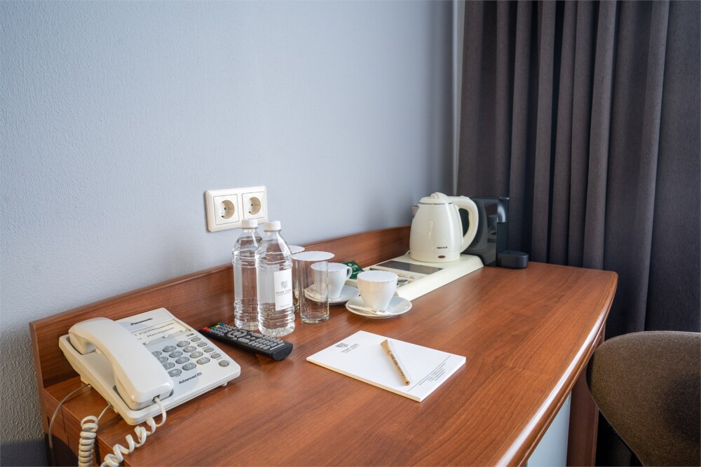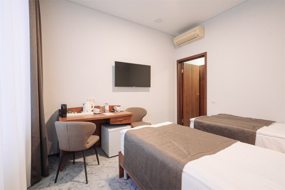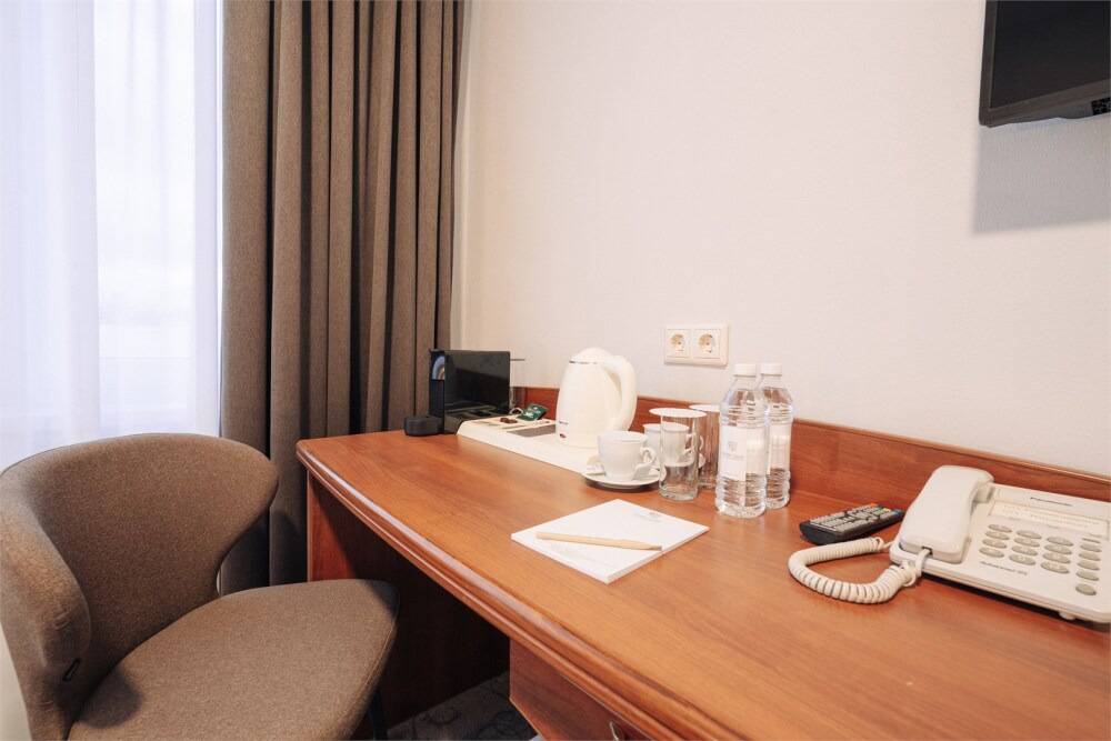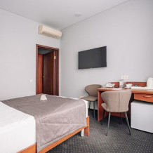 Просторная комната, оснащенная современной мебелью, чайной станцией, кофе машиной, выполнена в теплых пастельных тонах. В каждом номере халат и тапочки, французская гипоаллергенная косметика; позволит гостям в полной мере насладиться отдыхом.