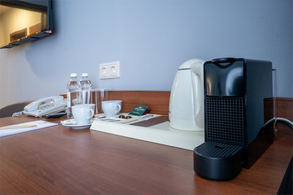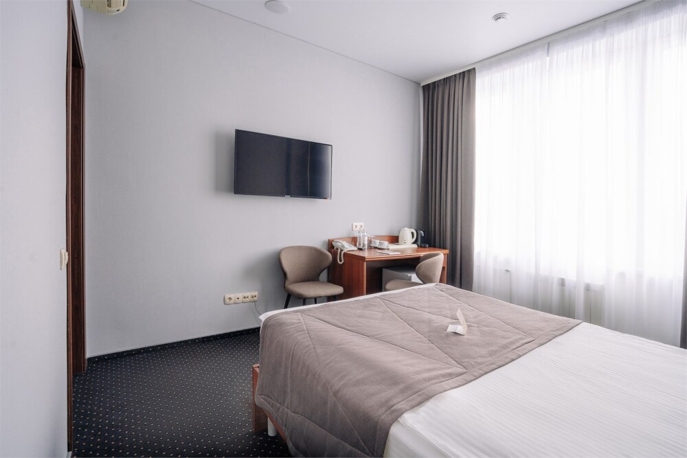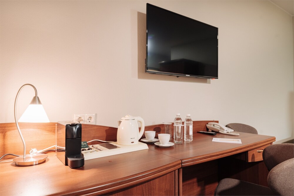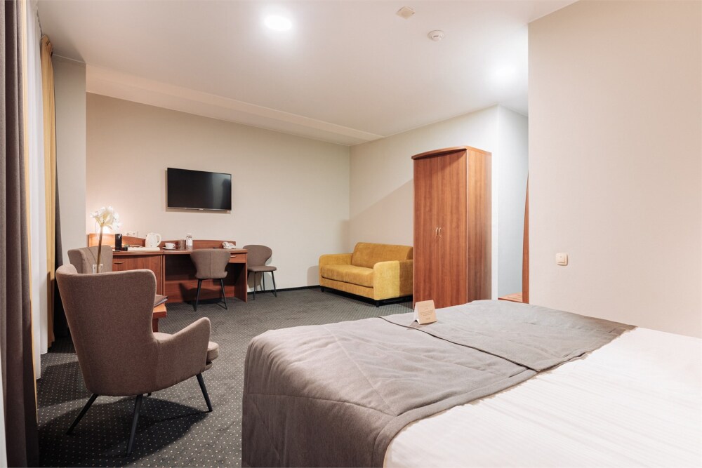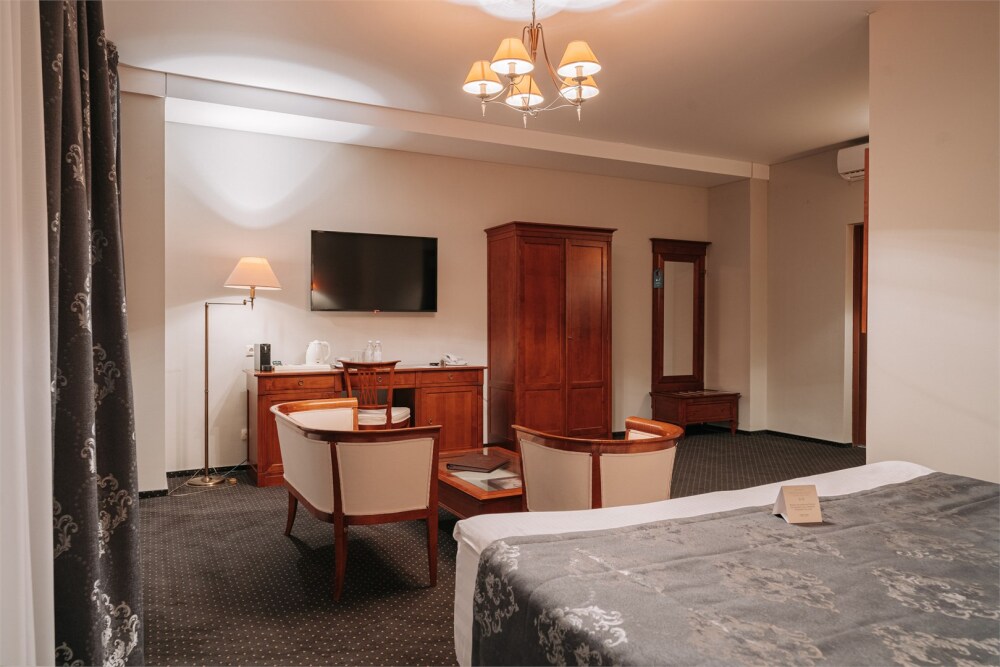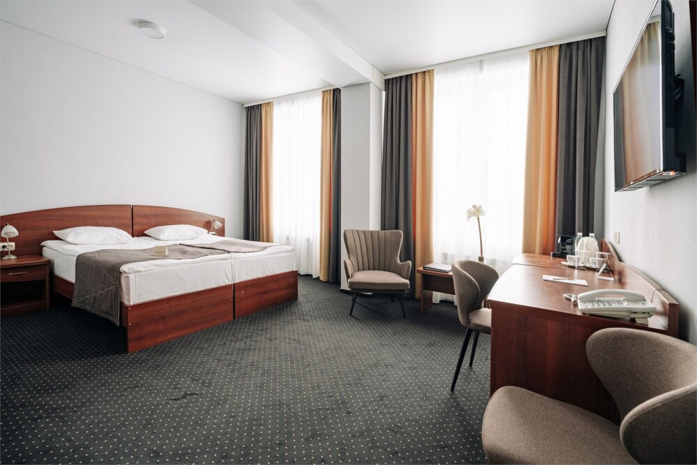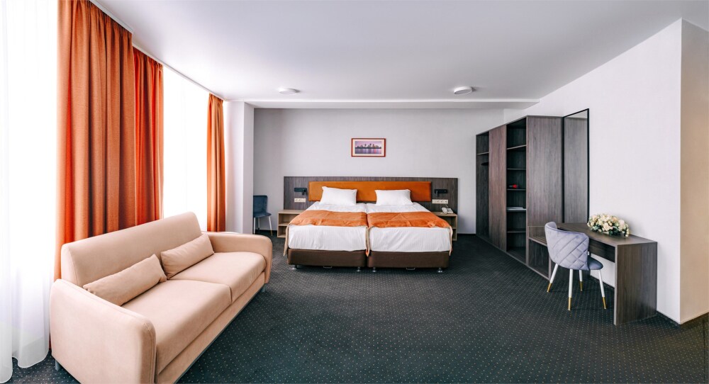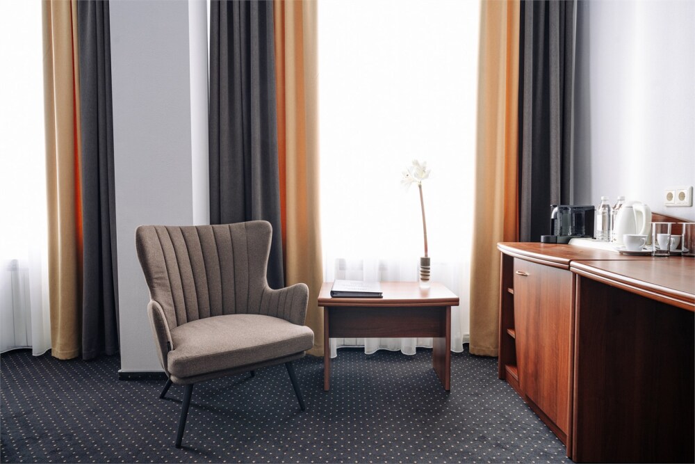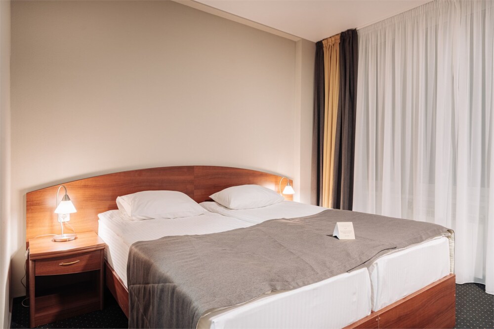 Просторная комната, оснащенная современной мебелью, чайной станцией, кофе машиной, выполнена в теплых пастельных тонах. В каждом номере халат и тапочки, французская гипоаллергенная косметика; позволит гостям в полной мере насладиться отдыхом.