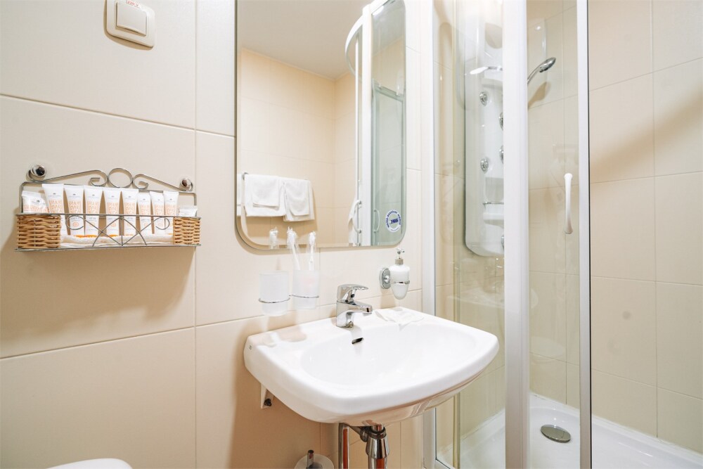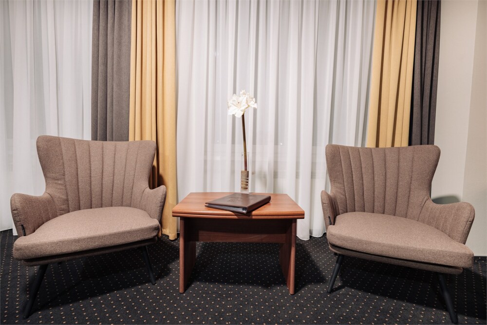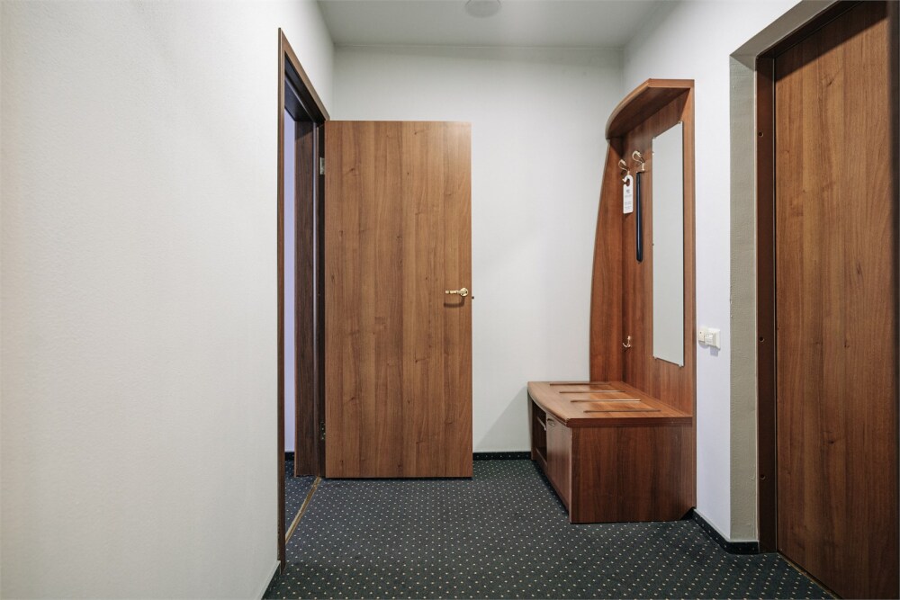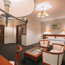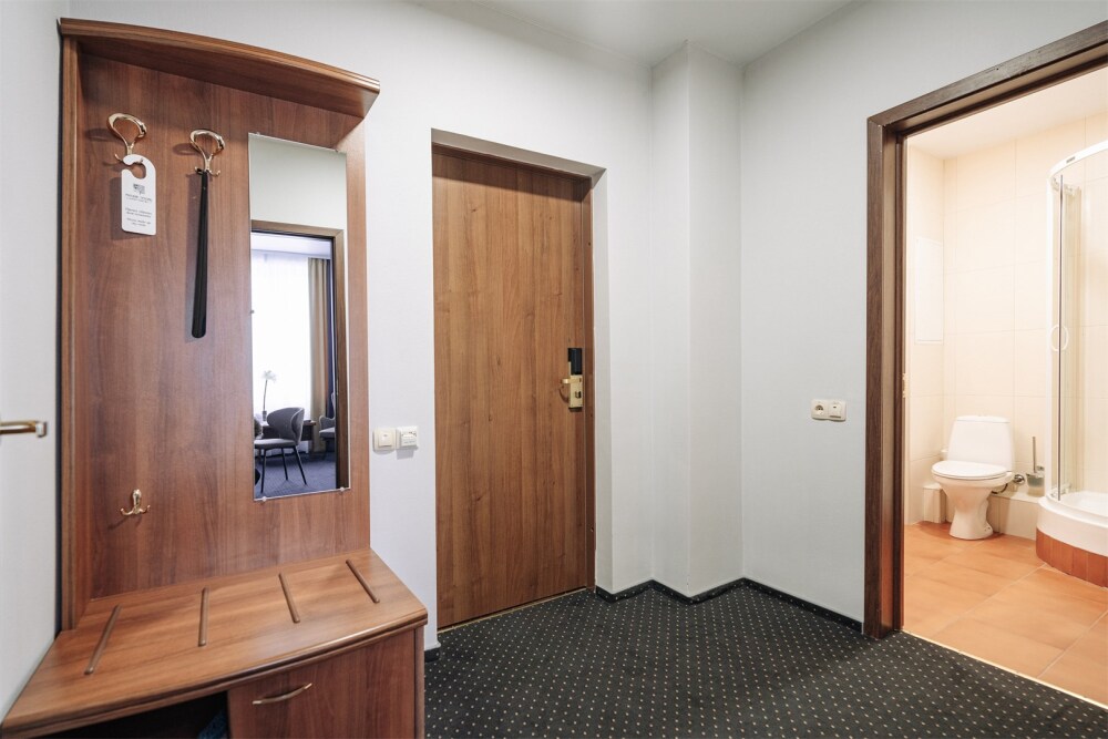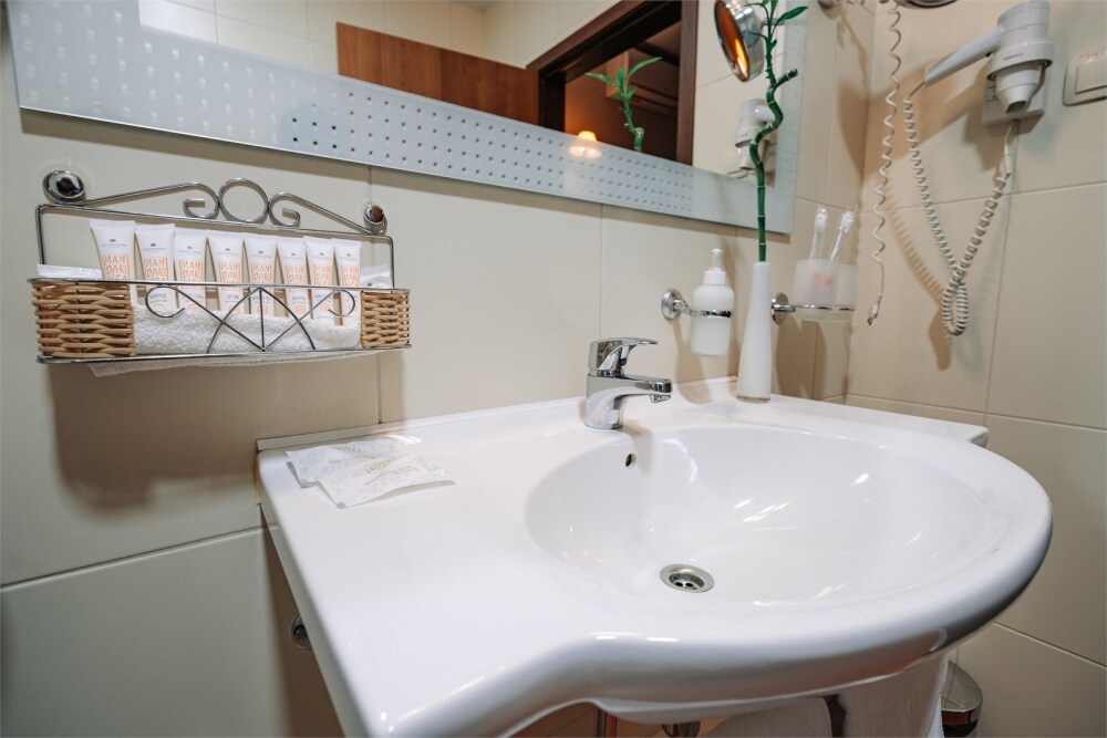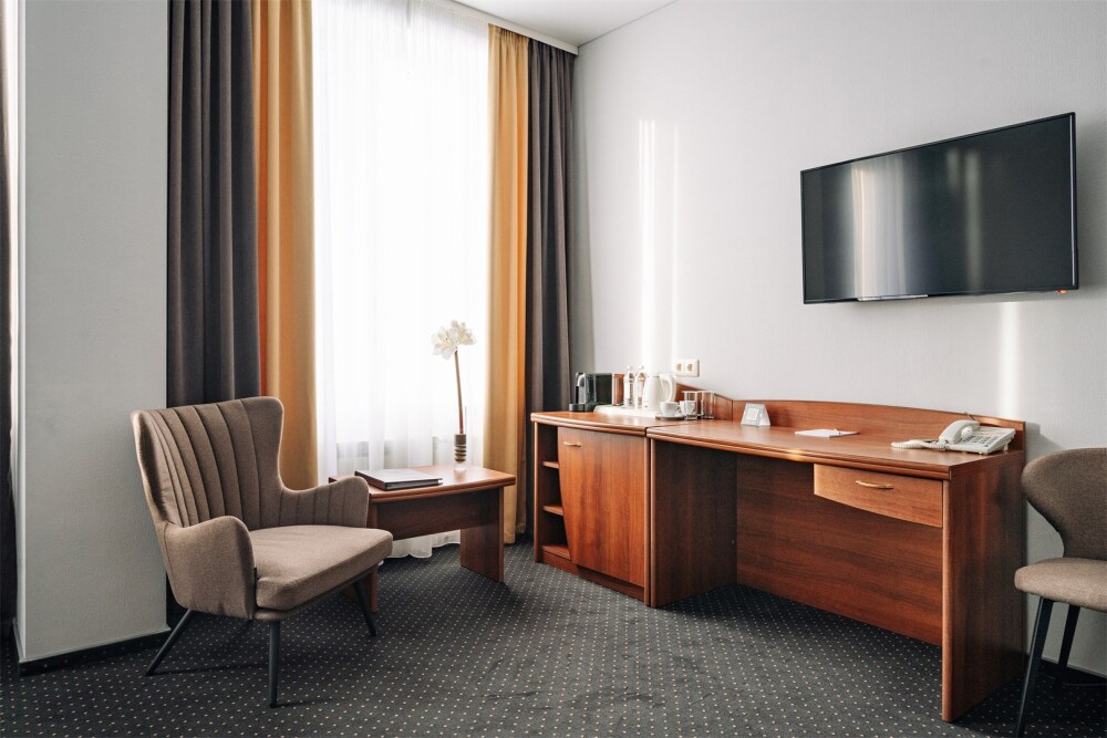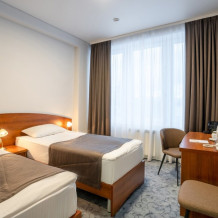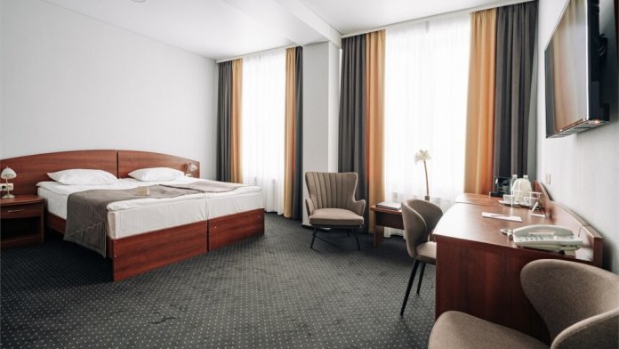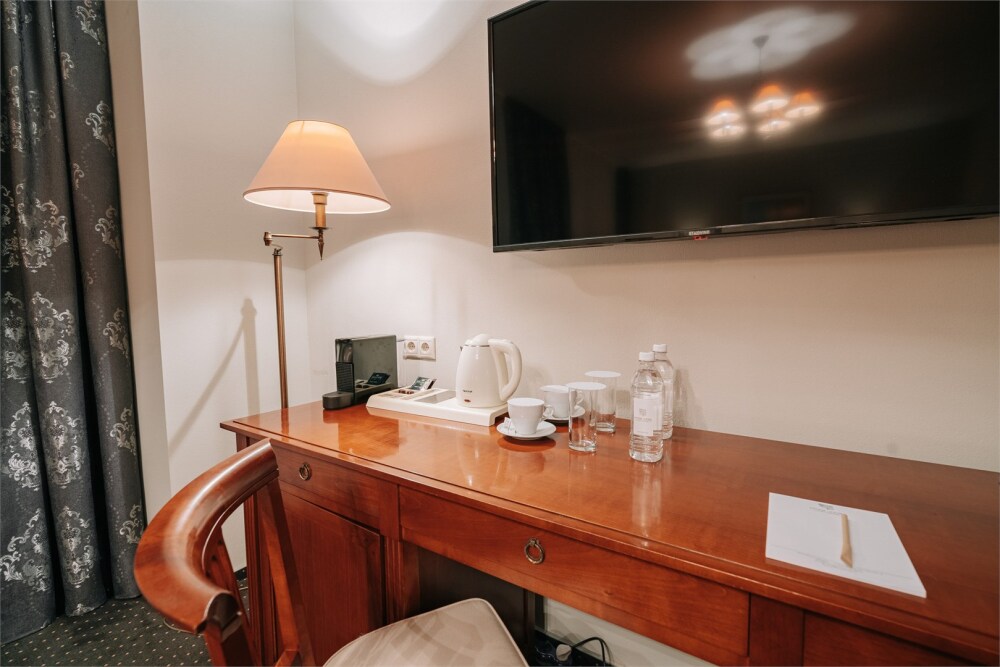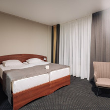 Просторная комната, оснащенная современной мебелью, чайной станцией, кофе машиной, выполнена в теплых пастельных тонах. В каждом номере халат и тапочки, французская гипоаллергенная косметика; позволит гостям в полной мере насладиться отдыхом.