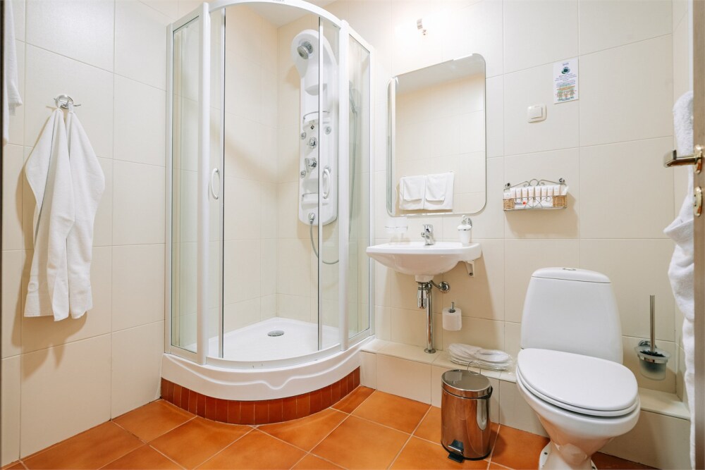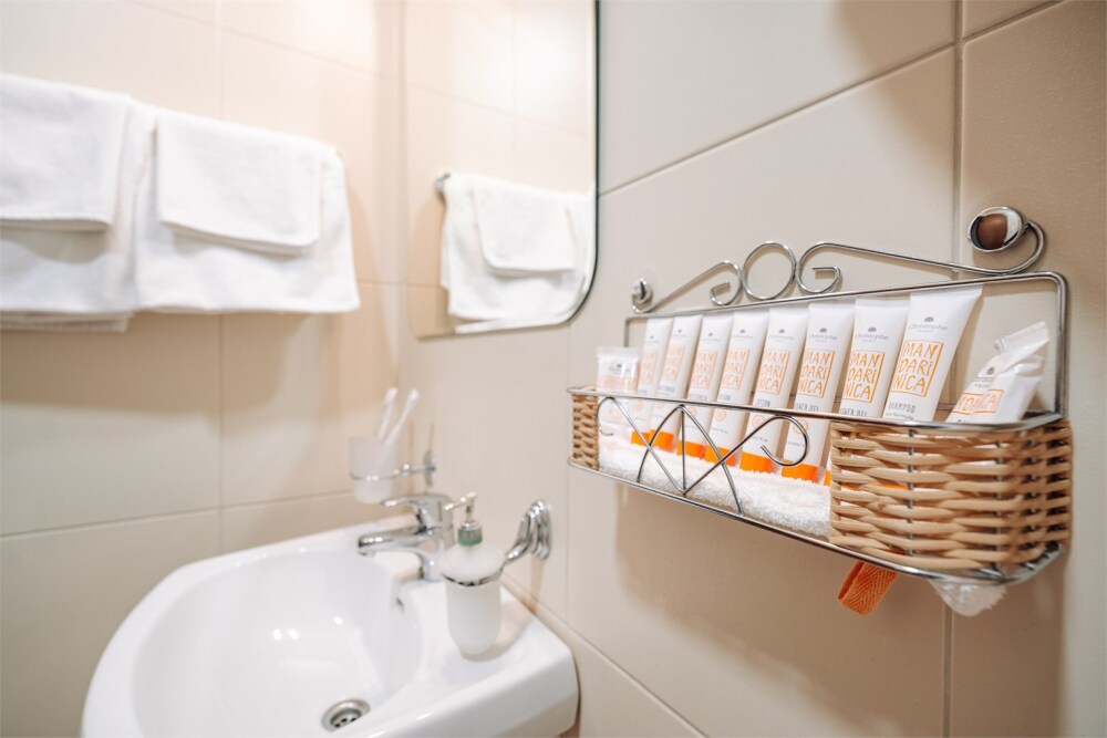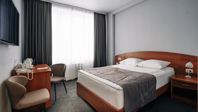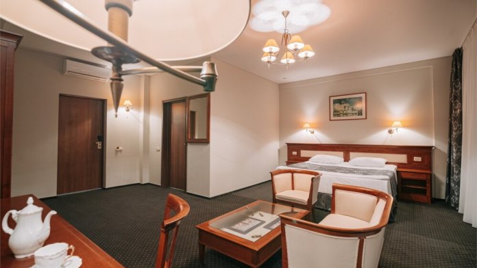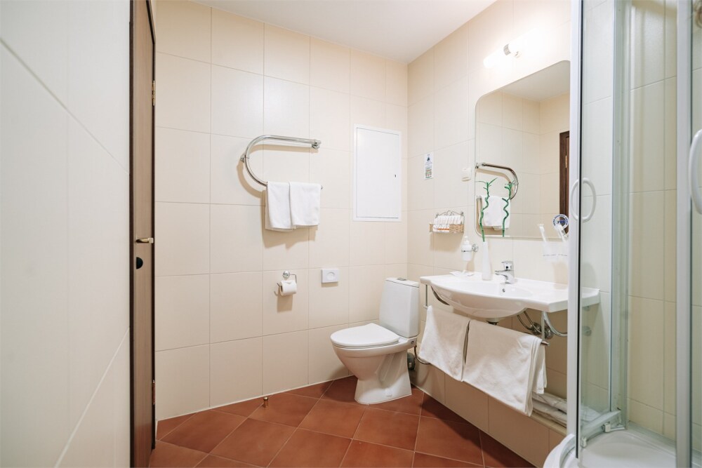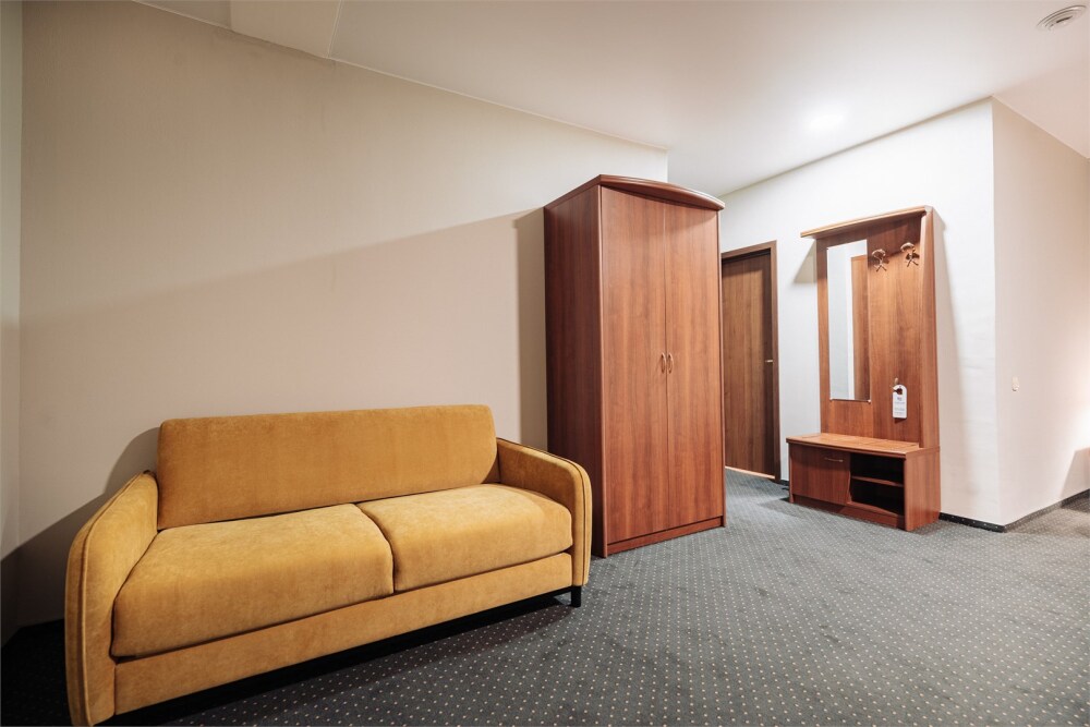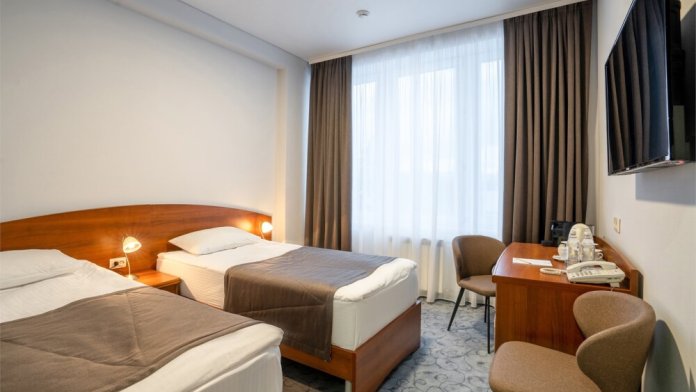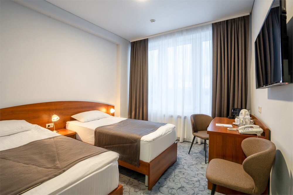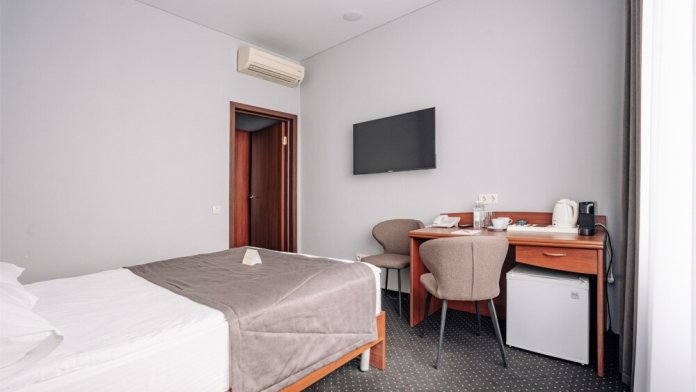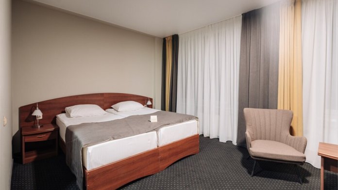 Просторная комната, оснащенная современной мебелью, чайной станцией, выполнена в теплых пастельных тонах. В каждом номере халат и тапочки, французская гипоаллергенная косметика; позволит гостям в полной мере насладиться отдыхом.