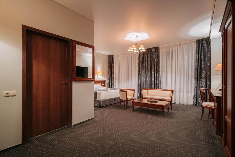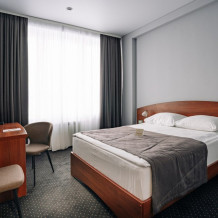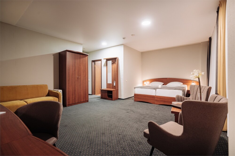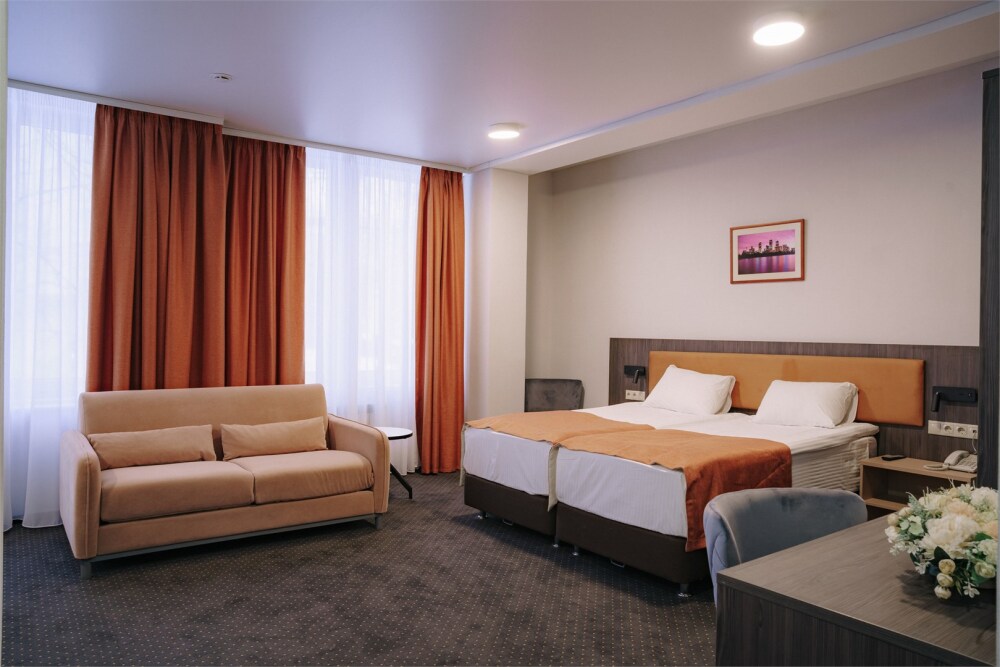 Оригинальный дизайн номеров этой категории удовлетворит пожелания самых взыскательных гостей. Большие обзорные окна делают номер еще более просторным и светлым. Номер оборудован чайной станцией, кофе машиной, выполнен в теплых пастельных тонах. В каждом номере халат и тапочки, французская гипоаллергенная косметика; позволит гостям в полной мере насладиться отдыхом.