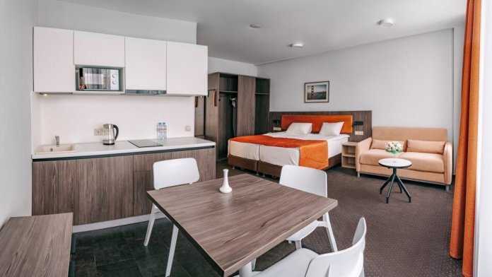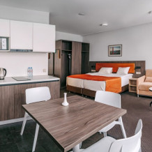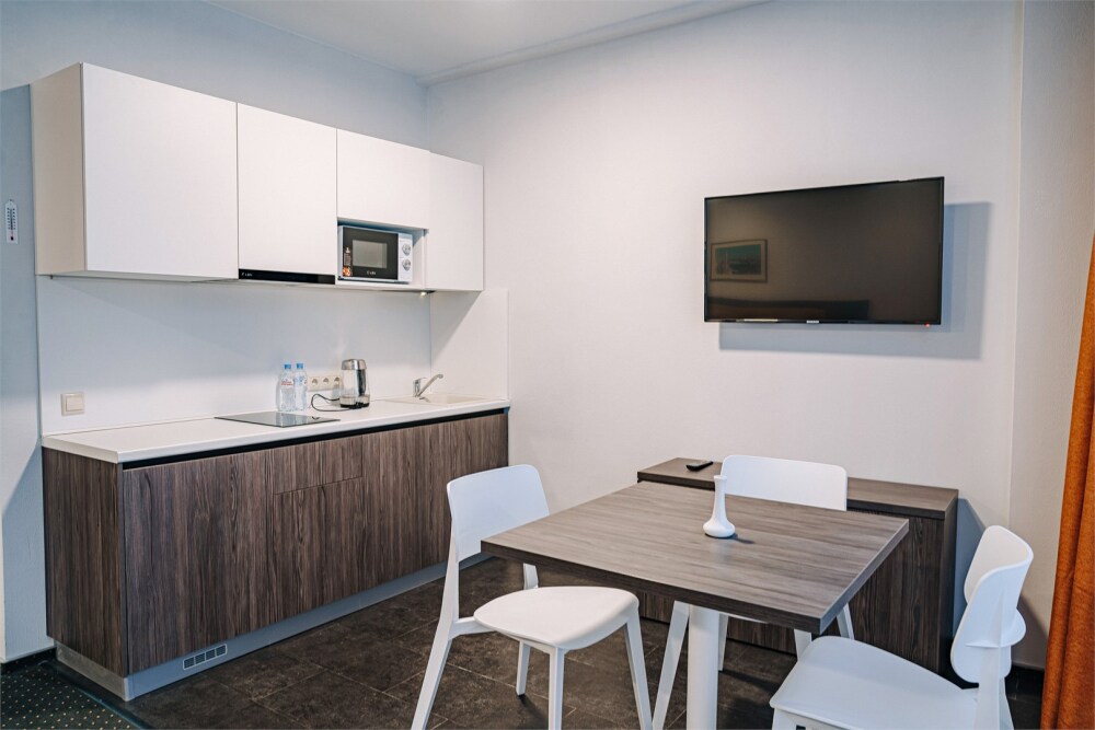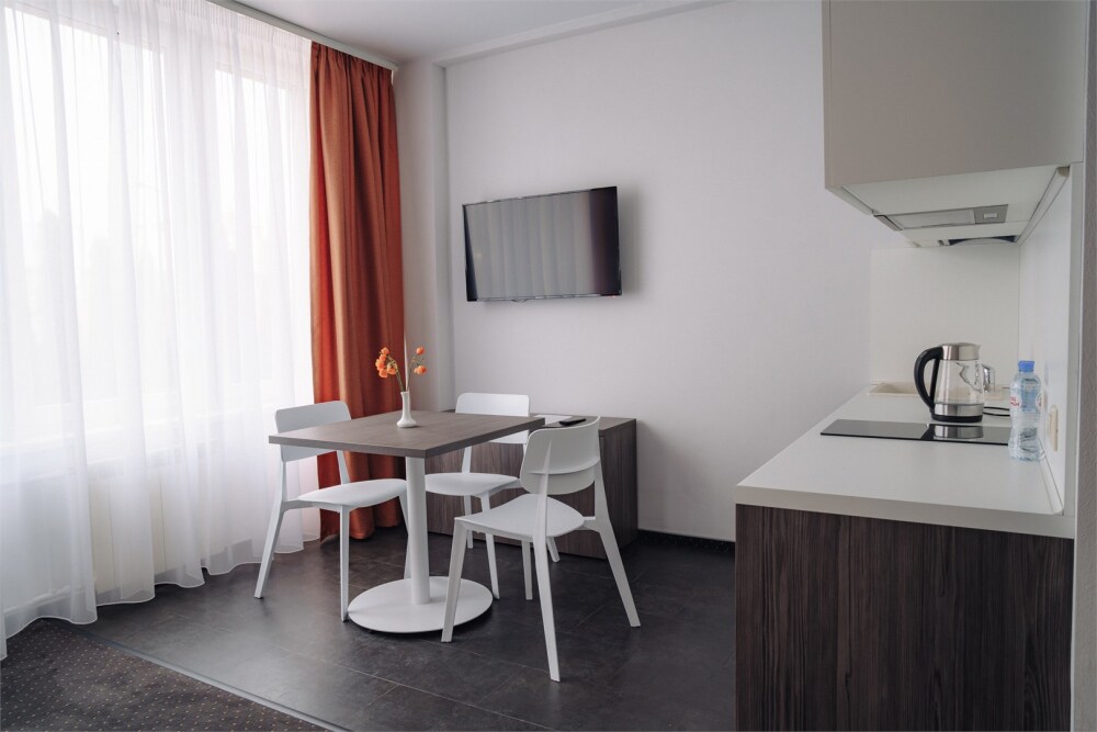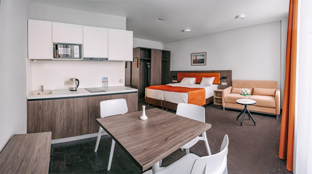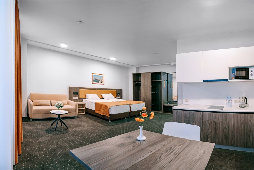 Просторный многофункциональный однокомнатный номер категории студия с кухней, европейский дизайн, подходит для комфортного размещения, в том числе для длительного проживания.