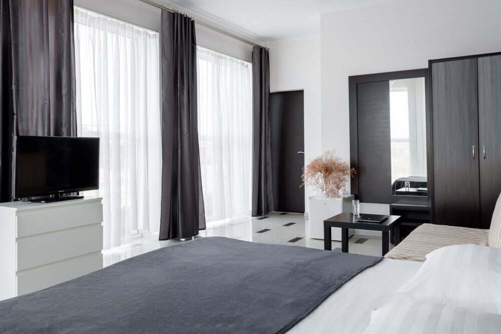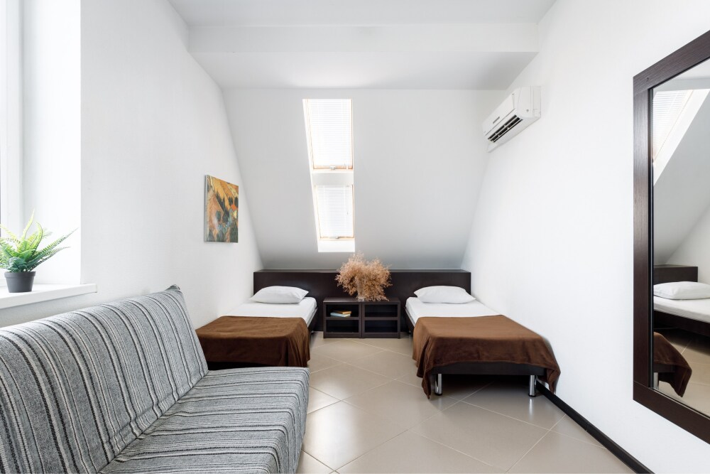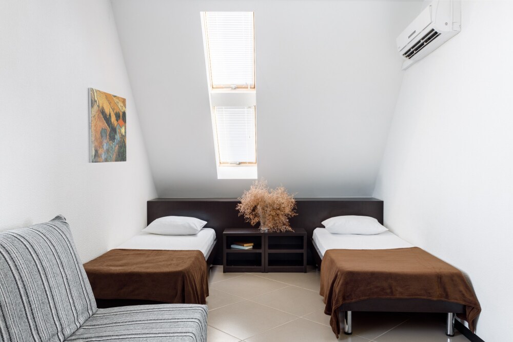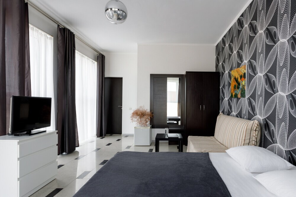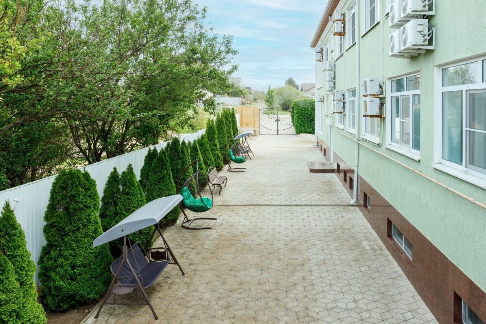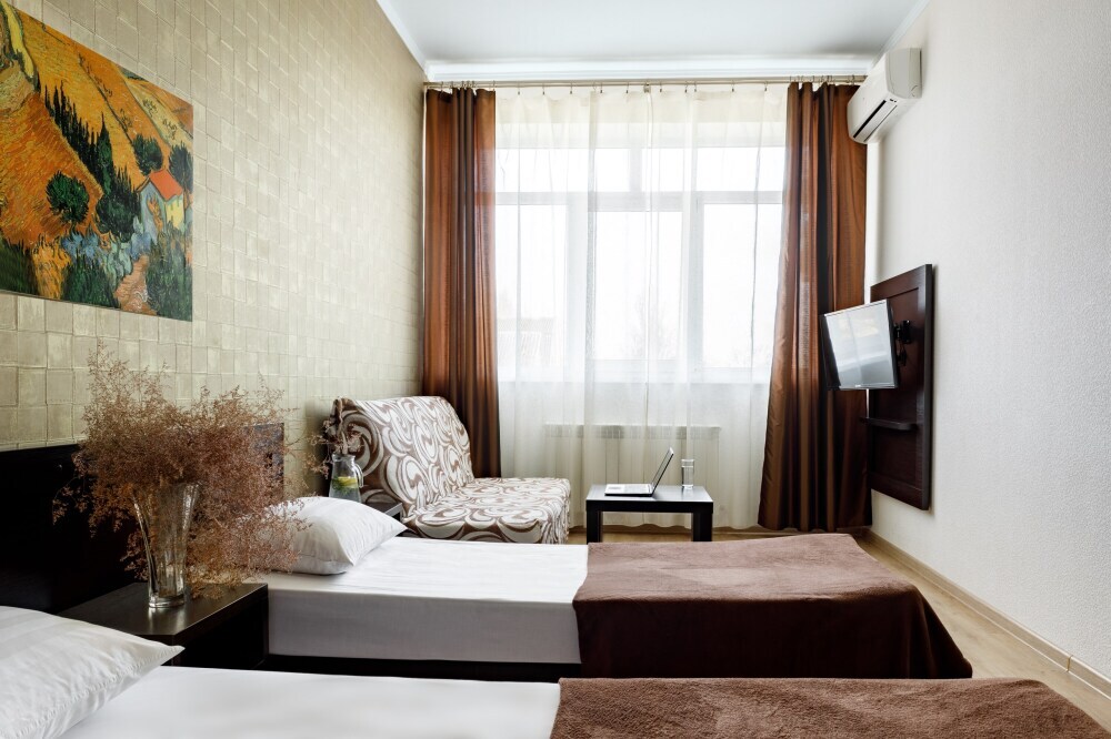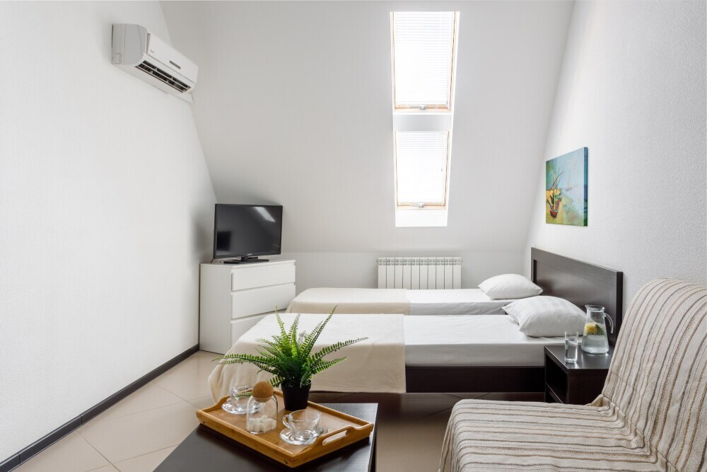 Для гостей благоустроенная и закрытая территория, где расположен 4-х этажный корпус. Все номера с удобствами и ремонтом с 1 по 3 этажи. В отеле три категории номеров: Стандарт, Комфорт и Семейный 2-комнатный. Питьевая вода в кулере на каждом этаже. Гладильная доска и утюг расположены на 1 и 3 этажах. Прокат для детей (бесплатно): детская кроватка, ванночка, горшки и стульчики для кормления.