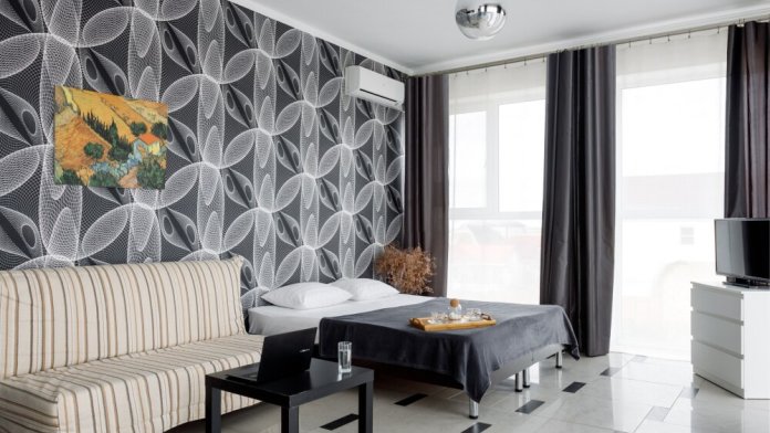 В первой комнате: две односпальные кровати или одна двуспальная кровать, диван, шкаф, две прикроватные тумбочки, столик, зеркало, сплит-система, ЖК телевизор, постельное бельё. Во второй комнате: две односпальные кровати, шкаф, две прикроватные тумбочки, сплит система, постельное бельё.