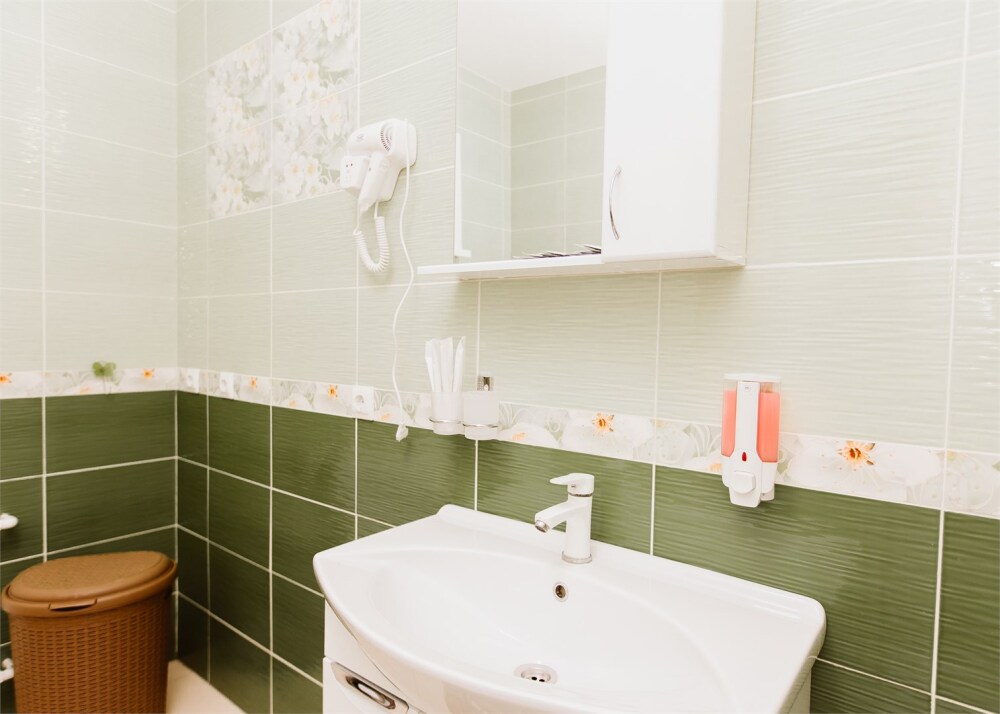 Ванная комната: ванная, раковина, туалет; набор гигиены ( гель для душа , шампунь, и кондиционер для волос, зубной набор, мыло, туалетная бумага), фен для волос.