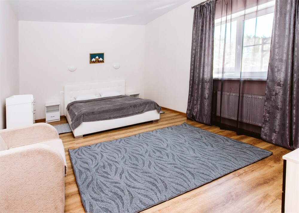 - Апартаменты Катунь - спальня, гостиная, кухня, терраса с видом на горы и реку.