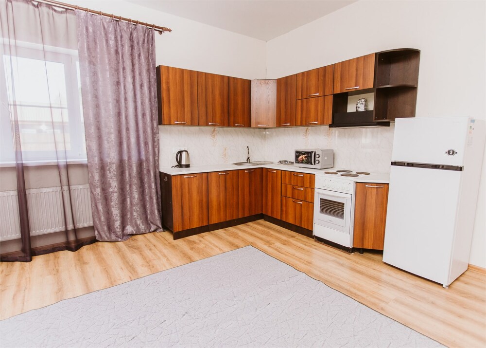 Кухня оборудованная (большой холодильник, чайник, плита для приготовления пищи, микроволновая печь, необходимая посуда).