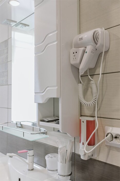 Белоснежное постельное белье, комплект полотенец, одноразовые тапочки. В ванной комнате душевая кабина и туалет, набор гигиены (гель для душа, шампунь и кондиционер для волос, зубной набор, мыло, туалетная бумага), фен для волос.