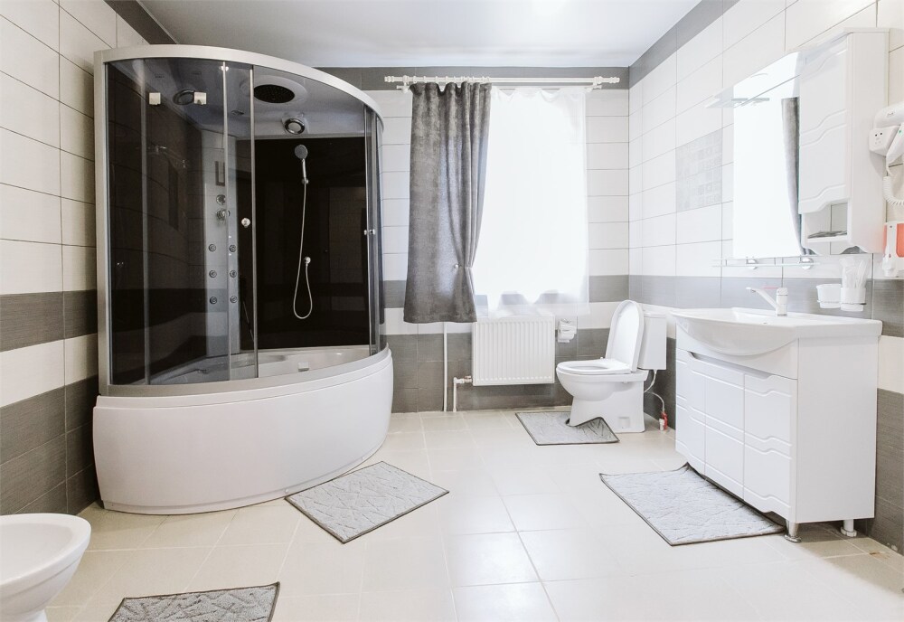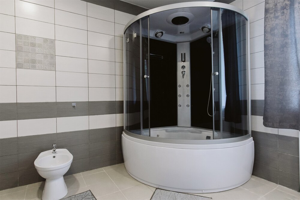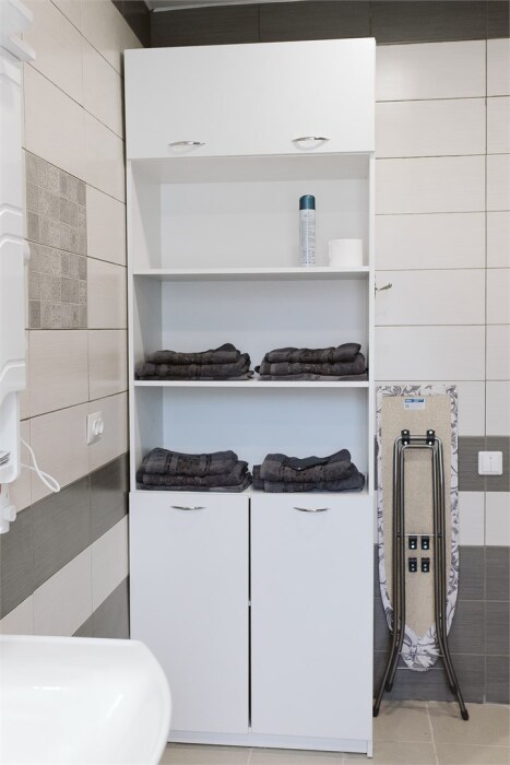 Ванная комната: большая душевая кабина, бидэ, раковина, туалет; набор гигиены, фен для волос. Гладильная доска, сушилка для белья.