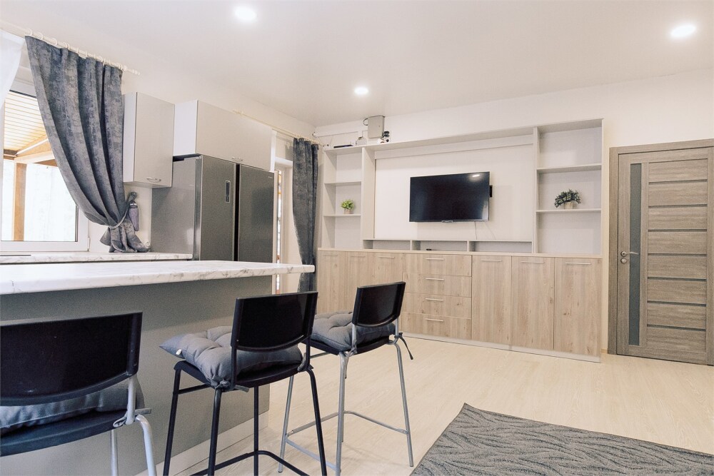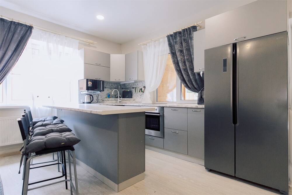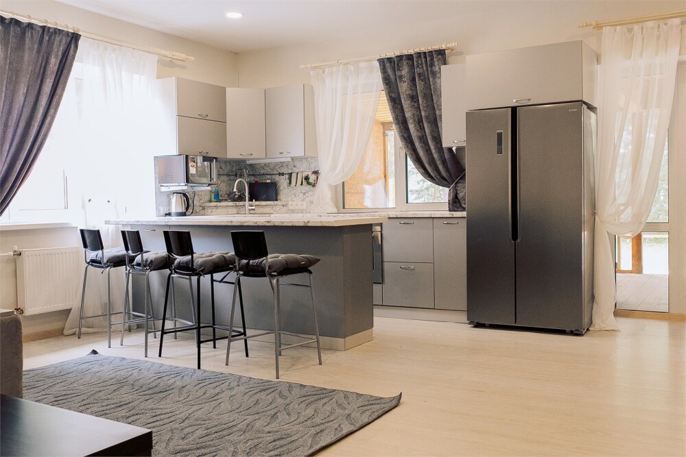 Кухонная зона: барная стойка, стулья, большой холодильник, плита для приготовления пищи, духовка, микроволновая печь, чайник, комплект посуды.
