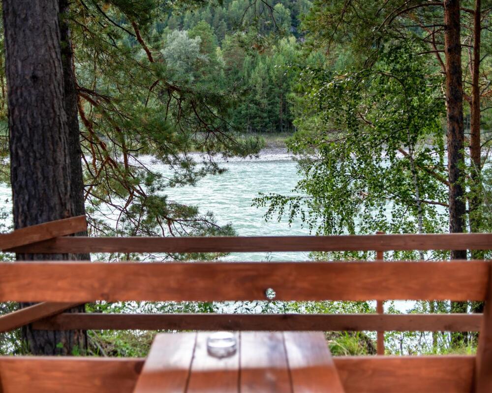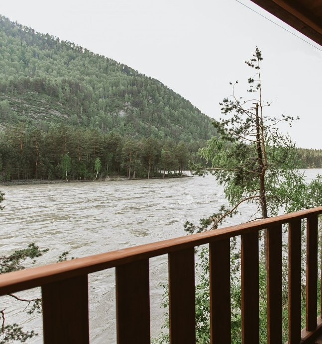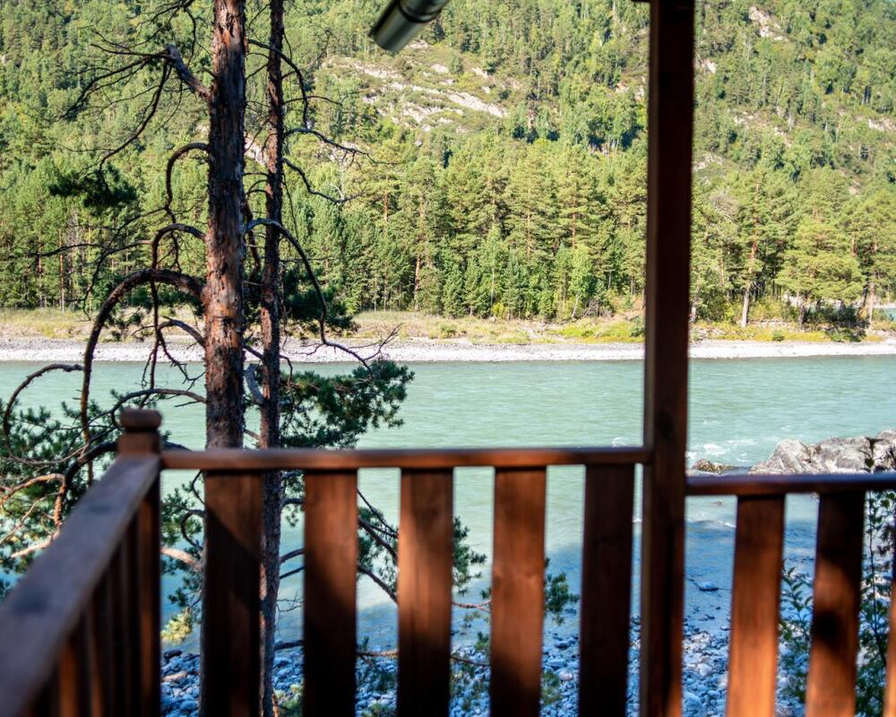 Собственная просторная терраса с видом на берег и горы. Несколько метров от реки Катунь.