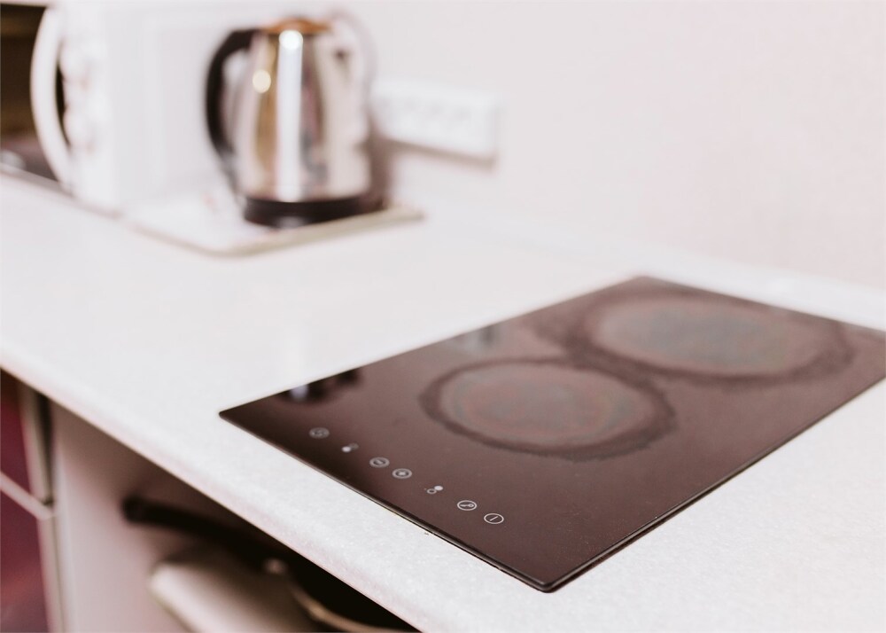 Кухонная зона: холодильник, плита для приготовления пищи, микроволновая печь, чайник, комплект посуды.
