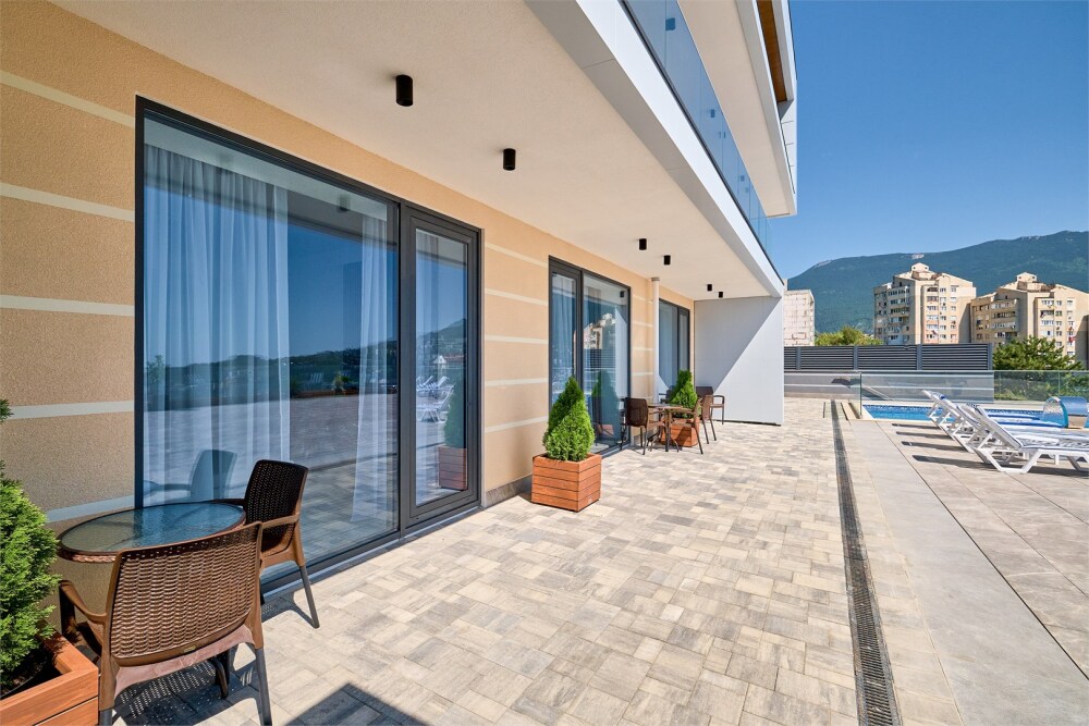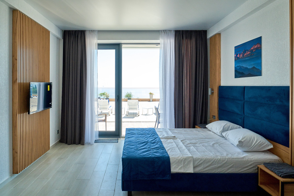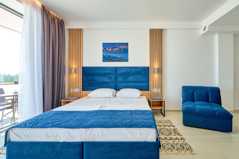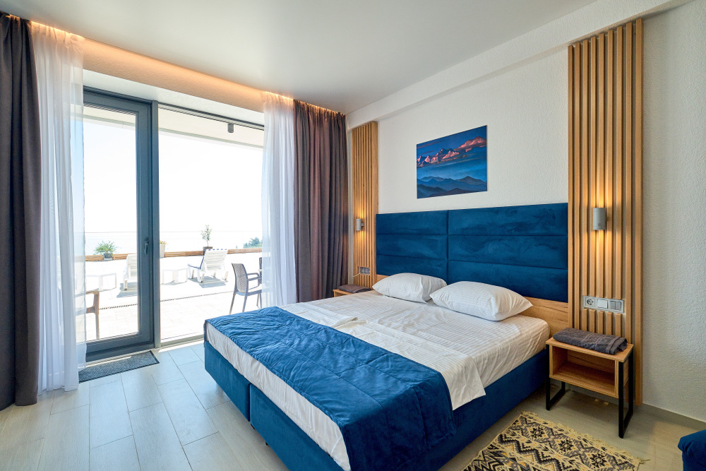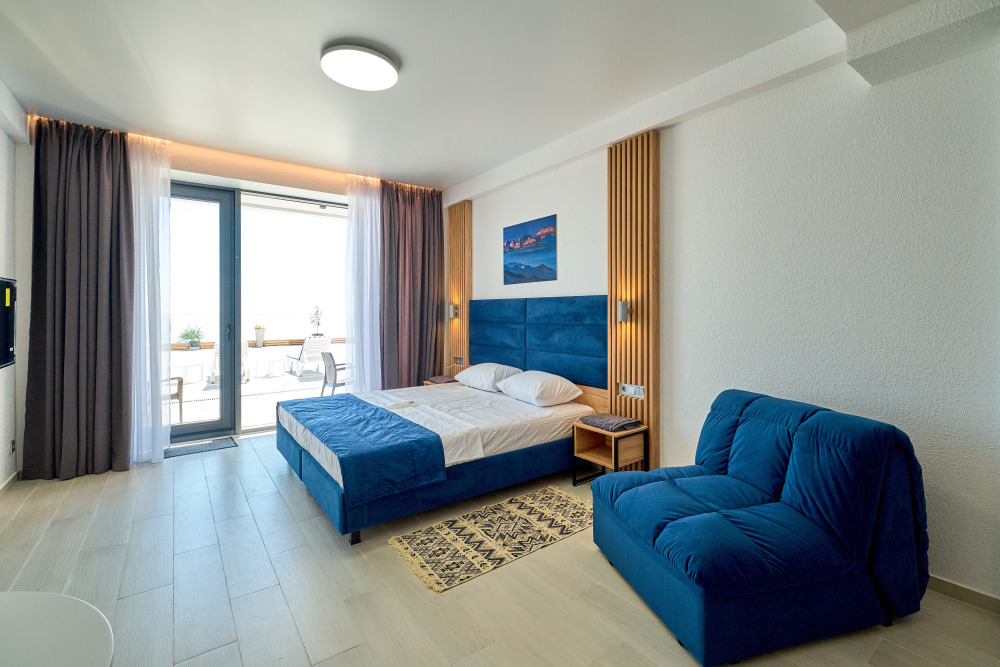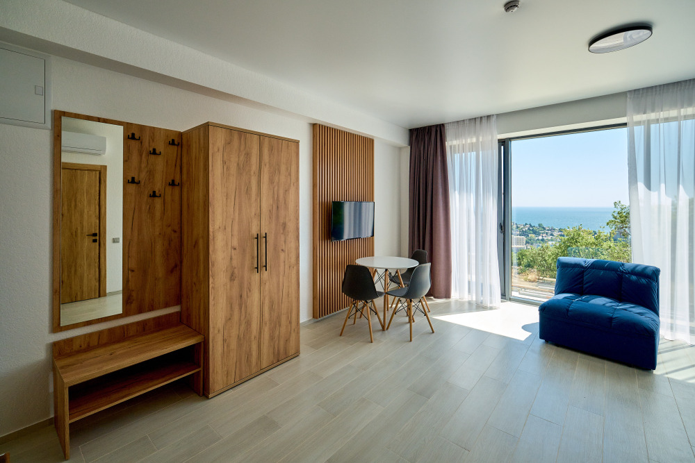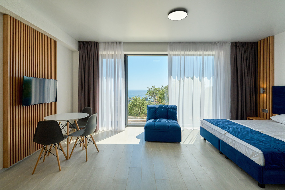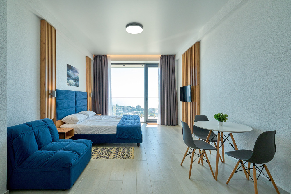 Парящая над морем стильная студия с закрытой территорией, с панорамным остеклением и балконом, выходящим на море и город.